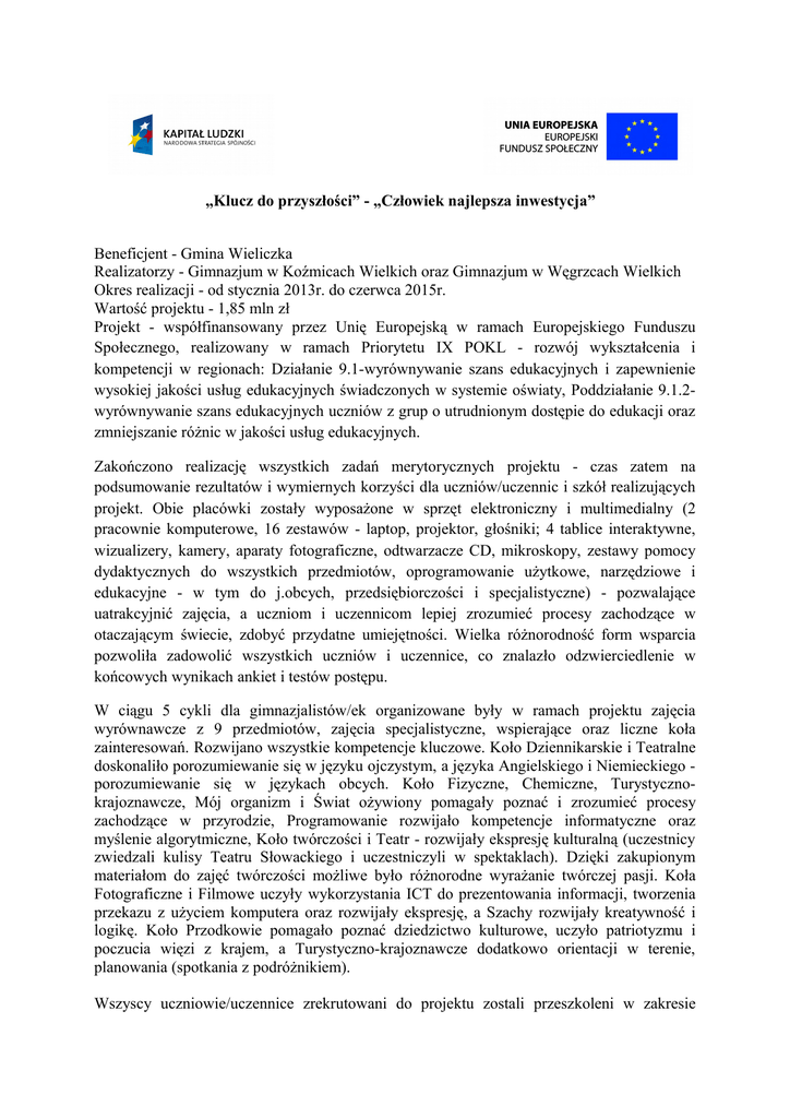 „Klucz do przyszłości” - „Człowiek najlepsza inwestycja” Beneficjent - Gmina Wieliczka Realizatorzy - Gimnazjum w Koźmicach Wielkich oraz Gimnazjum w Węgrzcach Wielkich Okres realizacji - od stycznia 2013r. do czerwca 2015r. Wartość projektu - 1,85 mln zł Projekt - współfinansowany przez Unię Europejską w ramach Europejskiego Funduszu Społecznego, realizowany w ramach Priorytetu IX POKL - rozwój wykształcenia i kompetencji w regionach: Działanie 9.1-wyrównywanie szans edukacyjnych i zapewnienie wysokiej jakości usług edukacyjnych świadczonych w systemie oświaty, Poddziałanie 9.1.2wyrównywanie szans edukacyjnych uczniów z grup o utrudnionym dostępie do edukacji oraz zmniejszanie różnic w jakości usług edukacyjnych. Zakończono realizację wszystkich zadań merytorycznych projektu - czas zatem na podsumowanie rezultatów i wymiernych korzyści dla uczniów/uczennic i szkół realizujących projekt. Obie placówki zostały wyposażone w sprzęt elektroniczny i multimedialny (2 pracownie komputerowe, 16 zestawów - laptop, projektor, głośniki; 4 tablice interaktywne, wizualizery, kamery, aparaty fotograficzne, odtwarzacze CD, mikroskopy, zestawy pomocy dydaktycznych do wszystkich przedmiotów, oprogramowanie użytkowe, narzędziowe i edukacyjne - w tym do j.obcych, przedsiębiorczości i specjalistyczne) - pozwalające uatrakcyjnić zajęcia, a uczniom i uczennicom lepiej zrozumieć procesy zachodzące w otaczającym świecie, zdobyć przydatne umiejętności. Wielka różnorodność form wsparcia pozwoliła zadowolić wszystkich uczniów i uczennice, co znalazło odzwierciedlenie w końcowych wynikach ankiet i testów postępu. W ciągu 5 cykli dla gimnazjalistów/ek organizowane były w ramach projektu zajęcia wyrównawcze z 9 przedmiotów, zajęcia specjalistyczne, wspierające oraz liczne koła zainteresowań. Rozwijano wszystkie kompetencje kluczowe. Koło Dziennikarskie i Teatralne doskonaliło porozumiewanie się w języku ojczystym, a języka Angielskiego i Niemieckiego porozumiewanie się w językach obcych. Koło Fizyczne, Chemiczne, Turystycznokrajoznawcze, Mój organizm i Świat ożywiony pomagały poznać i zrozumieć procesy zachodzące w przyrodzie, Programowanie rozwijało kompetencje informatyczne oraz myślenie algorytmiczne, Koło twórczości i Teatr - rozwijały ekspresję kulturalną (uczestnicy zwiedzali kulisy Teatru Słowackiego i uczestniczyli w spektaklach). Dzięki zakupionym materiałom do zajęć twórczości możliwe było różnorodne wyrażanie twórczej pasji. Koła Fotograficzne i Filmowe uczyły wykorzystania ICT do prezentowania informacji, tworzenia przekazu z użyciem komputera oraz rozwijały ekspresję, a Szachy rozwijały kreatywność i logikę. Koło Przodkowie pomagało poznać dziedzictwo kulturowe, uczyło patriotyzmu i poczucia więzi z krajem, a Turystyczno-krajoznawcze dodatkowo orientacji w terenie, planowania (spotkania z podróżnikiem). Wszyscy uczniowie/uczennice zrekrutowani do projektu zostali przeszkoleni w zakresie Bezpieczeństwa w sieci i profilaktyki uzależnień, a trzy roczniki trzecioklasistów uzyskały wsparcie w czasie przygotowań do egzaminu gimnazjalnego. Odbyły się też spotkania grupowe i indywidualne z doradcą zawodowym. W ramach indywidualnych spotkań z doradcą, przeanalizowane zostały wykonane przez trzy roczniki trzecioklasistów/ek testy preorientacji zawodowej i utworzone karty doradztwa zawodowego ze wskazaniem predyspozycji zawodowych oraz planu kształcenia i kariery zawodowej. Dziewczęta i chłopcy uczestniczyli w szkoleniach ECDL oraz mieli możliwość zdobycia w utworzonych szkolnych Laboratoriach ECDL pierwszych w życiu certyfikatów (Certyfikaty ECDL PTI Profile Standard), którymi mogą pochwalić się przyszłemu pracodawcy. W okresie realizacji projektu Certyfikat uzyskało 90 uczniów/uczennic. Od stycznia 2013 do czerwca 2015r. odbyły się 3 wyjazdy edukacyjne do Warszawy których celem było zwiedzanie zabytków stolicy, poznanie narodowego dziedzictwa kulturowego, rozwijanie kompetencji obywatelskich, naukowo-technicznych, a także zasad funkcjonowania technologii oraz rozwój umiejętności ich zastosowania. W Warszawie 540 uczniów i uczennic zwiedziło: Muzeum Powstania Warszawskiego, Centrum Nauki Kopernik, Sejm i Senat, Stare Miasto wraz z zabytkami, Łazienki Królewskie, Powązki, Grób Nieznanego Żołnierza, Bibliotekę UW wraz z Parkiem Fontann, Zamek Królewski, Plac Defilad, PKiN. Dwa roczniki klas pierwszych (360 osób) brały udział w 3 dniowych integracyjnych wyjazdach w góry, w czasie których poznali też metody motywacji i skutecznego uczenia się. 540 gimnazjalistów/ek wzięło udział w wyjeździe „Szlakiem Tradycyjnego Rzemiosła”. Zwiedzili Suchą Beskidzką, brali udział w warsztatach rękodzieła artystycznego w Stryszawie; poznali tradycyjne i rzadkie zawody, rozwijali świadomość i ekspresję kulturalną. Uczniowie z trzech roczników klas II wzięli udział w 24 wyjazdach do zakładów pracy: telewizji, banku, drukarni, Oknoplastu, piekarni w celu poznania specyfiki różnych zawodów. W czasie wyjazdów do Muzeum Schindlera i Muzeum w Oświęcimiu 540 uczniów/uczennic poznało dziedzictwo kulturowe i smutną, przejmującą historię naszego kraju. Wszyscy uczniowie w czasie zajęć i wyjazdów mieli zapewnione bezpłatne posiłki, noclegi, transport, bilety wstępu. Po zajęciach autobusy odwoziły ich do domu. Realizacja projektu z pewnością umożliwiła w pełni osiągnąć zaplanowane cele. Pozwoliła wyrównać szanse edukacyjne młodzieży wiejskiej, umożliwiła im zdobycie dodatkowej wiedzy i umiejętności rozwijających kompetencje kluczowe oraz ułatwiające pokonywanie trudności i wybór ścieżki zawodowej, co z pewnością zaowocuje ich lepszą przyszłością.