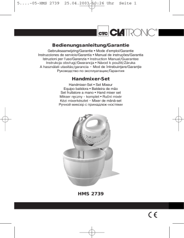 5....-05-HMS 2739 25.04.2003 10:26 Uhr Seite 1 R Bedienungsanleitung/Garantie Gebruiksaanwijzing/Garantie • Mode d’emploi/Garantie Instrucciones de servicio/Garantía • Manual de instruções/Garantia Istruzioni per l’uso/Garanzia • Instruction Manual/Guarantee Instrukcja obsługi/Gwarancja • Návod k použití/Záruka A használati utasítás/garancia • Mod de întrebuinflare/Garanflie Руководство по эксплуатации/Гарантия Handmixer-Set Handmixer-Set • Set Mixeur Equipo batidora • Batdeira de mão Set frullatore a mano • Hand mixer set Mikser ręczny - komplet • Ruční mixér Kézi mixerkészlet • Mixer de mânæ-set Ручной миксер с принадлеж-ностями HMS 2739 5....-05-HMS 2739 25.04.2003 10:26 Uhr Seite 2 Inhalt D NL F E P I GB PL CZ H RO RUS Inhoud • Sommaire • Indice • Índice • Indice Contents • Spis treści • Obsah • Tartalom • Conflinut • Содержание Übersicht Bedienelemente . . . . . . . . . . . . . . . . . . . . . . . . . .Seite Bedienungsanleitung . . . . . . . . . . . . . . . . . . . . . . . . . . . . . . .Seite Garantie . . . . . . . . . . . . . . . . . . . . . . . . . . . . . . . . . . . . . . . .Seite Overzicht bedieningselementen . . . . . . . . . . . . . . . . . . . . . .Pagina Gebruiksaanwijzing . . . . . . . . . . . . . . . . . . . . . . . . . . . . . . . .Pagina Garantie . . . . . . . . . . . . . . . . . . . . . . . . . . . . . . . . . . . . . . . .Pagina Aperçu des éléments de commande . . . . . . . . . . . . . . . . . . .Page Mode d’emploi . . . . . . . . . . . . . . . . . . . . . . . . . . . . . . . . . . .Page Garantie . . . . . . . . . . . . . . . . . . . . . . . . . . . . . . . . . . . . . . . .Page Vista de conjunto Elementos de mando . . . . . . . . . . . . . . . .Página Instrucciones de servicio . . . . . . . . . . . . . . . . . . . . . . . . . . . .Página Garantia . . . . . . . . . . . . . . . . . . . . . . . . . . . . . . . . . . . . . . . .Página Vista geral dos elemntos de comando . . . . . . . . . . . . . . . . .Página Manual de instruções . . . . . . . . . . . . . . . . . . . . . . . . . . . . . .Página Garantía . . . . . . . . . . . . . . . . . . . . . . . . . . . . . . . . . . . . . . . .Página Descrizione dei singoli pezzi . . . . . . . . . . . . . . . . . . . . . . . .Pagina Istruzioni per l’uso . . . . . . . . . . . . . . . . . . . . . . . . . . . . . . . . .Pagina Garanzia . . . . . . . . . . . . . . . . . . . . . . . . . . . . . . . . . . . .Pagina Control element overview . . . . . . . . . . . . . . . . . . . . . . . . . . .Page Instruction Manual . . . . . . . . . . . . . . . . . . . . . . . . . . . . . . . . .Page Guarantee . . . . . . . . . . . . . . . . . . . . . . . . . . . . . . . . . . . . . .Page Przegląd elemetów obsługi . . . . . . . . . . . . . . . . . . . . . . . . .Strona Instrukcja obsługi . . . . . . . . . . . . . . . . . . . . . . . . . . . . . . . .Strona Gwarancja . . . . . . . . . . . . . . . . . . . . . . . . . . . . . . . . . . .Strona Přehled obsluhovací prvky . . . . . . . . . . . . . . . . . . . . . . . . . .Strana Návod k použití . . . . . . . . . . . . . . . . . . . . . . . . . . . . . . . . . .Strana Záruka . . . . . . . . . . . . . . . . . . . . . . . . . . . . . . . . . . . . .Strana A hasznalt elemek megtekintése . . . . . . . . . . . . . . . . . . . . .Oldal A hasznalati utasítás . . . . . . . . . . . . . . . . . . . . . . . . . . . . . .Oldal Garancia . . . . . . . . . . . . . . . . . . . . . . . . . . . . . . . . . . . . . . . .Oldal Privire de ansamblu al modului de întrebuinflare . . . . . . . .Paginæ Mod de întrebuinflare . . . . . . . . . . . . . . . . . . . . . . . . . . . . . .Paginæ Garanflie . . . . . . . . . . . . . . . . . . . . . . . . . . . . . . . . . . . . . .Paginæ Обзор управляющих элементов . . . . . . . . . . . . . . . . . . . .стр. Руководство по эксплуатации . . . . . . . . . . . . . . . . . . . . . .стр. Гарантия . . . . . . . . . . . . . . . . . . . . . . . . . . . . . . . . . . . . . . . . .стр. 3 4 6 3 8 11 3 12 15 3 16 19 3 20 23 3 24 27 3 28 31 3 32 35 3 37 40 3 41 44 3 45 48 3 49 52 5....-05-HMS 2739 25.04.2003 10:26 Uhr Seite 3 Übersicht über die Bedienelemente 1 2 3 4 5 6 Handmixer Knopf zum Lösen der Knethaken Stufenwahlschalter (6 Stufen) TURBO- Taste Bewegliches Oberteil Lasche zur Entriegelung des Oberteils 7 8 9 10 11 12 Drehteller für Rührschüssel Rührschüssel Schnellmixstab Knethaken Mixständer Lasche zum Lösen des Mixers 3 5....-05-HMS 2739 25.04.2003 10:26 Uhr Seite 4 Allgemeine Sicherheitshinweise D • • • • • • • • • Lesen Sie vor Inbetriebnahme dieses Gerätes die Bedienungsanleitung sehr sorgfältig durch und bewahren Sie diese inkl. Garantieschein, Kassenbon und nach Möglichkeit den Karton mit Innenverpackung gut auf. Benutzen Sie das Gerät ausschließlich für den privaten und den dafür vorgesehenen Zweck. Dieses Gerät ist nicht für den gewerblichen Gebrauch bestimmt. Benutzen Sie es nicht im Freien (außer es ist für den bedingten Einsatz im Freien vorgesehen). Halten Sie es vor Hitze, direkter Sonneneinstrahlung, Feuchtigkeit (auf keinen Fall in Flüssigkeiten tauchen) und scharfen Kanten fern. Benutzen Sie das Gerät nicht mit feuchten Händen. Bei feucht oder nass gewordenem Gerät sofort den Netzstecker ziehen. Nicht ins Wasser greifen. Schalten Sie das Gerät aus und ziehen Sie immer den Stecker aus der Steckdose (ziehen Sie am Stecker, nicht am Kabel) wenn Sie das Gerät nicht benutzen, Zubehörteile anbringen, zur Reinigung oder bei Störung. Betreiben Sie das Gerät nicht unbeaufsichtigt. Sollten Sie den Arbeitsplatz verlassen, schalten Sie das Gerät bitte immer aus, bzw. ziehen Sie den Stecker aus der Steckdose (ziehen Sie am Stecker, nicht am Kabel). Um Kinder vor Gefahren elektrischer Geräte zu schützen, sorgen Si