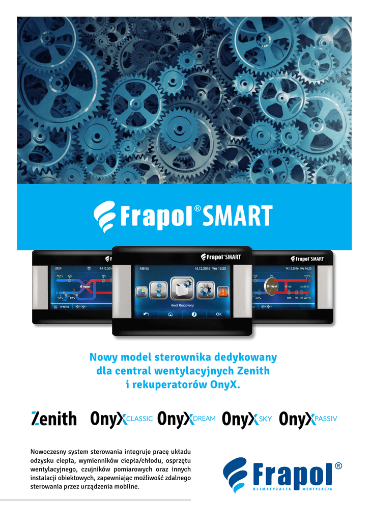 Nowy model sterownika dedykowany dla central wentylacyjnych Zenith i rekuperatorów OnyX. Nowoczesny system sterowania integruje pracę układu odzysku ciepła, wymienników ciepła/chłodu, osprzętu wentylacyjnego, czujników pomiarowych oraz innych instalacji obiektowych, zapewniając możliwość zdalnego sterowania przez urządzenia mobilne. Podstawowe cechy sterownika Pełen podgląd parametrów pracy rekuperatora na kolorowym ekranie dotykowym – wizualizacja pracy całego systemu wentylacyjnego. ecoNET Monitoring jakości powietrza – temperatura, wilgotność, stężenie gazów. Aktualizacja oprogramowania poprzez kartę SD. GWC Integracja z systemem BMS, dzięki protokołowi komunikacyjnemu Modbus RTU. Współpraca z gruntowym wymiennikiem ciepła (GWC). Współpraca z kanałowymi nagrzewnicami i chłodnicami. Opcja zdalnego dostępu z dowolnego miejsca na świecie za pomocą komputera, tabletu czy telefonu komórkowego – moduł ecoNET. % Kompleksowa regulacja stopnia wykorzystania odzysku ciepła. Pozostałe funkcje • Obsługa dodatkowej komory mieszania, • Automatyczne odszranianie wymiennika ciepła, funkcje cyklicznego czyszczenia wymiennika i definiowania sposobu jego pracy, • Automatyczny free-cooling, • Współpraca z okapami kuchennymi, centralami alarmowymi, systemami przeciwpożarowymi i innymi instalacjami budynkowymi, • Predefiniowane tryby pracy, m.in. tryb przewietrzania, otwartych okien, imprezy, czy różnicowania poziomu ciśnień w pomieszczeniach (regulacja prędkości obrotowych wentylatora nawiewnego, wywiewnego względem siebie), • Możliwość tworzenia własnych trybów pracy centrali, • Dedykowane tryby pracy do współpracy z kominkami oraz okapem kuchennym, • Kompleksowa obsługa tygodniowego harmonogramu pracy, • Odczyt i archiwizacja zdarzeń alarmowych, • Płynna kontrola wydatku powietrza systemu wentylacyjnego w zakresie 25-100%, • Sterowanie temperaturą zadaną, • Obliczanie ilości energii odzyskanej przez rekuperator, • Automatyczne powiadomienia o zalecanych przeglądach technicznych, • Wielostopniowa, a zarazem intuicyjna struktura menu w języku polskim i angielskim. jest w pełni kompatybilny z innymi systemami Automatyki Frapol, m.in. FRAPOL Sp. z o.o. ul. Mierzeja Wiślana 8, 30-832 Kraków tel. [+48] 12 653 27 66, [+48] 12 659 05 77 fax [+48] 12 653 27 89 [email protected] WWW.FRAPOL.COM.PL