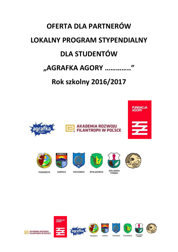 OFERTA DLA PARTNERÓW LOKALNY PROGRAM STYPENDIALNY DLA STUDENTÓW „AGRAFKA AGORY …………..” Rok szkolny 2016/2017 O Lokalnym Programie Stypendialnym dla Studentów „Agrafka Agory” Celem Programu Stypendialnego dla Studentów „Agrafka Agory” jest: wspieranie studentów szczególnie uzdolnionych i znajdujących się w trudniejszej sytuacji materialnej, wzmacnianie więzi społecznych młodych ludzi z regionem oraz gminą lub miastem z którego pochodzą, zaangażowanie młodych ludzi w działania na rzecz naszego całego obszaru LGD oraz gmin/miast. To pierwszy tego rodzaju konkurs stypendialny organizowany przez LGD Partnerstwo Ducha Gór oraz samorządy partnerskie. Założeniem rozpoczęcia budowania funduszu, przy udziale środków Akademii Rozwoju Filantropii, jest zbudowanie Funduszu Stypendialnego, który stanie się stałym elementem rozwoju filantropii, a równocześnie tworzeniem dobrego klimatu i zachęty do powrotu młodych ludzi do „małej ojczyzny”, związania z regionem wykształconych kadr. Stypendium jest przyznawane w drodze konkursu. O stypendium mogą się ubiegać studenci dziennych studiów magisterskich, realizowanych w trybie jednolitym lub dwustopniowym, w polskich uczelniach, będący stałymi mieszkańcami obszaru LGD/gmin uczestniczących w Programie oraz posiadający wysokie wyniki w nauce. Jednak o przyznaniu stypendium będzie decydowała nie tylko średnia ocen, ale również dochód na osobę w rodzinie, aktywność społeczna i dodatkowe osiągnięcia naukowe. Zasady i szczegóły zawarte zostały w Regulaminie. Wyboru stypendystów dokonuje powoływana przez LGD Komisja Stypendialna, składająca się z osób reprezentujących samorządy partnerskie, uczelnie wyższe, lokalnych przedsiębiorców, lokalne organizacje pozarządowe oraz LGD. Sponsor może również znaleźć się w gronie Komisji Stypendialnej. Z każdym stypendystą podpisywana jest umowa, w której stypendysta staje się ambasadorem regionu oraz zobowiązany będzie do działań na rzecz obszaru oraz gminy, z której pochodzi. Przewiduje się również stypendium specjalne i stypendium fundowane – przyznawane w szczególnych przypadkach i sytuacjach losowych, nie objętych kryterium niniejszego regulaminu lub na wniosek fundatora (dedykowane), ze wskazaniem odbiorcy stypendium, bez konieczności spełnienia przez niego kryteriów. Tego rodzaju stypendia będą finansowane w całości przez danego fundatora. Wysokość stypendium to 380 zł miesięcznie, przez okres 9-ciu miesięcy, od października 2016 do czerwca 2017 r. Łączna wysokość 1 stypendium to 3.420 zł. W przypadku zebrania większych środków, wysokość stypendium może zostać podniesiona lub może zostać przyznana większa liczba stypendiów. Decyzję w tym zakresie podejmie zarząd LGD w porozumieniu z Komisją Stypendialną i partnerami. Organizator Lokalnego Programu Stypendialnego „Agrafka Agory” Pomysłodawcą i organizatorem Lokalnego Programu Stypendialnego jest Lokalna Grupa Działania Partnerstwo Ducha Gór oraz 5 lokalnych samorządów: Podgórzyn, Karpacz, Piechowice, Mysłakowice oraz Szklarska Poręba. Lokalna Grupa Działania (LGD) to stowarzyszenie zrzeszające aktywnych przedstawicieli regionu i lokalnych liderów, reprezentujących przedstawicieli samorządów, lokalnych przedsiębiorców oraz organizacji pozarządowych. Kim jest LGD Partnerstwo Ducha Gór? Zajmujemy się rozwojem lokalnym kierowanym przez społeczność (RLKS) na rzecz dobra wspólnego. LGD czyli Lokalna Grupa Działania to forma prawna, która umożliwia zrzeszanie również podmiotów prawnych tj. samorządy lokalne, firmy, organizacje oraz umożliwia dysponowanie środkami finansowymi z PROW 2014-2020 (Program Rozwoju Obszarów Wiejskich finansowany z Unii Europejskiej) z przeznaczeniem na rozwój przedsiębiorczości, inwestycje w gminach oraz inwestycje w rozwój społeczny. Wierzymy w to co robimy i zależy nam na zmienianiu tych elementów rzeczywistości, na które możemy mieć wpływ. Zrobiliśmy w regionie wiele rzeczy innowacyjnych, społecznych, budujemy ciągle partnerstwo z podmiotami publicznymi i prywatnymi. Po 12 latach funkcjonowania możemy śmiało powiedzieć, że jesteśmy podmiotem zaufania społecznego. Można się do nas przyłączyć, np. poprzez zostanie Partnerem Programu Stypendialnego. Partnerzy Lokalnego Programu Stypendialnego „Agrafka Agory” Parterami Programu są: Akademia Rozwoju Filantropii w Polsce i Fundacja Agory. Partnerem Programu mogą zostać również inne samorządy lokalne, osoby prywatne, firmy, inne organizacje pozarządowe. Oferta dla Partnera Lokalnego Programu Stypendialnego „Agrafka Agory”: Mamy nadzieję na Państwa zainteresowanie dołączeniem do grona podmiotów wspierających zdolną młodzież z naszego regionu. Poniżej przedstawiamy ofertę dla partnerów Lokalnego Programu Stypendialnego. Załącznikiem do niniejszego pisma jest także opis doświadczenia LGD Partnerstwo Ducha Gór oraz Regulamin Funduszu Stypendialnego, regulujący warunki otrzymania wsparcia. Pakiet Wspierający Program – 1000 zł uzyskanie tytułu Partnera Wspierającego Program Stypendialny umieszczenie znaku firmowego partnera na stronie internetowej LGD Partnerstwo Ducha Gór wraz z łączami do wskazanej strony internetowej, wymienianie partnera w artykułach promocyjnych zamieszczanych w prasie, innych mediach, mediach społecznościowych, stronach www, z wyróżnieniem przysługującego mu tytułu, dyplom pamiątkowy, koszulka i kubek Lokalnego Programu Stypendialnego. Pakiet Srebrny - 2.000 zł tytuł Srebrnego Partnera Lokalnego Programu Stypendialnego, umieszczenie znaku firmowego partnera na stronie internetowej LGD Partnerstwo Ducha Gór, wraz z łączami do wskazanej strony internetowej, umieszczenie nazwy partnera w artykułach promocyjnych zamieszczanych w prasie, innych mediach, mediach społecznościowych, stronach www , z wyróżnieniem przysługując