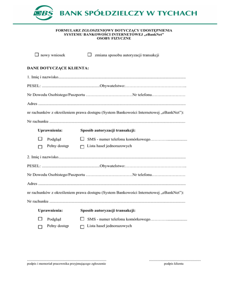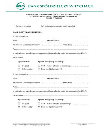 FORMULARZ ZGŁOSZENIOWY DOTYCZĄCY UDOSTĘPNIENIA SYSTEMU BANKOWOŚCI INTERNETOWEJ „eBankNet” OSOBY FIZYCZNE nowy wniosek zmiana sposobu autoryzacji transakcji DANE DOTYCZĄCE KLIENTA: 1. Imię i nazwisko......................................................................................................................... PESEL: .......................................................Obywatelstwo:…………………………………….. Nr Dowodu Osobistego/Paszportu ……………………………Nr telefonu…………………… Adres ............................................................................................................................................ nr rachunków z określeniem prawa dostępu (System Bankowości Internetowej „eBankNet”): Nr rachunku ................................................................................................................................. Uprawnienia: Sposób autoryzacji transakcji: Podgląd SMS - numer telefonu komórkowego…………................... Pełny dostęp Lista haseł jednorazowych 2. Imię i nazwisko......................................................................................................................... PESEL: .......................................................Obywatelstwo:…………………………………….. Nr Dowodu Osobistego/Paszportu ……………………………Nr telefonu…………………… Adres ............................................................................................................................................ nr rachunków z określeniem prawa dostępu (System Bankowości Internetowej „eBankNet”): Nr rachunku ................................................................................................................................. Uprawnienia: Sposób autoryzacji transakcji: Podgląd SMS - numer telefonu komórkowego…………................... Pełny dostęp Lista haseł jednorazowych ..................................................................... podpis i memoriał pracownika przyjmującego zgłoszenie ............................................. podpis klienta