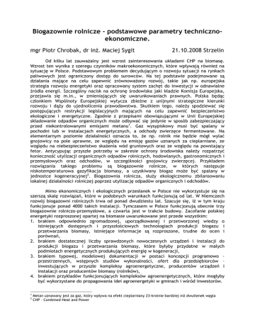 Biogazownie rolnicze - podstawowe parametry technicznoekonomiczne. mgr Piotr Chrobak, dr inż. Maciej Sygit 21.10.2008 Strzelin Od kilku lat zauważalny jest wzrost zainteresowania układami CHP na biomasę. Wzrost ten wynika z szeregu czynników makroekonomicznych, które wpływają również na sytuację w Polsce. Podstawowym problemem decydującym o rozwoju sytuacji na rynkach paliwowych jest ograniczony dostęp do surowców. Na tej podstawie podejmowane są działania mające na celu zapewnić zrównoważony rozwój, takie jak np. europejska strategia rozwoju energetyki oraz opracowany system zachęt do inwestycji w odnawialne źródła energii. Szczególny nacisk na ochronę środowiska jaki kładzie Komisja Europejska, przejawia się m.in., w zmieniających się uwarunkowaniach prawnych. Polska będąc członkiem Wspólnoty Europejskiej wytycza zbieżne z unijnymi strategiczne kierunki rozwoju i dąży do ujednolicenia prawodawstwa. Skutkiem tego, należy spodziewać się postępujących restrykcji legislacyjnych mających na celu zapewnić bezpieczeństwo ekologiczne i energetyczne. Zgodnie z przepisami obowiązującymi w Unii Europejskiej składowanie odpadów organicznych może odbywać się jedynie w sposób zabezpieczający przed niekontrolowanymi emisjami metanu1. Gaz wysypiskowy musi być spalany w pochodni lub w instalacjach energetycznych, a odchody zwierzęce fermentowane. Na elementarnym poziomie działalności oznacza to, że np. rolnik nie będzie mógł wylać gnojowicy na pole uprawne, ze względu na emisję gazów uznanych za cieplarniane, ze względu na niebezpieczeństwo skażenia wód gruntowych oraz ze względu na powstający fetor. Antycypując przyszłe potrzeby w zakresie ochrony środowiska należy rozpatrzyć konieczność utylizacji organicznych odpadów rolniczych, hodowlanych, gastronomicznych i przemysłowych oraz odchodów, w szczególności gnojowicy zwierzęcej. Przykładem rozwiązania takiego problemu są biogazownie rolnicze, w których następuje niskotemperaturowa gazyfikacja biomasy, a uzyskiwany biogaz może być spalany w jednostce kogeneracyjnej2. Biogazownia rolnicza, służy ekologicznemu zbilansowaniu lokalnej działalności rolniczej poprzez utylizację odpadów organicznych i odchodów. Mimo ekonomicznych i ekologicznych przesłanek w Polsce nie wykorzystuje się na szerszą skalę rozwiązań, które w podobnych warunkach funkcjonują od lat. W Niemczech rozwój biogazowni rolniczych trwa od ponad dwudziestu lat. Szacuje się, iż w tym kraju funkcjonuje ponad 4000 takich instalacji. Tymczasem w Polsce funkcjonują obecnie trzy biogazownie rolniczo-przemysłowe, a czwarta jest w trakcie budowy. Zacofanie polskiej energetyki rozproszonej opartej na biomasie uwarunkowane jest przede wszystkim: 1. brakiem odpowiednio zgromadzonej, uporządkowanej i przetworzonej wiedzy o istniejących dostępnych i przyszłościowych technologiach produkcji biogazu i przetwarzania biomasy, istniejące informacje są rozproszone, trudne do ocen i porównań, 2. brakiem dostatecznej liczby sprawdzonych nowoczesnych urządzeń i instalacji do produkcji biogazu i przetwarzania biomasy, które byłyby przydatne w małych podmiotach energetycznych produkujących energię w kogeneracji, 3. brakiem typowej, modelowej dokumentacji w postaci koncepcji programowo przestrzennych, wstępnych studiów wykonalności, ofert dla przedsiębiorców – inwestujących w przyszłe kompleksy agroenergetyczne, producentów urządzeń i instalacji oraz producentów biomasy (rolników), 4. brakiem przykładów funkcjonujących kompleksów agroenergetycznych, które mogłyby być wykorzystane do propagowania idei agroenergetyki w gminach i wśród inwestorów. 1 2 Metan uznawany jest za gaz, który wpływa na efekt cieplarniany 23-krotnie bardziej niż dwutlenek węgla CHP – Combined Heat and Power Potencjalny inwestor, który podjąłby się finansowania budowy biogazowni rolniczej w Polsce, musiałby odpowiedzieć sobie na wiele pytań, aby ograniczyć błąd przy szacowaniu efektywności ekonomicznej instalacji. Brak praktycznych przykładów powoduje konieczność odwoływania się do modelów teoretycznych. W ujęciu modelowym jednostka kogeneracyjna jest systemem technicznoorganizacyjnym, który z zewnątrz rozważany jest jako spójna całość. System ten przekształca strumień wejścia w strumień wyjścia. Pojmując biogazownię rolniczą w ten sposób inwestor nie jest zainteresowany technologią transformacji – interesuje go jedynie formuła, która jest względnie stała. Można stwierdzić, iż przy zadanych parametrach surowca i znanej formule transformacji (np. sprawność konwersji w energię elektryczną) inwestor jest w stanie obliczyć ilość uzyskanej energii. W niniejszym opracowaniu przedstawiono podstawowe parametry techniczno-ekonomiczne budowy (faza nakładów inwestycyjnych) i funkcjonowania (faza eksploatacji) biogazowni rolniczej. Nakłady inwestycyjne to suma kosztów poniesionych na całość prac projektowych, doradczych, prawnych i budowlanych, jakie należy ponieść celem uruchomienia biogazowni. Koszt budowy biogazowni rolniczej jest kosztem zależnym od dwóch czynników: od elektrycznej mocy zainstalowanej (wprost proporcjonalnie) oraz od odległości instalacji od Głównego Punktu Zasilania (wprost proporcjonalnie). Teraźniejsze oferty cenowe producentów niemieckich określają następujący przedział kosztów w zależności od zainstalowanej mocy: 2800 [€/kWel], w przypadku instalacji rzędu 1 [MWel] oraz 3200 [€/kWel], w przypadku instalacji rzędu 0,5 [MWel]. Z kolei odległość instalacji od Głównego Punktu Zasilania wpływa bezpośrednio na koszty przyłączenia biogazowni do sieci energetycznej. Zgodnie z brzmieniem ustawy3 odnawialne źródło energii, jak i również jednostka kogeneracji o mocy elektrycznej poniżej 5 [MW] ponosi koszt przyłączenia do sieci w wysokości połowy opłaty ustalonej na podstawie rzeczy
