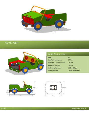 AUTO JEEP Dane techniczne Wiek 2-9 Wysokość urządzenia 128 cm Wymagana powierzchnia 20 m2 Wysokość upadku 40 cm Strefa bezpieczeństwa 500 x 435 cm Rodzaj podłoża AKANT patrz tabela nr.1 www.akant.waw.pl