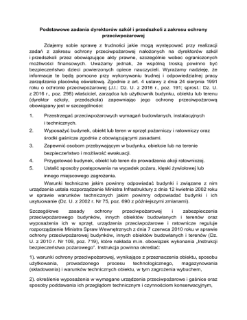 Podstawowe zadania dyrektorów szkół i przedszkoli z zakresu ochrony przeciwpożarowej Zdajemy sobie sprawę z trudności jakie mogą występować przy realizacji zadań z zakresu ochrony przeciwpożarowej nałożonych na dyrektorów szkół i przedszkoli przez obowiązujące akty prawne, szczególnie wobec ograniczonych możliwości finansowych. Uważamy jednak, że wspólną troską powinno być bezpieczeństwo dzieci powierzonych opiece nauczycieli. Wyrażamy nadzieję, że informacje te będą pomocne przy wykonywaniu trudnej i odpowiedzialnej pracy zarządzania placówką oświatową. Zgodnie z art. 4 ustawy z dnia 24 sierpnia 1991 roku o ochronie przeciwpożarowej (J.t.: Dz. U. z 2016 r., poz. 191; sprost.: Dz. U. z 2016 r., poz. 298) właściciel, zarządca lub użytkownik budynku, obiektu lub terenu (dyrektor szkoły, przedszkola) zapewniając jego ochronę przeciwpożarową obowiązany jest w szczególności: 1. Przestrzegać przeciwpożarowych wymagań budowlanych, instalacyjnych i technicznych. 2. Wyposażyć budynek, obiekt lub teren w sprzęt pożarniczy i ratowniczy oraz środki gaśnicze zgodnie z obowiązującymi zasadami. 3. Zapewnić osobom przebywającym w budynku, obiekcie lub na terenie bezpieczeństwo i możliwość ewakuacji. 4. Przygotować budynek, obiekt lub teren do prowadzenia akcji ratowniczej. 5. Ustalić sposoby postępowania na wypadek pożaru, klęski żywiołowej lub innego miejscowego zagrożenia. Warunki techniczne jakim powinny odpowiadać budynki i związane z nim urządzenia ustala rozporządzenie Ministra Infrastruktury z dnia 12 kwietnia 2002 roku w sprawie warunków technicznych jakim powinny odpowiadać budynki i ich usytuowanie (Dz. U. z 2002 r. Nr 75, poz. 690 z późniejszymi zmianami). Szczegółowe zasady ochrony przeciwpożarowej i zabezpieczenia przeciwpożarowego budynków, innych obiektów budowlanych i terenów oraz wyposażenia ich w sprzęt, urządzenia przeciwpożarowe i ratownicze reguluje rozporządzenie Ministra Spraw Wewnętrznych z dnia 7 czerwca 2010 roku w sprawie ochrony przeciwpożarowej budynków, innych obiektów budowlanych i terenów (Dz. U. z 2010 r. Nr 109, poz. 719), które nakłada m.in. obowiązek wykonania „Instrukcji bezpieczeństwa pożarowego”. Instrukcja powinna określać: 1). warunki ochrony przeciwpożarowej, wynikające z przeznaczenia obiektu, sposobu użytkowania, prowadzonego procesu technologicznego, magazynowania (składowania) i warunków technicznych obiektu, w tym zagrożenia wybuchem, 2). określenie wyposażenia w wymagane urządzenia przeciwpożarowe i gaśnice oraz sposoby poddawania ich przeglądom technicznym i czynnościom konserwacyjnym, sposób poddawania przeglądom technicznym i czynnościom konserwacyjnym stosowanych w obiekcie urządzeń przeciwpożarowych i gaśnic, 3). sposoby postępowania na wypadek pożaru i innego zagrożenia, 4). sposoby zabezpieczenia prac niebezpiecznych pod względem pożarowym, jeżeli takie prace są przewidywane, 5). warunki i organizację ewakuacji ludzi oraz praktyczne sposoby ich sprawdzania, 6). sposoby zapoznania użytkowników obiektu, w tym zatrudnionych pracowników, z przepisami przeciwpożarowymi oraz treścią przedmiotowej instrukcji, 7). zadania i obowiązki w zakresie ochrony przeciwpożarowej dla osób będących ich stałymi użytkownikami, 8). plany obiektów, obejmujące także ich usytuowanie, oraz terenu przyległego, z uwzględnieniem graficznych danych dotyczących w szczególności: a). powierzchni, wysokości i liczby kondygnacji budynku, b). odległości od obiektów sąsiednich, c). parametrów pożarowych występujących substancji palnych, d). występującej gęstości obciążenia ogniowego w strefie pożarowej lub w strefach pożarowych, e). kategorii zagrożenia ludzi, przewidywanej liczby osób na każdej kondygnacji i w poszczególnych pomieszczeniach, f). lokalizacji pomieszczeń i przestrzeni zewnętrznych zaklasyfikowanych jako strefy zagrożenia wybuchem, g). podział obiektu na strefy pożarowe, h). warunków ewakuacji, ze wskazaniem kierunków i wyjść ewakuacyjnych, i). miejsc usytuowania urządzeń przeciwpożarowych i gaśnic, kurków głównych instalacji gazowej, materiałów niebezpiecznych pożarowo oraz miejsc usytuowania elementów sterujących urządzeniami przeciwpożarowymi, j). wskazania dojść do dźwigów dla ekip ratowniczych, k). hydrantów zewnętrznych oraz innych źródeł wody do celów przeciwpożarowych, l). dróg pożarowych i innych dróg dojazdowych, z zaznaczeniem wjazdów na teren ogrodzony, 9). Wskazanie osób lub podmiotów opracowujących instrukcję. Do zapoznania się z instrukcją i przestrzegania jej ustaleń zobowiązani są wszyscy pracownicy, bez względu na rodzaj wykonywanej pracy i zajmowane stanowisko. Przyjęcie do wiadomości postanowień instrukcji pracownicy potwierdzają w oświadczeniu własnoręcznym podpisem, które powinno być włączone do akt osobowych pracownika Postanowienia instrukcji obowiązują również pracowników firm i przedsiębiorstw prowadzących działalność gospodarczą lub wykonujących jakiekolwiek prace na terenie obiektu. Dyrektor szkoły lub osoba wyznaczona przez niego ma prawo i obowiązek kontrolować wykonawców bądź najemców w zakresie realizacji w/w ustaleń i przestrzegania przez ich pracowników postanowień instrukcji. Opracowanie takiej instrukcji można zlecić firmie za odpłatnością. W przypadku wystąpienia zagrożenia może nastąpić konieczność przeprowadzenia ewakuacji osób i mienia ze wszystkich obiektów. Decyzję o podjęciu ewakuacji podejmuje dyrektor szkoły/przedszkola lub jego zastępca. Decyzja o zarządzeniu ewakuacji musi uwzględniać informacje o zakresie ewakuacji, liczbie osób przewidzianych do ewakuacji, sposobach i kolejności opuszczania obiektu, a także określać drogi i kierunki oraz przewidzieć możliwość zakwaterowania osób ewakuowanych. Do ewakuacji ludzi nie wolno używać dźwi