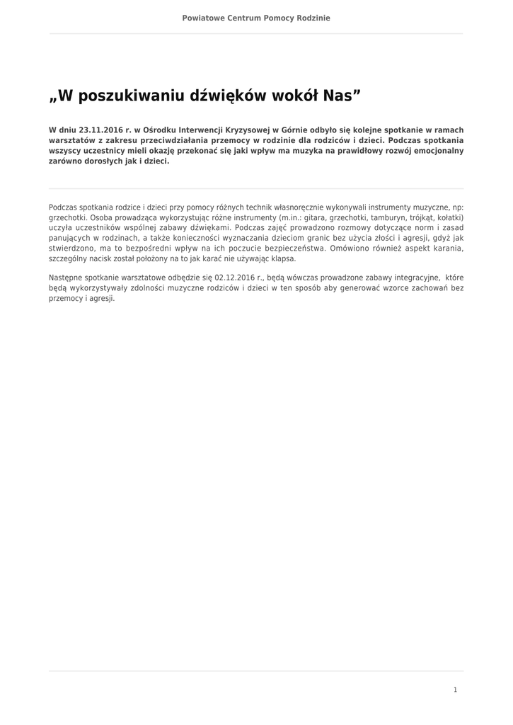 Powiatowe Centrum Pomocy Rodzinie „W poszukiwaniu dźwięków wokół Nas” W dniu 23.11.2016 r. w Ośrodku Interwencji Kryzysowej w Górnie odbyło się kolejne spotkanie w ramach warsztatów z zakresu przeciwdziałania przemocy w rodzinie dla rodziców i dzieci. Podczas spotkania wszyscy uczestnicy mieli okazję przekonać się jaki wpływ ma muzyka na prawidłowy rozwój emocjonalny zarówno dorosłych jak i dzieci. Podczas spotkania rodzice i dzieci przy pomocy różnych technik własnoręcznie wykonywali instrumenty muzyczne, np: grzechotki. Osoba prowadząca wykorzystując różne instrumenty (m.in.: gitara, grzechotki, tamburyn, trójkąt, kołatki) uczyła uczestników wspólnej zabawy dźwiękami. Podczas zajęć prowadzono rozmowy dotyczące norm i zasad panujących w rodzinach, a także konieczności wyznaczania dzieciom granic bez użycia złości i agresji, gdyż jak stwierdzono, ma to bezpośredni wpływ na ich poczucie bezpieczeństwa. Omówiono również aspekt karania, szczególny nacisk został położony na to jak karać nie używając klapsa. Następne spotkanie warsztatowe odbędzie się 02.12.2016 r., będą wówczas prowadzone zabawy integracyjne, które będą wykorzystywały zdolności muzyczne rodziców i dzieci w ten sposób aby generować wzorce zachowań bez przemocy i agresji. 1