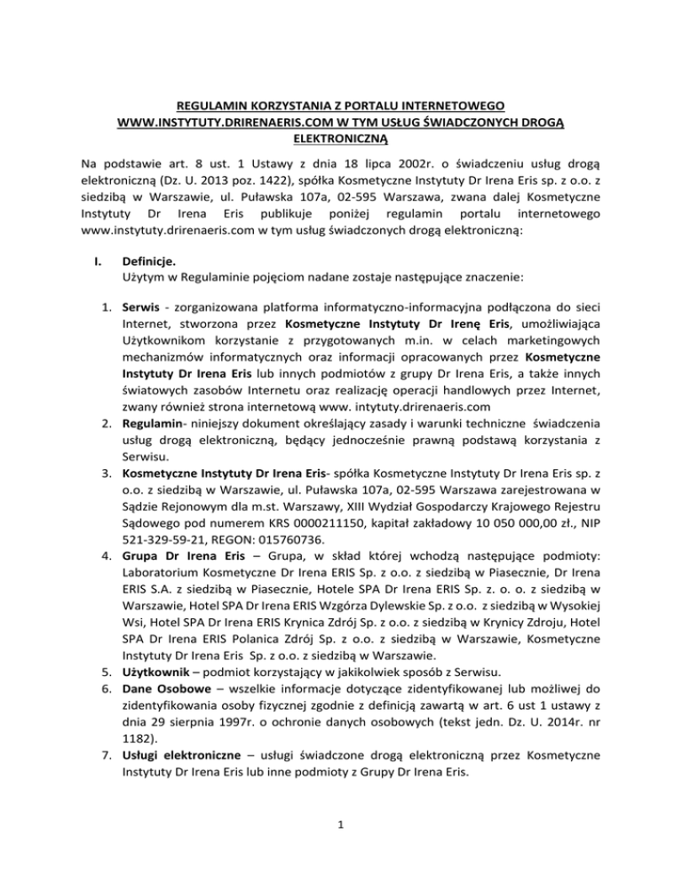 REGULAMIN KORZYSTANIA Z PORTALU INTERNETOWEGO WWW.INSTYTUTY.DRIRENAERIS.COM W TYM USŁUG ŚWIADCZONYCH DROGĄ ELEKTRONICZNĄ Na podstawie art. 8 ust. 1 Ustawy z dnia 18 lipca 2002r. o świadczeniu usług drogą elektroniczną (Dz. U. 2013 poz. 1422), spółka Kosmetyczne Instytuty Dr Irena Eris sp. z o.o. z siedzibą w Warszawie, ul. Puławska 107a, 02-595 Warszawa, zwana dalej Kosmetyczne Instytuty Dr Irena Eris publikuje poniżej regulamin portalu internetowego www.instytuty.drirenaeris.com w tym usług świadczonych drogą elektroniczną: I. Definicje. Użytym w Regulaminie pojęciom nadane zostaje następujące znaczenie: 1. Serwis - zorganizowana platforma informatyczno-informacyjna podłączona do sieci Internet, stworzona przez Kosmetyczne Instytuty Dr Irenę Eris, umożliwiająca Użytkownikom korzystanie z przygotowanych m.in. w celach marketingowych mechanizmów informatycznych oraz informacji opracowanych przez Kosmetyczne Instytuty Dr Irena Eris lub innych podmiotów z grupy Dr Irena Eris, a także innych światowych zasobów Internetu oraz realizację operacji handlowych przez Internet, zwany również strona internetową www. intytuty.drirenaeris.com 2. Regulamin- niniejszy dokument określający zasady i warunki techniczne świadczenia usług drogą elektroniczną, będący jednocześnie prawną podstawą korzystania z Serwisu. 3. Kosmetyczne Instytuty Dr Irena Eris- spółka Kosmetyczne Instytuty Dr Irena Eris sp. z o.o. z siedzibą w Warszawie, ul. Puławska 107a, 02-595 Warszawa zarejestrowana w Sądzie Rejonowym dla m.st. Warszawy, XIII Wydział Gospodarczy Krajowego Rejestru Sądowego pod numerem KRS 0000211150, kapitał zakładowy 10 050 000,00 zł., NIP 521-329-59-21, REGON: 015760736. 4. Grupa Dr Irena Eris – Grupa, w skład której wchodzą następujące podmioty: Laboratorium Kosmetyczne Dr Irena ERIS Sp. z o.o. z siedzibą w Piasecznie, Dr Irena ERIS S.A. z siedzibą w Piasecznie, Hotele SPA Dr Irena ERIS Sp. z. o. o. z siedzibą w Warszawie, Hotel SPA Dr Irena ERIS Wzgórza Dylewskie Sp. z o.o. z siedzibą w Wysokiej Wsi, Hotel SPA Dr Irena ERIS Krynica Zdrój Sp. z o.o. z siedzibą w Krynicy Zdroju, Hotel SPA Dr Irena ERIS Polanica Zdrój Sp. z o.o. z siedzibą w Warszawie, Kosmetyczne Instytuty Dr Irena Eris Sp. z o.o. z siedzibą w Warszawie. 5. Użytkownik – podmiot korzystający w jakikolwiek sposób z Serwisu. 6. Dane Osobowe – wszelkie informacje dotyczące zidentyfikowanej lub możliwej do zidentyfikowania osoby fizycznej zgodnie z definicją zawartą w art. 6 ust 1 ustawy z dnia 29 sierpnia 1997r. o ochronie danych osobowych (tekst jedn. Dz. U. 2014r. nr 1182). 7. Usługi elektroniczne – usługi świadczone drogą elektroniczną przez Kosmetyczne Instytuty Dr Irena Eris lub inne podmioty z Grupy Dr Irena Eris. 1 8. Usługi informacyjne- informacje udzielane na indywidualne żądanie Użytkownika (poprzez wyświetlenie strony o określonym adresie URL) dotyczących akcji marketingowych i promocji, konkursów, programów lojalnościowych, wydarzeń i nowości oraz produktów, usług oraz zabiegów dostępnych w Kosmetycznych Instytutach Dr Irena Eris. 9. Cookies - informacje zapisywane przez serwer Kosmetyczne Instytuty Dr Irena Eris, na komputerze Użytkownika, które mogą być odczytane po każdorazowym połączeniu się komputera z Serwisem. Cookies używane są przez Kosmetyczne Instytuty Dr Irena Eris m.in. w celu dostosowania treści i usług dostępnych w Serwisie do indywidualnych potrzeb i zainteresowań poszczególnych Użytkowników Serwisu. Cookies dostarczają danych statystycznych o ruchu Użytkowników i korzystaniu przez nich z poszczególnych stron portalu Kosmetyczne Instytuty Dr Irena Eris. Użytkownik może w każdej chwili wyłączyć w swojej przeglądarce opcję przyjmowania Cookies, jednakże wyłączenie Cookies może spowodować utrudnienie, czy wręcz uniemożliwić korzystanie z niektórych usług Kosmetycznych Instytutów Dr Irena Eris. Jednocześnie, w najszerszym dopuszczalnym przez prawo zakresie, Kosmetyczne Instytuty Dr Irena Eris oświadczają, że nie odpowiadają za stosowanie Cookies na innych stronach internetowych, dostępnych dla Użytkowników, dzięki linkom umieszczonym na stronach Kosmetyczne Instytuty Dr Irena Eris. 10. Newsletter – usługa elektroniczna świadczona przez Kosmetyczne Instytuty Dr Irena Eris, której treścią jest przesyłanie informacji, w szczególności o akcjach marketingowych i promocjach, konkursach, programach lojalnościowych, wydarzeniach i nowościach, dotyczących produktów lub usług dostępnych w Kosmetycznych Instytutach Dr Irena Eris, na wskazany przez Użytkownika adres email. W związku z faktem, że Newsletter może zawierać informacje handlowe, dlatego jest przesyłany wyłącznie do Użytkowników, którzy wyrazili chęć jego otrzymywania, poprzez wpisanie adresu poczty elektronicznej do formularza udostępnionego przez Serwis. 11. Ustawa o świadczeniu usług drogą elektroniczną - ustawa z dnia 18 lipca 2002 r. o świadczeniu usług drogą elektroniczną (Dz. U. Nr 144, poz. 1204 z poźn. zm.). II. Zagadnienia wstępne. 1. Z chwilą podjęcia czynności zmierzających do skorzystania z usług Serwisu, każdy Użytkownik zobowiązany jest do przestrzegania niniejszego Regulaminu. 2. Niniejszy Regulamin stanowi integralną część zawieranych przez Kosmetyczne Instytuty Dr Irenę Eris ze Użytkownikami umów o świadczenie usług drogą elektroniczną. 3. Warunkiem prawidłowego wyświetlania stron Serwisu oraz korzystania z Usług elektronicznych świadczonych przez Kosmetyczne Instytuty Dr Irena Eris za pośrednictwem strony www.instytuty.drirenaeris.com, jest spełnienie przez system i oprogramowanie zainstalowane na komputerze Użytkownika następujących wymagań: 2 a) Posiadanie systemu operacyjnego: minimum Windows 7, minimum MAC OS X, Android 4,0. b) Połączenie z łączem internetowym o przepustowości minimalnej 1024 kb/s dla pobierania i 512 kb/