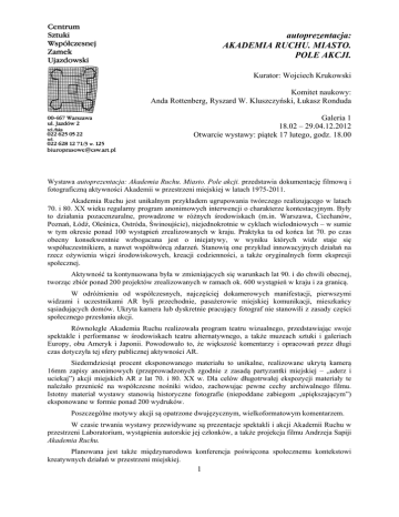 autoprezentacja: AKADEMIA RUCHU. MIASTO. POLE AKCJI. Kurator: Wojciech Krukowski Komitet naukowy: Anda Rottenberg, Ryszard W. Kluszczyński, Łukasz Ronduda Galeria 1 18.02 – 29.04.12.2012 Otwarcie wystawy: piątek 17 lutego, godz. 18.00 Wystawa autoprezentacja: Akademia Ruchu. Miasto. Pole akcji. przedstawia dokumentację filmową i fotograficzną aktywności Akademii w przestrzeni miejskiej w latach 1975-2011. Akademia Ruchu jest unikalnym przykładem ugrupowania twórczego realizującego w latach 70. i 80. XX wieku regularny program anonimowych interwencji o charakterze kontestacyjnym. Były to działania pozacenzuralne, prowadzone w różnych środowiskach (m.in. Warszawa, Ciechanów, Poznań, Łódź, Oleśnica, Ostróda, Świnoujście), niejednokrotnie w cyklach wielodniowych – w sumie w tym okresie ponad 100 wystąpień zrealizowanych w kraju. Praktyka ta od końca lat 70. po czas obecny konsekwentnie wzbogacana jest o inicjatywy, w wyniku których widz staje się współuczestnikiem, a nawet współtwórcą zdarzeń. Stanowią one przykład innowacyjnych działań na rzecz ożywienia więzi środowiskowych, kreacji codzienności, a także oryginalnych form ekspresji społecznej. Aktywność ta kontynuowana była w zmieniających się warunkach lat 90. i do chwili obecnej, tworząc zbiór ponad 200 projektów zrealizowanych w ramach ok. 600 wystąpień w kraju i za granicą. W odróżnieniu od współczesnych, najczęściej dokamerowych manifestacji, pierwszymi widzami i uczestnikami AR byli przechodnie, pasażerowie miejskiej komunikacji, mieszkańcy sąsiadujących domów. Ukryta kamera lub dyskretnie pracujący fotograf nie stanowili z zasady części społecznego przesłania akcji. Równolegle Akademia Ruchu realizowała program teatru wizualnego, przedstawiając swoje spektakle i performanse w środowiskach teatru alternatywnego, a także muzeach sztuki i galeriach Europy, obu Ameryk i Japonii. Powodowało to, że większość komentarzy i opracowań przez długi czas dotyczyła tej sfery publicznej aktywności AR. Siedemdziesiąt procent eksponowanego materiału to unikalne, realizowane ukrytą kamerą 16mm zapisy anonimowych (przeprowadzonych zgodnie z zasadą partyzantki miejskiej – „uderz i uciekaj”) akcji miejskich AR z lat 70. i 80. XX w. Dla celów długotrwałej ekspozycji materiały te należało przenieść na współczesne nośniki wideo, zachowując pewne cechy archiwalnego filmu. Istotny materiał wystawy stanowią historyczne fotografie (niepoddane zabiegom „upiększającym”) eksponowane w formie ponad 200 wydruków. Poszczególne motywy akcji są opatrzone dwujęzycznym, wielkoformatowym komentarzem. W czasie trwania wystawy przewidywane są prezentacje spektakli i akcji Akademii Ruchu w przestrzeni Laboratorium, wystąpienia autorskie jej członków, a także projekcja filmu Andrzeja Sapiji Akademia Ruchu. Planowana jest także międzynarodowa konferencja poświęcona społecznemu kontekstowi kreatywnych działań w przestrzeni miejskiej. 1 Projekty towarzyszące wystawie: Spektakl Akademii Ruchu, Chińska lekcja Laboratorium CSW: sobota 18 lutego 2012, sobota 21 kwietnia 2012, godz. 19.00 bilety: 8 zł – normalny, 6 zł - ulgowy Performance Janusza Bałdygi, Flagi Po-Rzucone Laboratorium CSW: poniedziałek 27 lutego 2012, godz. 19.00 Akcja Akademii Ruchu, Wykład II Laboratorium CSW, sobota 10 marca 2012, godz. 19.00 Performance Jolanty Krukowskiej, Z drogi Laboratorium CSW: sobota 24 marca 2012, godz. 19.00 Pokaz filmu Andrzeja Sapiji Akademia Ruchu Kino.Lab: poniedziałek 20 lutego 2012, godz. 18.30 Indywidualne wystąpienia autorskie członków Akademii Ruchu w ramach programu Pracowni Akademii Ruchu w przestrzeni M2 w CSW w terminach ustalanych na bieżąco od marca 2012 więcej: www.csw.art.pl www.akademiaruchu.com Rejestracja filmowa: Jan Pieniążek oraz Janusz Bałdyga, Cezary Chojnowski, Paweł Kwiek, Władysław Grochowski, Jerzy Karpiński, Jędrzej Jaworski, Andrzej Sapija, Marek Szumski, Mariusz Szachowski Rejestracja fotograficzna: Jan Pieniążek oraz Stefan Okołowicz, Katarzyna Górna, Mariusz Michalski Opracowanie materiałów filmowych: Cezary Chojnowski Konsultacja oraz opracowanie materiału graficznego i fotograficznego ekspozycji: Kuba Bąkowski Współorganizacja wystawy: Stowarzyszenie Przyjaciół Akademii Ruchu Projekt zrealizowany dzięki wsparciu finansowemu: Ministerstwa Kultury i Dziedzictwa Narodowego, oraz Biura Kultury Urzędu Miasta Stołecznego Warszawy Podziękowania: Casearia Trentino S.n.c. Patronat medialny: Gazeta Wyborcza, Aktivist, Exklusiv, Stolica, Elle Decoration Materiały prasowe do pobrania ze strony: www.csw.art.pl zakładka: Biuroprasowe | materiały prasowe Zdjęcia dostępne pod adresem: ftp://cswd.home.net.pl login: media hasło: press katalog: media plik: autoprezentacja Informacje: Zofia Chojnacka, Biuro Prasowe CSW, kom. 510 160 637 tel./faks 22 625 05 22, [email protected] 2