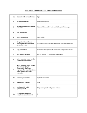 SYLABUS PRZEDMIOTU: Funkcje analityczne Lp. Elementy składowe sylabusu Opis 1. Nazwa przedmiotu Funkcje analityczne 2. Nazwa jednostki prowadzącej przedmiot Wydział Matematyki i Informatyki, Instytut Matematyki 3. Kod przedmiotu 4. Język przedmiotu Język polski 5. Grupa treści kształcenia, w ramach której przedmiot jest realizowany Przedmiot realizowany w ramach grupy treści kierunkowych. 6. Typ przedmiotu Przedmiot obowiązkowy do ukończenia całego toku studiów. 7. Rok studiów, semestr Rok III semestr VI, specjalność teoretyczna 8. Imię i nazwisko osoby (osób) prowadzącej przedmiot 9. Imię i nazwisko osoby (osób) egzaminującej bądź udzielającej zaliczenia w przypadku, gdy nie jest nim osoba prowadząca dany przedmiot 10. Formuła przedmiotu Wykład i ćwiczenia 11. Wymagania wstępne Brak 12. Liczba godzin zajęć dydaktycznych 30 godzin wykładu i 30 godzin ćwiczeń 13. Liczba punktów ECTS przypisana przedmiotowi 8 14. Czy podstawa obliczenia średniej ważonej? 15. Założenia i cele przedmiotu 16. Metody dydaktyczne 17. Forma i warunki zaliczenia przedmiotu, w tym zasady dopuszczenia do egzaminu, zaliczenia z przedmiotu, a także formę i warunki zaliczenia poszczególnych form zajęć wchodzących w zakres danego przedmiotu Przedmiot kończy się egzaminem pisemnym albo ustnym. Do podejścia do egzaminu konieczne jest zaliczenie ćwiczeń. Podstawą uzyskania zaliczenia z ćwiczeń jest ocenianie ciągłe i/lub kilka (liczba zależy od prowadzących ćwiczenia) pisemnych sprawdzianów. 18. Treści merytoryczne przedmiotu oraz sposób ich realizacji Podstawowe własności liczb zespolonych, funkcje elementarne, zasadnicze twierdzenie algebry, C-różniczkowalność, całki po drogach, twierdzenie całkowe Cauchy'ego-Goursata dla trójkąta, równoważność istnienia pierwotnej i znikania całek po drogach zamkniętych, wzór całkowy Cauchy'ego. Twierdzenie Morery, twierdzenie Liouville'a, zasada maksimum. Twierdzenie Weierstrassa o ciągach funkcji holomorficznych, wzór Cauchy'ego-Hadamarda, zasada identyczności dla szeregów potęgowych i funkcji holomorficznych. Twierdzenie o odwzorowaniu otwartym, indeks drogi zamkniętej, twierdzenie Cauchy'ego-Dixona. Szeregi Laurenta, osobliwości funkcji holomorficznych, twierdzenie Casoratiego-WeierstrassaSochockiego, twierdzenie o residuach, obliczanie pewnych całek rzeczywistych. Zasada argumentu, twierdzenie Rouché'go. Odwzorowania konforemne, lemat Schwarza, automorfizmy koła, homografie, twierdzenie Riemanna o odwzorowaniu konforemnym (bez dowodu). Funkcje harmoniczne, wzór Poissona. 19. Wykaz literatury podstawowej i uzupełniającej, obowiązującej do zaliczenia danego przedmiotu Wykład ma charakter autorski, obowiązuje przede wszystkim materiał wyłożony, literatura ma charakter pomocniczy. Do odpowiednich zagadnień literatura podawana jest na bieżąco w trakcie wykładu. Przedmiot stanowi podstawę obliczenia średniej ważonej. Umiejętność stosowania metod analizy zespolonej, w szczególności rozwijalności funkcji w szereg; stosowania residuuów do obliczania całek. Wykład prowadzony jest w tradycyjny sposób z ewentualnym wykorzystaniem projektora multimedialnego. Ćwiczenia głównie odbywają się przy tablicy, gdzie studenci rozwiązuję zagadnienia teoretyczne i obliczeniowe.