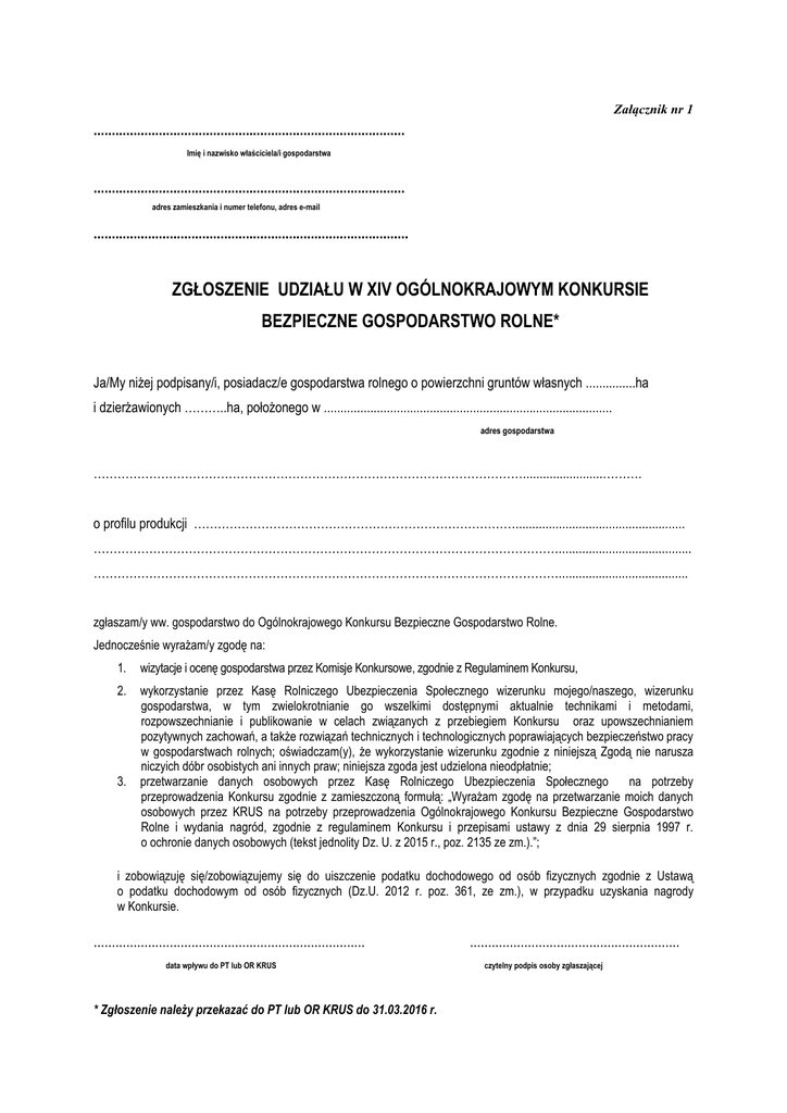 Załącznik nr 1 ...................................................................................... Imię i nazwisko właściciela/i gospodarstwa ...................................................................................... adres zamieszkania i numer telefonu, adres e-mail ....................................................................................... ZGŁOSZENIE UDZIAŁU W XIV OGÓLNOKRAJOWYM KONKURSIE BEZPIECZNE GOSPODARSTWO ROLNE* Ja/My niżej podpisany/i, posiadacz/e gospodarstwa rolnego o powierzchni gruntów własnych ...............ha i dzierżawionych ………..ha, położonego w ....................................................................................... adres gospodarstwa ………………………………………………………………………………………………........................………. o profilu produkcji ………………………………………………………………………................................................... ………………………………………………………………………………………………………........................................ ………………………………………………………………………………………………………....................................... zgłaszam/y ww. gospodarstwo do Ogólnokrajowego Konkursu Bezpieczne Gospodarstwo Rolne. Jednocześnie wyrażam/y zgodę na: 1. wizytacje i ocenę gospodarstwa przez Komisje Konkursowe, zgodnie z Regulaminem Konkursu, 2. wykorzystanie przez Kasę Rolniczego Ubezpieczenia Społecznego wizerunku mojego/naszego, wizerunku gospodarstwa, w tym zwielokrotnianie go wszelkimi dostępnymi aktualnie technikami i metodami, rozpowszechnianie i publikowanie w celach związanych z przebiegiem Konkursu oraz upowszechnianiem pozytywnych zachowań, a także rozwiązań technicznych i technologicznych poprawiających bezpieczeństwo pracy w gospodarstwach rolnych; oświadczam(y), że wykorzystanie wizerunku zgodnie z niniejszą Zgodą nie narusza niczyich dóbr osobistych ani innych praw; niniejsza zgoda jest udzielona nieodpłatnie; przetwarzanie danych osobowych przez Kasę Rolniczego Ubezpieczenia Społecznego na potrzeby przeprowadzenia Konkursu zgodnie z zamieszczoną formułą: „Wyrażam zgodę na przetwarzanie moich danych osobowych przez KRUS na potrzeby przeprowadzenia Ogólnokrajowego Konkursu Bezpieczne Gospodarstwo Rolne i wydania nagród, zgodnie z regulaminem Konkursu i przepisami ustawy z dnia 29 sierpnia 1997 r. o ochronie danych osobowych (tekst jednolity Dz. U. z 2015 r., poz. 2135 ze zm.).”; 3. i zobowiązuję się/zobowiązujemy się do uiszczenie podatku dochodowego od osób fizycznych zgodnie z Ustawą o podatku dochodowym od osób fizycznych (Dz.U. 2012 r. poz. 361, ze zm.), w przypadku uzyskania nagrody w Konkursie. ........................................................................... data wpływu do PT lub OR KRUS * Zgłoszenie należy przekazać do PT lub OR KRUS do 31.03.2016 r. .......................................................... czytelny podpis osoby zgłaszającej