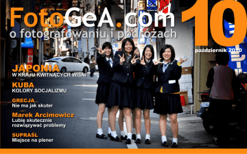 10 FotoGeA.com o fotografowaniu i podróżach październik 2010 JAPONIA w KRAJU KWITNĄCYCH WIŚNI KUBA KOLORY SOCJALIZMU GRECJA Nie ma jak skuter Marek Arcimowicz Lubię skutecznie rozwiązywać problemy SUPRAŚL Miejsce na plener 1 www.fotogea.com MAJ 2010 Od redakcji Dzień dobry, Wszyscy fotografowie tęsknią za lep- Spis treści pewni, że nowy aparat lub obiektyw GeAPodróż: Japonia str. 9 GeAPocztówka: Kuba str. 34 GeAPlener: Supraśl str. 48 GeAInspiracje: Grecja str. 54 GeAMistrz: Wywiad z Markiem Arcimowiczem str. 64 pozwoli im na zrobienie ciekawszych zdjęć. Przy okazji niedawnych targów Photokina nastąpił potężny wysyp nowości sprzętowych. Ciekawe propozycje przeplatają się z produktami z góry skazanymi na porażkę. Szybko ich przydatność zweryfikuje rynek i czas. Czas podobno na okładce naszego miesięcznika pojawiła się 10 zamiast 5. Nie umknęło Wam kilka numerów! Robimy porządki z numeracją. Numery będą od teraz oznaczone cyframi i liczbami miesięcy, w których się ukazują. Marek Waśkiel redaktor naczelny, miesięcznika FotoGeA.com www.FotoGeA.com c październik 2010 Zdjęcie na okładce: Monika Wiśniewska. biegnie coraz szybciej. Jednak nie z tego powodu 2 10 szym sprzętem. W większości są Kliknij i dołącz do naszych Przyjaciół na Facebooku: » GeAZOOM str. 3 » GeAMIX str. 6 » GeARECENZJA str. 24 » GeAFELIETON str. 31 » GeAFORUM str. 32 » GeAGADŻETY str. 46 » GeASprzęt str. 62 » GeAZapowiedzi str. 81 Spis treści Geazoom Plitwickie jeziora, Chorwacja Park Narodowy Jezior Plitwickich powstał w 1949 r. Jego największą atrakcją jest 16 jezior krasowych połączonych ze sobą licznymi wodospadami. Bez wątpienia w sezonie turystycznym, jest to jedno z najbardziej obleganych miejsc w Chorwacji. Zdjęcie: Marek Waśkiel www.waskiel.pl 3 www.fotogea.com MAJ 2010 GeaZoom Geazoom Crac des Chevaliers, SYRIA Jest najsłynniejszym zamkiem spośród licznych twierdz wzniesionych przez krzyżowców podczas ich wypraw do Ziemi Świętej. Zdjęcie: Marek Waśkiel www.waskiel.pl 4 www.fotogea.com MAJ 2010 GeaZoom Geazoom PRAHA, CzECHY Pięknym dachom starówki przygladają się z uwagą nie tylko miliony turystów, ale także mieszkające tutaj ptaki. Zdjęcie: Marek Waśkiel www.waskiel.pl 5 www.fotogea.com MAJ 2010 GeaZoom Geamix PODZIEMNE KRAJOBRAZY Na ogrodzeniu Państwowego Instytutu Geologicznego od ulicy Rakowieckiej do końca grudnia będzie eksponowana wystawa „PODZIEMNE KRAJOBRAZY”. Wystawa zorganizowana przez Państwowy Instytut Geologiczny – PIB we współpracy ze Speleoklubem Warszawskim przedstawia fotografie jaskiniowe, które w latach 2004-2009 brały udział w Międzynarodowym Konkursie Fotografii Jaskiniowej im. Waldemara Burkackiego. Międzynarodowy Konkurs Fotografii Jaskiniowej im. Waldemara Burkackiego organizowany przez Speleoklub Warszawski od lat osiemdziesiątych jest jedyną imprezą o tej randze i tematyce w Polsce oraz jedną z kilku ważniejszych na świecie. Autorzy, przysyłający prace na konkurs mają tylko jedno zadanie: sfo6 www.FotoGeA.com c październik 2010 Jedno ze zdjęć prezentowanych na wystawie. Fot. A. Zera tografować jaskinię – jej walory przyrodnicze, sportowe i estetyczne. Dobrą tradycją Konkursu jest współpraca ze znanymi polskimi fotografami i fotoreporterami, którzy wspólnie z grotołazami tworzą jury oceniające zdjęcia z całego świata. ◊ 10 WINO W EUROPIE Europa jest regionem, w którym pije się najwięcej wina. W światowym rankingu wina, w pierwszej dwudziestce, znajduje się aż czternaście państw europejskich. Pierwsze miejsce w spożyciu wina na jednego mieszkańca zajmuje Watykan – państwo, w którym wino pije się głównie w celach obrzędowych. Na drugim leżąca w Oceanii wyspa Norfolk, zaś na kolejnych pozycjach: Francja, Luksemburg, Andora i Włochy. We wszystkich tych państwach każdy obywatel wypija średnio ponad 50 litrów wina rocznie, czyli mniej więcej jedną butelkę co pięć dni. Nieco mniej – ponad 40 l, wypijają co roku mieszkańcy Portugalii, Słowenii, południowoamerykańskich Falklandów oraz Chorwacji. Kraje Europy przewodzą w światowym rankingu spożycia wina, jednak nie na całym kontynencie pije się go równie dużo. Mieszkańcy północno-zachodniej Europy wśród alkoholi wybierają najczęściej piwo, a na wschodzie kontynentu nadal żywa jest kultura picia wódki. Wino związane jest przede wszystkim z dawnymi terenami Cesarstwa Rzymskiego, jednak moda na jego picie obejmuje coraz więcej państw. Spożycie tego trunku wzrosło w ostatnich latach m.in. w takich krajach jak Austria, Belgia, Holandia, Niemcy, Wielka Brytania i Irlandia. Statystyczny Austriak wypił w 2008 r. przeszło czterdzieści butelek wina. Najmniej wina w Europie, zaledwie dwie butelki rocznie na głowę, wypijają Polacy. Nasz kraj w rankingu wyprzedzają nawet państwa o przewadze zakazującej picia alkoholu religii muzułmańskiej. ◊ GEAMIX Geamix 10 Kłopoty z polskimi nazwami ulic na Wileńszczyźnie TARGI TOUR SALON 20-23 października 2010 r. P T remier Litwy Andrius Kubilius krytycznie ocenił dwujęzyczne nazwy ulic na Wileńszczyźnie. Premier z grupą ministrów odwiedził rejony wileński i solecznicki, które w większości zamieszkane są przez Polaków. – Oceniam to źle. Ustaw należy przestrzegać – powiedział Kubilius. Wyraził też jednak zrozumienie dla „uczuć i sentymentów” mieszkańców Wileńszczyzny i zapewnił, że rząd będzie poszukiwał sposobu rozstrzygnięcia tego problemu. Mer rejonu wileńskiego Maria Rekść zaznaczyła, że w rejonie 61 proc. mieszkańców stanowią Polacy i chcą, by napisy były również po polsku. – Sądzę – mówi mer, że tak też powinno być (...). Jesteśmy w Unii Europejskiej i skoro w Unii są dwujęzyczne napisy, 7 www.FotoGeA.com c październik 2010 Wileńszczyzna jest regionem licznie zamieszkiwanym przez Polaków dlaczego nie może ich być na Litwie? Od kil
