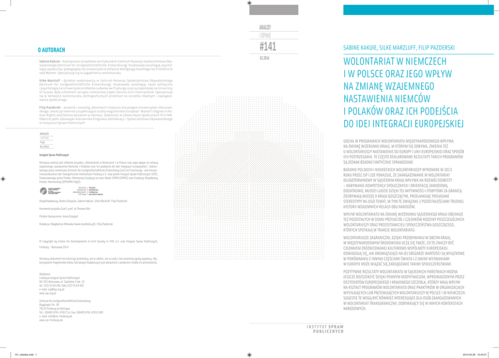 ANALIZY I OPINIE O AUTORACH Sabine Kakuie – koordynator projektów we fryburskim Centrum Rozwoju Społeczeństwa Obywatelskiego (Zentrum für zivilgesellschaftliche Entwicklung). Studiowała socjologię, psychologię społeczną i pedagogikę na Uniwersytecie Johanna Wolfganga Goethego we Frankfurcie nad Menem. Specjalizuje się w zagadnieniu wolontariatu. Silke Marzluff – dyrektor wykonawczy w Centrum Rozwoju Społeczeństwa Obywatelskiego (Zentrum für zivilgesellschaftliche Entwicklung). Studiowała socjologię, nauki polityczne i psychologię na Uniwersytecie Alberta-Ludwika we Fryburgu oraz europeistykę na University of Sussex. Była członkiem zarządu niemieckiej części Service Civil International. Specjalizuje się w tematyce wolontariatu, demograficznych przemian na szczeblu lokalnym i zaangażowania społecznego. Filip Pazderski – prawnik i socjolog, absolwent Instytutu Socjologoo Uniwersytetu Warszawskiego. Ukończył również uzupełniające studia magisterskie European Master’s Degree in Human Rights and Democratisation w Wenecji. Doktorant w Szkole Nauk Społecznych IFiS PAN. Obecnie pełni obowiązki Kierownika Programu Demokracji i Społeczeństwa Obywatelskiego w Instytucie Spraw Publicznych. ANALIZY I OPINIE #141 02.2014 Instytut Spraw Publicznych Niniejsza analiza jest efektem projektu „Wolontariat w Niemczech i w Polsce oraz jego wpływ na zmiany wzajemnego nastawienia Niemców i Polaków oraz ich podejścia do idei integracji europejskiej”, realizowanego przez niemieckie Zentrum für zivilgesellschaftliche Entwicklung (zze) im Forschungs- und Innovationsverbund an der Evangelischen Hochschule Freiburg e.V. oraz polski Instytut Spraw Publicznych (ISP), finansowanego przez Polsko-Niemiecką Fundację na rzecz Nauki (PNFN/DPWS) oraz Fundację Współpracy Polsko-Niemieckiej (DPFWPN/SdpZ). Zespół badawczy: Beata Charycka, Sabine Kakuie, Silke Marzluff, Filip Pazderski Kierownik projektu (zze): prof. dr Thomas Klie Polskie tłumaczenie: Anna Dzięgiel Redakcja: Magdalena Otlewska (www.bezbledu.pl), Filip Pazderski © Copyright by Centre for Developments in Civil Society in FIVE e.V. oraz Instytut Spraw Publicznych, Freiburg – Warszawa 2014 Niniejszy dokument nie może być powielany, ani w całości, ani w części, bez pisemnej zgody wydawcy. Wykorzystanie fragmentów tekstu lub danych badawczych jest dozwolone z podaniem źródła ich pochodzenia. Wydawca: Fundacja Instytut Spraw Publicznych 00–031 Warszawa, ul. Szpitalna 5 lok. 22 tel. (22) 55 64 260, faks (22) 55 64 262 e-mail: [email protected] www.isp.org.pl Zentrum für zivilgesellschaftliche Entwicklung Bugginger Str. 38 79114 Freiburg im Breisgau Tel.: (0049) 0761 47812 14, Fax: (0049) 0761 47812 699 e-mail: [email protected] www.zze-freiburg.de 141_okladka.indd 1 #141 02.2014 SABINE KAKUIE, SILKE MARZLUFF, FILIP PAZDERSKI WOLONTARIAT W NIEMCZECH I W POLSCE ORAZ JEGO WPŁYW NA ZMIANĘ WZAJEMNEGO NASTAWIENIA NIEMCÓW I POLAKÓW ORAZ ICH PODEJŚCIA DO IDEI INTEGRACJI EUROPEJSKIEJ UDZIAŁ W PROGRAMACH WOLONTARIATU MIĘDZYNARODOWEGO WPŁYWA NA ZMIANĘ WIZERUNKU KRAJU, W KTÓRYM SIĘ ODBYWA. ZMIENIA TEŻ U WOLONTARIUSZY NASTAWIENIE DO EUROPY I UNII EUROPEJSKIEJ ORAZ SPOSÓB ICH POSTRZEGANIA. TE CZĘSTO DEKLAROWANE REZULTATY TAKICH PROGRAMÓW SĄ JEDNAK RZADKO FAKTYCZNIE SPRAWDZANE. BADANIE POLSKICH I NIEMIECKICH WOLONTARIUSZY WYKONANE W 2013 ROKU PRZEZ ISP I ZZE POKAZUJE, ŻE ZAANGAŻOWANIE W WOLONTARIAT DŁUGOTERMINOWY W SĄSIEDNIM KRAJU WPŁYWA NA ROZWÓJ OSOBISTY – NABYWANIE KOMPETENCJI SPOŁECZNYCH I ORIENTACJĘ ZAWODOWĄ. DODATKOWO, MŁODZI LUDZIE DZIĘKI TEJ AKTYWNOŚCI I POBYTOWI ZA GRANICĄ ZDOBYWAJĄ WIEDZĘ O KRAJU GOSZCZĄCYM, PRZEŁAMUJĄC POSIADANE STEREOTYPY NA JEGO TEMAT, W TYM TE ZWIĄZANE Z POZOSTAŁOŚCIAMI TRUDNEJ HISTORII WZAJEMNYCH RELACJI OBU NARODÓW. WPŁYW WOLONTARIATU NA ZMIANĘ WIZERUNKU SĄSIEDNIEGO KRAJU OBEJMUJE TEŻ POZOSTAŁYCH W DOMU PRZYJACIÓŁ I CZŁONKÓW RODZINY POSZCZEGÓLNYCH WOLONTARIUSZY ORAZ PRZEDSTAWICIELI SPOŁECZEŃSTWA GOSZCZĄCEGO, KTÓRYCH SPOTKAJĄ W TRAKCIE WOLONTARIATU. WOLONTARIUSZE ZAGRANICZNI, DZIĘKI PRZEBYWANIU W OBCYM KRAJU, W MIĘDZYNARODOWYM ŚRODOWISKU UCZĄ SIĘ TAKŻE, CO TO ZNACZY BYĆ CZŁONKIEM ZRÓŻNICOWANEJ KULTUROWO WSPÓLNOTY EUROPEJSKIEJ. DOWIADUJĄ SIĘ, JAK OBOWIĄZUJĄCE NA JEJ OBSZARZE WARTOŚCI SĄ WYJĄTKOWE W PORÓWNANIU Z INNYMI CZĘŚCIAMI ŚWIATA I Z JAKIMI WYZWANIAMI W EUROPIE MOŻE WIĄZAĆ SIĘ ZARZĄDZANIE TAKIMI SPOŁECZEŃSTWAMI. POZYTYWNE REZULTATY WOLONTARIATU W SĄSIEDNICH PAŃSTWACH MOŻNA JESZCZE ROZSZERZYĆ DZIĘKI PEWNYM MODYFIKACJOM, WPROWADZONYM PRZEZ DECYDENTÓW EUROPEJSKIEGO I KRAJOWEGO SZCZEBLA, KTÓRZY MAJĄ WPŁYW NA KSZTAŁT PROGRAMÓW WOLONTARIATU ORAZ PRAKTYKÓW W ORGANIZACJACH WYSYŁAJĄCYCH LUB PRZYJMUJĄCYCH WOLONTARIUSZY W POLSCE I W NIEMCZECH. SUGESTIE TE MOGĄ BYĆ RÓWNIEŻ INTERESUJĄCE DLA OSÓB ZAANGAŻOWANYCH W WOLONTARIAT TRANSGRANICZNY, ODBYWAJĄCY SIĘ W INNYCH KONTEKSTACH NARODOWYCH. 2014-04-28 10:44:01 WSTĘP 1 141_Analizy i opinie.indd 1 SABINE KAKUIE, SILKE MARZLUFF, FILIP PAZDERSKI WOLONTARIAT W NIEMCZECH I W POLSCE ORAZ JEGO WPŁYW NA ZMIANĘ WZAJEMNEGO NASTAWIENIA NIEMCÓW I POLAKÓW ORAZ ICH PODEJŚCIA DO IDEI INTEGRACJI EUROPEJSKIEJ Przedmiotem zainteresowania omawianego w tej publikacji projektu badawczego był wpływ zagranicznego wolontariatu długoterminowego, odbywającego się w sąsiadującym kraju, na wizerunek państwa (i jego mieszkańców), w którym ten rodzaj aktywności był prowadzony. Drugim głównym pytaniem, na które w trakcie podjętych działań starał się odpowiedzieć zespół badawczy, było to, czy i jak aktywność wolontariacka wpływa na refleksje i postawy wobec Europy i Unii Europejskiej. Materiał źródłowy, w oparciu o który opracowano prezentowane tu wyniki, został zgromadzony w trakcie dwóch etapów prac badawczych. W pierwszej kolejności przeprowadzono badanie za pomocą kwestionariusza on-line. Próba składała się z 28 Po