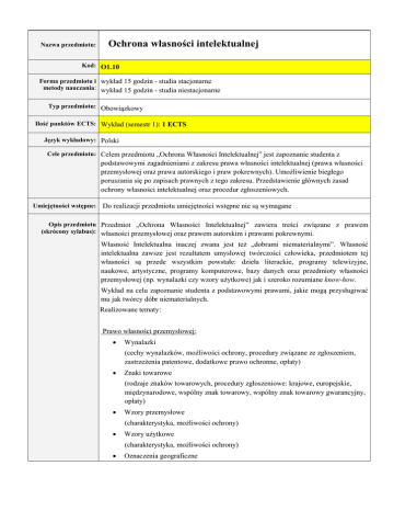 Nazwa przedmiotu: Ochrona własności intelektualnej Kod: O1.10 Forma przedmiotu i wykład 15 godzin - studia stacjonarne metody nauczania: wykład 15 godzin - studia niestacjonarne Typ przedmiotu: Obowiązkowy Ilość punktów ECTS: Wykład (semestr 1): 1 ECTS Język wykładowy: Polski Cele przedmiotu: Celem przedmiotu „Ochrona Własności Intelektualnej” jest zapoznanie studenta z podstawowymi zagadnieniami z zakresu prawa własności intelektualnej (prawa własności przemysłowej oraz prawa autorskiego i praw pokrewnych). Umożliwienie biegłego poruszania się po zapisach prawnych z tego zakresu. Przedstawienie głównych zasad ochrony własności intelektualnej oraz procedur zgłoszeniowych. Umiejętności wstępne: Do realizacji przedmiotu umiejętności wstępne nie są wymagane Opis przedmiotu Przedmiot „Ochrona Własności Intelektualnej” zawiera treści związane z prawem (skrócony sylabus): własności przemysłowej oraz prawem autorskim i prawami pokrewnymi. Własność Intelektualna inaczej zwana jest też „dobrami niematerialnymi”. Własność intelektualna zawsze jest rezultatem umysłowej twórczości człowieka, przedmiotem tej własności są przede wszystkim powstałe: dzieła literackie, programy telewizyjne, naukowe, artystyczne, programy komputerowe, bazy danych oraz przedmioty własności przemysłowej (np. wynalazki czy wzory użytkowe) jak i szeroko rozumiane know-how. Wykład na celu zapoznanie studenta z podstawowymi prawami, jakie mogą przysługiwać mu jak twórcy dóbr niematerialnych. Realizowane tematy: Prawo własności przemysłowej: Wynalazki (cechy wynalazków, możliwości ochrony, procedury związane ze zgłoszeniem, zastrzeżenia patentowe, dodatkowe prawo ochronne, opłaty) Znaki towarowe (rodzaje znaków towarowych, procedury zgłoszeniowe: krajowe, europejskie, międzynarodowe, wspólny znak towarowy, wspólny znak towarowy gwarancyjny, opłaty) Wzory przemysłowe (charakterystyka, możliwości ochrony) Wzory użytkowe (charakterystyka, możliwości ochrony) Oznaczenia geograficzne (Charakterystyka oznaczeń geograficznych, możliwości zgłoszenia, przykłady polskich i światowych oznaczeń geograficznych) Topografie układów scalonych PWP a Internet ( wykorzystanie znaków towarowych to pozycjonowania stron i tworzenia witryn internetowych) Umowy (Umowy licencyjne w PWP, umowy sprzedaży) Prawo autorskie i prawa pokrewne: Utwór (charakterystyka) Autorskie prawa osobiste Autorskie prawa majątkowe (okres trwania, warunki, możliwości transferu) Długość ochrony Pojęcie plagiatu (definicje plagiatu, rodzaje plagiatu, systemy antyplagiatowe) Umowy (przekazujące prawa autorskie majątkowe, licencje) Odpowiedzialność karna za naruszenie praw autorskich Dozwolony użytek własny Organizacje zbiorowego zarządzania prawami autorskimi lub prawami pokrewnymi Programy komputerowe (ochrona za pomocą prawa autorskiego) Pojęcie Know -how Ochrona wizerunku, adresata korespondencji i tajemnicy źródeł informacji (ochrona oraz możliwości wykorzystania wizerunku innych) Prawa autorskie w internecie (licencja cc: creative commons, piractwo domenowe) Zwalczanie nieuczciwej konkurencji ( w zakresie PWP i prawa autorskiego) (podróbki, produkty podobne, niedozwolone reklamy) Efekty kształcenia Po ukończeniu przedmiotu (wykładu oraz zajęć z wykorzystanie e-learningu) student: zdefiniowane dla danej formy dydaktycznej zajęć w ramach przedmiotu: Zna i posługuje się zapisami ustawy prawo własności przemysłowej oraz prawo autorskie i prawa pokrewne Rozpoznaje i rozróżnia rodzaje znaków towarowych oraz praw autorskich Potrafi dokonać zgłoszenia znaku towarowego Jest w stanie z udziałem rzecznika patentowego dokonać zgłoszenia wynalazku Zna i rozumie pojęcie plagiatu, utworu, know-how Umie przygotować podstawowe umowy z zakresu PWP i prawa autorskiego Sposób zaliczenia, Egzamin. kryteria zaliczenia Egzamin: 80% (zaliczenie przy uzyskaniu min 16,5 pkt. na 31 możliwych) metody ewaluacji e-learning: 20% (zaliczenie po wykonaniu poprawnie zadań) wiedzy Literatura: „ Prawo własności intelektualnej” Joanna Sieńczyło-Chlabicz, wyd. LexisNexis 2010 „Prawo własności przemysłowej” - Nowińska Ewa, Promińska Urszula, Michał du Vall, wyd. LexisNexis 2007 „Prawo autorskie i prawa pokrewne” Janusz Barta, Ryszard Markiewicz wyd. Wolters Kluwer 2008 „Poradnik wynalazcy” red. Andrzej Pyrża, Krajowa Izba Gospodarcza 2009 „Przedsiębiorczość intelektualna i technologiczna” red. Mieczysław Bąk, Przemysław Kulawczuk, Krajowa Izba Gospodarcza 2009 Ustawa Prawo własności przemysłowej Ustawa o prawie autorskim i prawach pokrewnych Publikacje i materiały informacyjne Urzędu Patentowego RP Dodatkowe informacje strony internetowe: http://www.uprp.pl/ http://www.wipo.int/ http://www.epo.org/ Koordynator mgr Joanna Proczek przedmiotu: Prowadzący zajęcia: mgr Joanna Proczek Data aktualizacji: 01.06.2012
