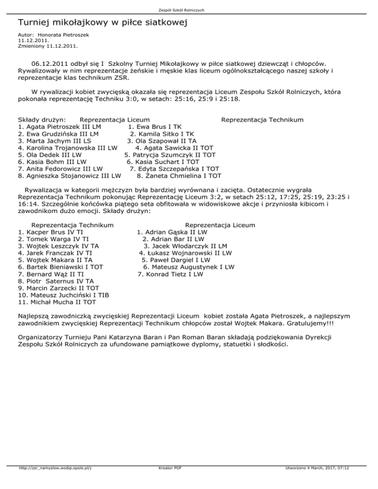 Zespół Szkół Rolniczych Turniej mikołajkowy w piłce siatkowej Autor: Honorata Pietroszek 11.12.2011. Zmieniony 11.12.2011. 06.12.2011 odbył się I Szkolny Turniej Mikołajkowy w piłce siatkowej dziewcząt i chłopców. Rywalizowały w nim reprezentacje żeńskie i męskie klas liceum ogólnokształcącego naszej szkoły i reprezentacje klas technikum ZSR. W rywalizacji kobiet zwycięską okazała się reprezentacja Liceum Zespołu Szkół Rolniczych, która pokonała reprezentację Techniku 3:0, w setach: 25:16, 25:9 i 25:18. Składy drużyn: Reprezentacja Liceum Reprezentacja Technikum 1. Agata Pietroszek III LM 1. Ewa Brus I TK 2. Ewa Grudzińska III LM 2. Kamila Sitko I TK 3. Marta Jachym III LS 3. Ola Szapował II TA 4. Karolina Trojanowska III LW 4. Agata Sawicka II TOT 5. Ola Dedek III LW 5. Patrycja Szumczyk II TOT 6. Kasia Bohm III LW 6. Kasia Suchart I TOT 7. Anita Fedorowicz III LW 7. Edyta Szczepańska I TOT 8. Agnieszka Stojanowicz III LW 8. Żaneta Chmielina I TOT Rywalizacja w kategorii mężczyzn była bardziej wyrównana i zacięta. Ostatecznie wygrała Reprezentacja Technikum pokonując Reprezentację Liceum 3:2, w setach 25:12, 17:25, 25:19, 23:25 i 16:14. Szczególnie końcówka piątego seta obfitowała w widowiskowe akcje i przyniosła kibicom i zawodnikom dużo emocji. Składy drużyn: Reprezentacja Technikum 1. Kacper Brus IV TI 2. Tomek Warga IV TI 3. Wojtek Leszczyk IV TA 4. Jarek Franczak IV TI 5. Wojtek Makara II TA 6. Bartek Bieniawski I TOT 7. Bernard Wąż II TI 8. Piotr Saternus IV TA 9. Marcin Zarzecki II TOT 10. Mateusz Juchciński I TIB 11. Michał Mucha II TOT Reprezentacja Liceum 1. Adrian Gąska II LW 2. Adrian Bar II LW 3. Jacek Włodarczyk II LM 4. Łukasz Wojnarowski II LW 5. Paweł Dargiel I LW 6. Mateusz Augustynek I LW 7. Konrad Tietz I LW Najlepszą zawodniczką zwycięskiej Reprezentacji Liceum kobiet została Agata Pietroszek, a najlepszym zawodnikiem zwycięskiej Reprezentacji Technikum chłopców został Wojtek Makara. Gratulujemy!!! Organizatorzy Turnieju Pani Katarzyna Baran i Pan Roman Baran składają podziękowania Dyrekcji Zespołu Szkół Rolniczych za ufundowane pamiątkowe dyplomy, statuetki i słodkości. http://zsr_namyslow.wodip.opole.pl/j Kreator PDF Utworzono 4 March, 2017, 07:12