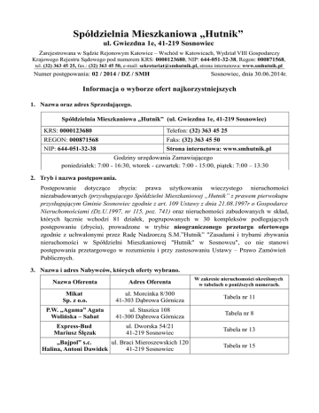Spółdzielnia Mieszkaniowa „Hutnik” ul. Gwiezdna 1e, 41-219 Sosnowiec Zarejestrowana w Sądzie Rejonowym Katowice – Wschód w Katowicach, Wydział VIII Gospodarczy Krajowego Rejestru Sądowego pod numerem KRS: 0000123680, NIP: 644-051-32-38, Regon: 000871568, tel. (32) 363 45 25, fax.: (32) 363 45 50, e-mail: [email protected], strona internetowa: www.smhutnik.pl Numer postępowania: 02 / 2014 / DZ / SMH Sosnowiec, dnia 30.06.2014r. Informacja o wyborze ofert najkorzystniejszych 1. Nazwa oraz adres Sprzedającego. Spółdzielnia Mieszkaniowa „Hutnik” (ul. Gwiezdna 1e, 41-219 Sosnowiec) KRS: 0000123680 Telefon: (32) 363 45 25 REGON: 000871568 Faks: (32) 363 45 50 NIP: 644-051-32-38 Strona internetowa: www.smhutnik.pl Godziny urzędowania Zamawiającego poniedziałek: 7:00 - 16:30, wtorek - czwartek: 7:00 - 15:00, piątek: 7:00 – 13:30 2. Tryb i nazwa postępowania. Postępowanie dotyczące zbycia: prawa użytkowania wieczystego nieruchomości niezabudowanych (przysługującego Spółdzielni Mieszkaniowej „Hutnik” z prawem pierwokupu przysługującym Gminie Sosnowiec zgodnie z art. 109 Ustawy z dnia 21.08.1997r o Gospodarce Nieruchomościami (Dz.U.1997, nr 115, poz. 741) oraz nieruchomości zabudowanych w skład, których łącznie wchodzi 81 działek, pogrupowanych w 30 kompleksów podlegających postępowaniu (zbyciu), prowadzone w trybie nieograniczonego przetargu ofertowego zgodnie z uchwalonymi przez Radę Nadzorczą S.M.”Hutnik” "Zasadami i trybami zbywania nieruchomości w Spółdzielni Mieszkaniowej "Hutnik" w Sosnowcu", co nie stanowi postępowania przetargowego w rozumieniu i przy zastosowaniu Ustawy – Prawo Zamówień Publicznych. 3. Nazwa i adres Nabywców, których oferty wybrano. Nazwa Oferenta Adres Oferenta W zakresie nieruchomości określonych w tabelach o poniższych numerach. Mikat Sp. z o.o. ul. Morcinka 8/300 41-303 Dąbrowa Górnicza Tabela nr 11 P.W. „Agama” Agata Wolińska – Sabat ul. Staszica 108 41-300 Dąbrowa Górnicza Tabela nr 8 Express-Bud Mariusz Ślęzak ul. Dworska 54/21 41-219 Sosnowiec Tabela nr 13 „Bajpol” s.c. ul. Braci Mieroszewskich 120 Halina, Antoni Dawidek 41-219 Sosnowiec Tabela nr 15 4. Uzasadnienie wyboru oferty. Oferty złożone przez Nabywców wskazanych w pkt. 3 powyżej zawierały wszystkie wymagane dokumenty określone w tzw. „Informacjach niezbędnych do przygotowania oferty”, co zostało zweryfikowane przez Członków Komisji Przetargowej. Przedmiotowe oferty stanowią oferty najkorzystniejsze cenowo, uzyskując tym samym w kryterium „Cena” najwyższą ilość punktów wyliczoną matematycznie, według zasad wskazanych w pkt. 7 niniejszych informacji. 5. Nazwy i adresy Nabywców, którzy złożyli oferty. Nazwa Nabywcy Adres Nabywcy W zakresie nieruchomości określonych w tabelach o poniższych numerach. Mikat Sp. z o.o. ul. Morcinka 8/300 41-303 Dąbrowa Górnicza Tabela nr 11 P.W.. „Agama” Agata Wolińska – Sabat ul. Staszica 108 41-300 Dąbrowa Górnicza Tabela nr 8 Kołodziejczyk Janina ul. Kanarków 7 41-200 Sosnowiec Tabela nr 16 Łuszczak Henryka ul. 11 Listopada 169/40 41-219 Sosnowiec Tabela nr 15 Express-Bud Mariusz Ślęzak ul. Dworska 54/21 41-219 Sosnowiec Tabela nr 13 P.P.H.U. „Damaris” Perdak Sławomir ul. Polna 4a 42-530 Dąbrowa Górnicza Tabela nr 15 „Bajpol” s.c. Halina, Antoni Dawidek ul. Mieroszewskich 120 41-219 Sosnowiec Tabela nr 15 Jednocześnie Sprzedający informuje, iż dla pozostałych kompleksów nieruchomości podlegających zbyciu w niniejszym postępowaniu, określonych łącznie w 30 tabelach tzw. "Informacji niezbędnych do przygotowania oferty" nie wpłynęły żadne oferty kupna. 6. Punktacja przyznana Nabywcom w kryterium „Cena”. Nazwa Nabywcy Kryterium - CENA W zakresie nieruchomości określonych w tabelach o poniższych numerach. P.W. „Agama” Agata Wolińska – Sabat 100 pkt. Tabela nr 8 Mikat Sp. z o.o. 100 pkt. Tabela nr 11 Express-Bud Mariusz Ślęzak 100 pkt. Tabela nr 13 Łuszczak Henryka 79,27 pkt. Tabela nr 15 „Bajpol” s.c. Halina, Antoni Dawidek 100 pkt. Tabela nr 15 7. Informacja o Nabywcach wykluczonych z postępowania. Sprzedający informuje, iż z niniejszego postępowania wykluczył poniższego Nabywcę: Nazwa Nabywcy Adres Nabywcy P.P.H.U. „Damaris” Perdak Sławomir ul. Polna 4a 42-530 Dąbrowa Górnicza Uzasadnienie Zgodnie z pkt. 4.1 tzw. „Informacji niezbędnych do przygotowania oferty” oraz „Zasadami i trybem zbywania nieruchomości w Spółdzielni Mieszkaniowej „Hutnik” nabywca, tj. P.P.H.U. „Daramis” składając ofertę dotyczącą nabycia nieruchomości wskazanej w tabeli nr 15 formularza ofertowego winien wnieść wadium w formie pieniężnej w wysokości 5.500,00zł, najdalej na 3 dni przed upływem terminu składania ofert, przelewem na rachunek bankowy Sprzedającego. Skuteczne wniesienie wadium następuje z chwilą wpływu środków pieniężnych na rachunek bankowy Sprzedającego. Termin składania ofert upłynął dnia 24.06.2014r. o godzinie 9:30, a jak wynika z wydruku operacji bankowych Sprzedającego oraz załączonego do oferty nabywcy druku przelewu, wadium zostało zaksięgowane na rachunku Sprzedającego dni 23.06.2014r., tj. bez zachowania terminu, o którym mowa powyżej. Uwzględniając powyższe nabywca został wykluczony z postępowania. Dodatkowo stwierdzić należy, iż oferta nabywcy nie stanowi oferty najkorzystniejszej cenowo. 7. Informacje dodatkowe. Sprzedający informuje, iż postępowanie w części dotyczącej nieruchomości wskazanych w tabeli nr 16 na podstawie pkt. 10.2 tzw. "Informacji niezbędnych do przygotowania oferty" zostało unieważnione decyzją Zarządu dnia 18.06.2014r., tj. przed upływem terminu przeznaczonego na składanie ofer. Przy czym odpowiednia informacja została umieszczona dnia 18.06.2014r. na stronie internetowej Sprzedającego (www.smhutnik.pl). Jednocześnie Sprzedający informuje, iż punktacja wskazana w pkt. 6 niniejszego zawiad