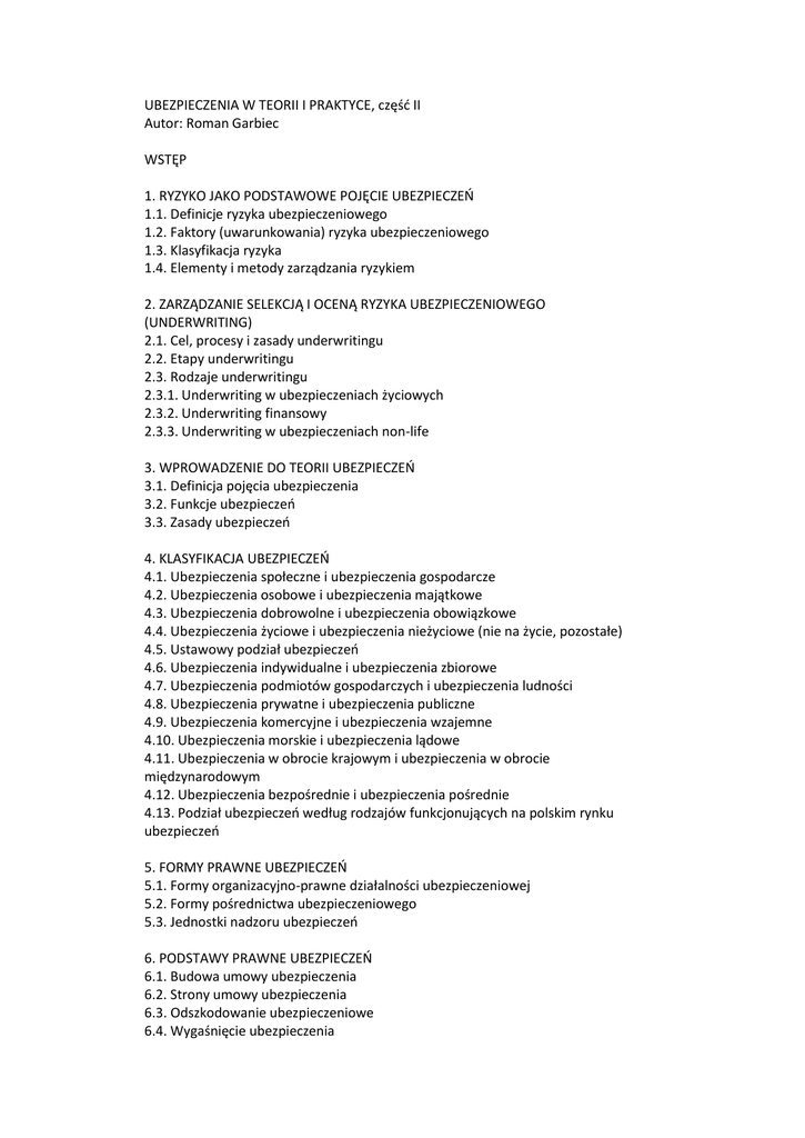 UBEZPIECZENIA W TEORII I PRAKTYCE, część II Autor: Roman Garbiec WSTĘP 1. RYZYKO JAKO PODSTAWOWE POJĘCIE UBEZPIECZEŃ 1.1. Definicje ryzyka ubezpieczeniowego 1.2. Faktory (uwarunkowania) ryzyka ubezpieczeniowego 1.3. Klasyfikacja ryzyka 1.4. Elementy i metody zarządzania ryzykiem 2. ZARZĄDZANIE SELEKCJĄ I OCENĄ RYZYKA UBEZPIECZENIOWEGO (UNDERWRITING) 2.1. Cel, procesy i zasady underwritingu 2.2. Etapy underwritingu 2.3. Rodzaje underwritingu 2.3.1. Underwriting w ubezpieczeniach życiowych 2.3.2. Underwriting finansowy 2.3.3. Underwriting w ubezpieczeniach non-life 3. WPROWADZENIE DO TEORII UBEZPIECZEŃ 3.1. Definicja pojęcia ubezpieczenia 3.2. Funkcje ubezpieczeń 3.3. Zasady ubezpieczeń 4. KLASYFIKACJA UBEZPIECZEŃ 4.1. Ubezpieczenia społeczne i ubezpieczenia gospodarcze 4.2. Ubezpieczenia osobowe i ubezpieczenia majątkowe 4.3. Ubezpieczenia dobrowolne i ubezpieczenia obowiązkowe 4.4. Ubezpieczenia życiowe i ubezpieczenia nieżyciowe (nie na życie, pozostałe) 4.5. Ustawowy podział ubezpieczeń 4.6. Ubezpieczenia indywidualne i ubezpieczenia zbiorowe 4.7. Ubezpieczenia podmiotów gospodarczych i ubezpieczenia ludności 4.8. Ubezpieczenia prywatne i ubezpieczenia publiczne 4.9. Ubezpieczenia komercyjne i ubezpieczenia wzajemne 4.10. Ubezpieczenia morskie i ubezpieczenia lądowe 4.11. Ubezpieczenia w obrocie krajowym i ubezpieczenia w obrocie międzynarodowym 4.12. Ubezpieczenia bezpośrednie i ubezpieczenia pośrednie 4.13. Podział ubezpieczeń według rodzajów funkcjonujących na polskim rynku ubezpieczeń 5. FORMY PRAWNE UBEZPIECZEŃ 5.1. Formy organizacyjno-prawne działalności ubezpieczeniowej 5.2. Formy pośrednictwa ubezpieczeniowego 5.3. Jednostki nadzoru ubezpieczeń 6. PODSTAWY PRAWNE UBEZPIECZEŃ 6.1. Budowa umowy ubezpieczenia 6.2. Strony umowy ubezpieczenia 6.3. Odszkodowanie ubezpieczeniowe 6.4. Wygaśnięcie ubezpieczenia 6.5. przedawnienie roszczeń ubezpieczeniowych 7. POJĘCIE I ISTOTA REASEKURACJI IKOASEKURACJI 7.1. Istota reasekuracji, retrocesji i koasekuracji 7.2. Metody i formy reasekuracji 8.FINANSE ZAKŁADU UBEZPIECZEŃ 8.1. Zasady ustalania składki ubezpieczeniowej 8.1.2. Składki w ubezpieczeniach majątkowych 8.1.3. Składki w ubezpieczeniach życiowych 8.2. Analiza jakościowa i ilościowa sytuacji finansowej zakładu ubezpieczeń 8.3. Pasywa zakładu ubezpieczeń 8.4. Aktywa zakładu ubezpieczeń 9. MARKETING UBEZPIECZENIOWY 9.1. Badania marketingowe na rynku ubezpieczeń 9.2. Strategia marketingowa 9.3. Marketing-mix w ubezpieczeniach 9.4. Dystrybucja usług ubezpieczeniowych 10. UBEZPIECZENIA ZDROWOTNE 10.1. zasady ubezpieczenia zdrowotnego 10.2. obowiązek ubezpieczenia zdrowotnego 10.3. Składki na ubezpieczenia zdrowotne 10.4. Organizacja udzielania świadczeń z ubezpieczenia zdrowotnego Bibliografia Załączniki