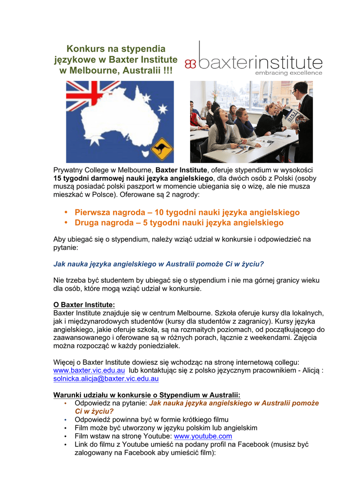 Konkurs na stypendia językowe w Baxter Institute w Melbourne, Australii !!! Prywatny College w Melbourne, Baxter Institute, oferuje stypendium w wysokości 15 tygodni darmowej nauki języka angielskiego, dla dwóch osób z Polski (osoby muszą posiadać polski paszport w momencie ubiegania się o wizę, ale nie musza mieszkać w Polsce). Oferowane są 2 nagrody: • Pierwsza nagroda – 10 tygodni nauki języka angielskiego • Druga nagroda – 5 tygodni nauki języka angielskiego Aby ubiegać się o stypendium, należy wziąć udział w konkursie i odpowiedzieć na pytanie: Jak nauka języka angielskiego w Australii pomoże Ci w życiu? Nie trzeba być studentem by ubiegać się o stypendium i nie ma górnej granicy wieku dla osób, które mogą wziąć udział w konkursie. O Baxter Institute: Baxter Institute znajduje się w centrum Melbourne. Szkoła oferuje kursy dla lokalnych, jak i międzynarodowych studentów (kursy dla studentów z zagranicy). Kursy języka angielskiego, jakie oferuje szkoła, są na rozmaitych poziomach, od początkującego do zaawansowanego i oferowane są w różnych porach, łącznie z weekendami. Zajęcia można rozpocząć w każdy poniedziałek. Więcej o Baxter Institute dowiesz się wchodząc na stronę internetową collegu: www.baxter.vic.edu.au lub kontaktując się z polsko języcznym pracownikiem - Alicją : [email protected] Warunki udziału w konkursie o Stypendium w Australii: • Odpowiedz na pytanie: Jak nauka języka angielskiego w Australii pomoże Ci w życiu? • Odpowiedź powinna być w formie krótkiego filmu • Film może być utworzony w języku polskim lub angielskim • Film wstaw na stronę Youtube: www.youtube.com • Link do filmu z Youtube umieść na podany profil na Facebook (musisz być zalogowany na Facebook aby umieścić film): • • • • • • • • • • • https://www.facebook.com/pages/Stypendia-w-Australii/575362492485023 Proszę nie umieszczać samego filmu, jedynie link do filmu Link do filmu musi być umieszczony przed 1 sierpnia 2013r. Każdy uczestnik konkursu może zgłosić tylko jeden film Wraz z linkiem na wskazanej stronie Facebook podaj swoje pełne imię i nazwisko oraz tytuł filmu (jeżeli nie chcesz podawać imienia i nazwiska na Facebook, prześlij nam dane mailem) Po wstawieniu linku na Facebook wyślij maila na adres: [email protected] i podaj: -‐ swoje pełne imię i nazwisko -‐ miejsce zamieszkania -‐ tytuł filmu (jeżeli zamieściłeś na Facebook) -‐ datę kiedy wstawiłeś link filmu na wskazany profil Facebook Zwycięzcy muszą rozpocząć naukę w Baxter Institute w przeciągu 6 miesięcy od ogłoszenia wyników konkursu Stypendium nie może być przekazane innej osobie Zwycięzcy musza pokryć koszty związane z biletem lotniczym do Australii, wizą (oferujemy gratisowa pomoc w załatwieniu wizy) i materiałami do nauki (tylko w przypadku kontynuacji nauki w Baxter Institute) Konkurs jest organizowany przez Baxter Institute wspólnie z firmą Macro Migration Solutions, w Melbourne, Australii Zwycięzcami konkursu będą osoby, których film będzie najwyżej oceniony przez komisję Zwycięzcy stypendium zostaną powiadomieni drogą mailową dnia 10 sierpnia 2013r. Również tego dnia na wskazanym profilu Facebook - Stypendia w Australii, zostaną opublikowane wyniki konkursu: https://www.facebook.com/pages/Stypendia-w-Australii/575362492485023 Wiza Jeżeli podejmujesz w Australii naukę poniżej 3 miesięcy, możesz ubiegać się o wizę turystyczną lub wizę studencką. Będąc na wizie studenckiej przysługuje prawo do pracy (prawo do pracy wchodzi w dniu rozpoczęciu kursu), do 40 godzin na 2 tygodnie w trakcie pobierania nauki, a podczas przerw w nauce prawo do pracy na pełny etat (prawa do pracy nie mają osoby będące na wizach turystycznych). Osoby starające się o wizę studencką mogą przyjechać do Australii z rodziną (wówczas rodzina tez otrzymuje prawo do pracy bez obowiązku nauki). Osoby ubiegające się o wizę studencka musza również posiadać ubezpieczenie zdrowotne na okres pobytu w Australii. Odpowiedzi na wiele pytań znajdziecie na stronie konkursu Facebook: https://www.facebook.com/pages/Stypendia-w-Australii/575362492485023 Inne pytania związane ze sprawami wizowymi proszę kierować do Agentki Imigracyjnej w Melbourne, Hannah Malewska [email protected] Skype: macroms Telefon + 61 3 8682 9256. Pytania związane ze szkołą oraz warunkami stypendium proszę kierować do pracownika Baxter Institute, Alicji Solnickiej: [email protected] , w języku polskim lub angielskim. POWODZENIA !!!