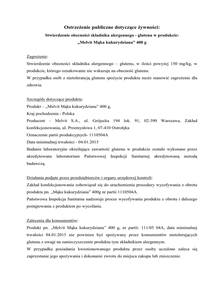Ostrzeżenie publiczne dotyczące żywności: Stwierdzenie obecności składnika alergennego - glutenu w produkcie: „Melvit Mąka kukurydziana” 400 g Zagrożenie: Stwierdzenie obecności składnika alergennego – glutenu, w ilości powyżej 150 mg/kg, w produkcie, którego oznakowanie nie wskazuje na obecność glutenu. W przypadku osób z nietolerancją glutenu spożycie produktu może stanowić zagrożenie dla zdrowia. Szczegóły dotyczące produktu: Produkt – „Melvit Mąka kukurydziana” 400 g, Kraj pochodzenia - Polska Producent – Melvit S.A., ul. Grójecka 194 lok. 91, 02-390 Warszawa, Zakład konfekcjonowania, ul. Przemysłowa 1, 07-410 Ostrołęka Oznaczenie partii produkcyjnych- 1110504A Data minimalnej trwałości - 04.01.2015 Badanie laboratoryjne określające zawartość glutenu w produkcie zostało wykonane przez akredytowane laboratorium Państwowej Inspekcji Sanitarnej akredytowaną metodą badawczą. Działania podjęte przez przedsiębiorców i organy urzędowej kontroli: Zakład konfekcjonowania zobowiązał się do uruchomienia procedury wycofywania z obrotu produktu pn. „Mąka kukurydziana” 400g nr partii 1110504A. Państwowa Inspekcja Sanitarna nadzoruje proces wycofywania produktu z obrotu i dalszego postępowania z produktem po wycofaniu. Zalecenia dla konsumentów: Produkt pn. „Melvit Mąka kukurydziana” 400 g, nr partii: 111/05 04A, data minimalnej trwałości 04.01.2015 nie powinien być spożywany przez konsumentów nietolerujących glutenu z uwagi na zanieczyszczenie produktu tym składnikiem alergennym. W przypadku posiadania kwestionowanego produktu przez osoby uczulone zaleca się zaprzestanie jego spożywania i dokonanie zwrotu do miejsca zakupu lub zniszczenie. Zdjęcia produktu: