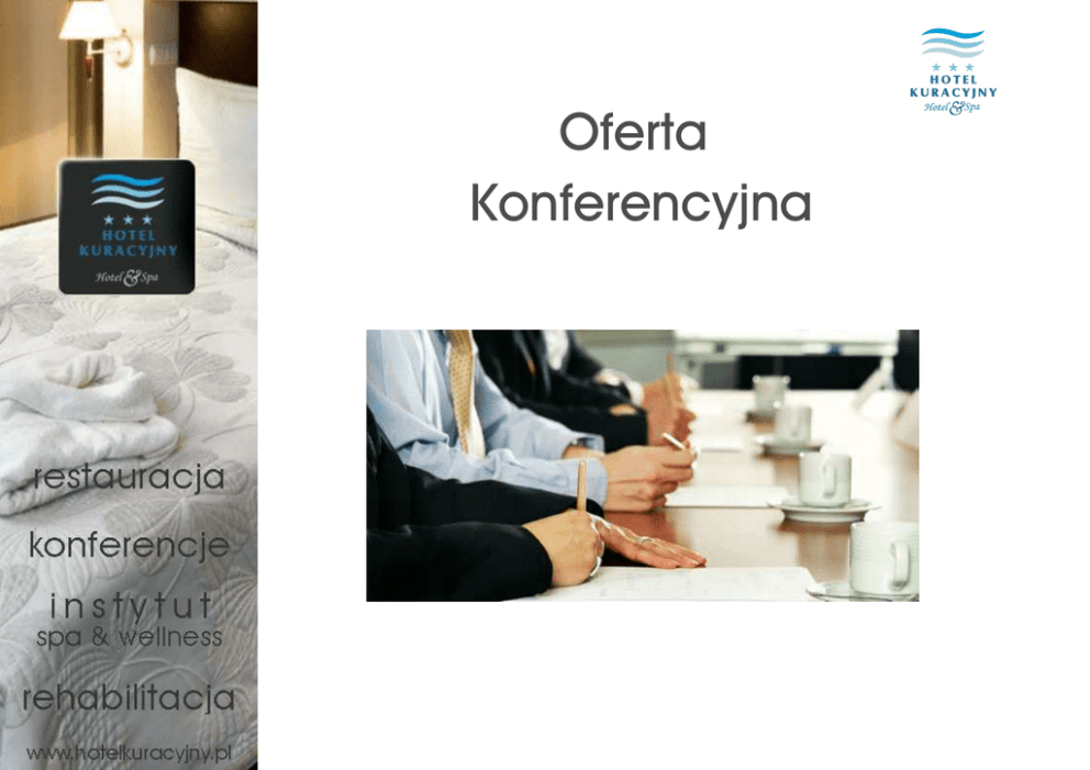 Oferta Konferencyjna Szanowni Państwo Mamy przyjemność zaprezentować Państwu ciekawą ofertę usług konferencyjnych w Hotelu Kuracyjnym*** w Gdyni Orłowie. Hotel Kuracyjny *** to kompleksowy obiekt, połoŜony w sercu trójmiasta na granicy Gdyni i Sopotu, który dysponuje: 27 pokojami, restauracją i kawiarnią, salą bankietową i konferencyjną na około 100 os. oraz Instytutem SPA & Wellness VENICE. Pokoje Hotel Kuracyjny oddaje do dyspozycji gości 27 eleganckich oraz komfortowo wyposaŜonych pokoi i apartamentów, w których jednocześnie moŜna przyjąć 49 osób. Struktura pokoi hotelowych obejmuje 6 pokoi jednosobowych, 16 pokoi dwuosobowych (oferowanych równieŜ jako jednoosobowe), 4 pokoje dwuosobowe typu LUX oraz 1 apartament business - perełkę hotelu. Konferencje Do dyspozycji naszych Gości jest w pełni wyposaŜona, klimatyzowana sala konferencyjno - balowa o powierzchni 120 m2. Jest idealnym miejscem do organizacji konferencji, spotkań biznesowych, szkoleń, prezentacji, imprez, bali oraz bankietów do 100 osób. W apartamencie business zachęcamy do organizacji kameralnych spotkań do 8 osób. WyposaŜenie sali: - ekran - rzutnik multimedialny - flipchart + markery - nagłośnienie - mikrofony - klimatyzacja - internet bezprzewodowy - telewizja W przerwie konferencji proponujemy róŜne warianty przerw kawowych oraz lunchy. Do wyboru między innymi: Sandwicze, kanapeczki, tatinki z szynką, łososiem, serem Ciastka francuskie Racuchy domowe z jabłkami Naleśniczki Kruche ciasteczka Ciasta domowe ŚwieŜe owoce ŚwieŜo parzona kawa Wybór herbat Woda z miętą i cytryną Soki owocowe Cennik wynajęcia sali konferencyjnej Wynajęcie sali „pół dnia” (do 4 godz) - 500,00 pln/ 1 dzień Wynajęcie sali „cały dzień” (do 8 godz) - 800,00 pln/ 1 dzień W cenie wynajęcia: Rzutnik multimedialny, ekran, nagłośnienie, flipchart, markery Cennik przerw kawowych i lunchy Przerwy kawowe – od 9,00 – 65,00 pln / os. Lunch – od 60,00 – 75,00 pln / os. Wynajęcie apartamentu Business - 600,00 pln / 1 dzień W przypadku pytań bardzo proszę o kontakt. Alina Feggaras Specjalista d/s Marketingu [email protected] tel. 58 66 87 800 www.hotelkuracyjny.pl tel. 58 66 77 823 [email protected]