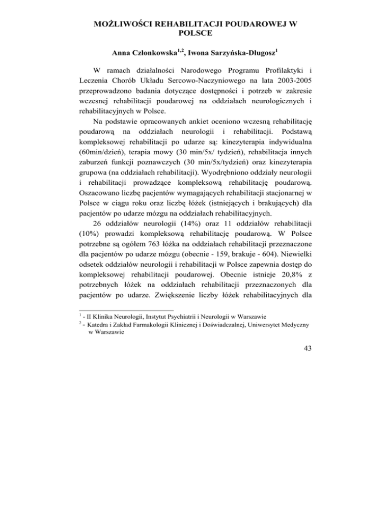 MOŻLIWOŚCI REHABILITACJI POUDAROWEJ W POLSCE Anna Członkowska1,2, Iwona Sarzyńska-Długosz1 W ramach działalności Narodowego Programu Profilaktyki i Leczenia Chorób Układu Sercowo-Naczyniowego na lata 2003-2005 przeprowadzono badania dotyczące dostępności i potrzeb w zakresie wczesnej rehabilitacji poudarowej na oddziałach neurologicznych i rehabilitacyjnych w Polsce. Na podstawie opracowanych ankiet oceniono wczesną rehabilitację poudarową na oddziałach neurologii i rehabilitacji. Podstawą kompleksowej rehabilitacji po udarze są: kinezyterapia indywidualna (60min/dzień), terapia mowy (30 min/5x/ tydzień), rehabilitacja innych zaburzeń funkcji poznawczych (30 min/5x/tydzień) oraz kinezyterapia grupowa (na oddziałach rehabilitacji). Wyodrębniono oddziały neurologii i rehabilitacji prowadzące kompleksową rehabilitację poudarową. Oszacowano liczbę pacjentów wymagających rehabilitacji stacjonarnej w Polsce w ciągu roku oraz liczbę łóżek (istniejących i brakujących) dla pacjentów po udarze mózgu na oddziałach rehabilitacyjnych. 26 oddziałów neurologii (14%) oraz 11 oddziałów rehabilitacji (10%) prowadzi kompleksową rehabilitację poudarową. W Polsce potrzebne są ogółem 763 łóżka na oddziałach rehabilitacji przeznaczone dla pacjentów po udarze mózgu (obecnie - 159, brakuje - 604). Niewielki odsetek oddziałów neurologii i rehabilitacji w Polsce zapewnia dostęp do kompleksowej rehabilitacji poudarowej. Obecnie istnieje 20,8% z potrzebnych łóżek na oddziałach rehabilitacji przeznaczonych dla pacjentów po udarze. Zwiększenie liczby łóżek rehabilitacyjnych dla 1 2 - II Klinika Neurologii, Instytut Psychiatrii i Neurologii w Warszawie - Katedra i Zakład Farmakologii Klinicznej i Doświadczalnej, Uniwersytet Medyczny w Warszawie 43 pacjentów po udarze może przyczynić się do zmniejszenia odsetka osób niepełnosprawnych wśród pacjentów po udarze. Słowa kluczowe: udar, kompleksowa rehabilitacja poudarowa, potrzeby Udar mózgu stanowi główną przyczynę niepełnosprawności w populacji osób dorosłych (1). Wśród pacjentów, którzy przeżyli udar w 6 miesięcy od jego wystąpienia: 48% ma niedowład połowiczy, 22% nie jest w stanie samodzielnie chodzić, 24-53% potrzebuje pomocy w czynnościach dnia codziennego, 12-18% ma afazję (2,3). Aby osiągnąć poprawę jakości życia osób po udarze dąży się do poprawy diagnostyki i leczenia chorych z udarem oraz właściwej, wczesnej kompleksowej rehabilitacji tych chorych (4-6). Kompleksowa rehabilitacja wymaga stworzenia interdyscyplinarnego zespołu rehabilitacyjnego, w którego składzie będzie: lekarz neurolog, specjalista rehabilitacji medycznej, fizjoterapeuta, logopeda, neuropsycholog, terapeuta zajęciowy, pracownik socjalny i pielęgniarki (ze znajomością tematyki rehabilitacji). Zespół musi mieć możliwość współpracy z konsultantami z innych dziedzin (np. ortopedą, psychiatrą, urologiem, kardiologiem, internistą) (7). Zapewnienie skutecznej rehabilitacji poudarowej wymaga rozwoju całego systemu obejmującego intensywną opiekę, rehabilitację na oddziałach neurologii zaczynaną jak najwcześniej po udarze, kompleksową rehabilitację na oddziałach rehabilitacji, a także usprawnianie w warunkach ambulatoryjnych oraz zabezpieczenie opieki domowej (8). W ramach działalności Narodowego Programu Profilaktyki i Leczenia Chorób Układu Sercowo-Naczyniowego na lata 2003-2005 (POLKARD 2003-2005) przeprowadzono badania dotyczące dostępności wczesnej rehabilitacji poudarowej na oddziałach neurologicznych i rehabilitacyjnych w Polsce (9) oraz oceniono na tej podstawie jakie są potrzeby w zakersie usprawniania pacjentów po przebytym udarze (10). 44 Opracowano 2 kwestionariusze pytań oceniające strukturę i wyposażenie oddziałów neurologicznych i rehabilitacyjnych oraz rodzaj, częstotliwość i czas trwania zajęć prowadzonych na tych oddziałach. Ankiety rozesłano do wszystkich oddziałów neurologicznych oraz oddziałów rehabilitacyjnych przyjmujących pacjentów po przebytym udarze mózgu celem wczesnej rehabilitacji poudarowej na terenie całego kraju w 2004 roku. Sprawdzono i zweryfikowano telefonicznie wszystkie nadesłane ankiety. Po przeprowadzeniu analizy danych wyodrębniono oddziały prowadzące rutynowo kompleksową rehabilitację. Kompleksową rehabilitację na oddziale neurologii zdefiniowano w oparciu o wytyczne opracowane przez zespół ekspertów Narodowego Programu Profilaktyki i Leczenia Udaru Mózgu (11) - jako zajęcia obejmujące: a) kinezyterapię – minimum 60 min/ dobę b) rehabilitację zaburzeń mowy – minimum 30 min, 5 razy w tygodniu c) rehabilitację zaburzeń innych funkcji behawioralno-poznawczych (tj. uwagi, spostrzegania, pamięci, myślenia, zdolności przestrzennych i konstrukcyjnych, funkcji wykonawczych - organizowania i kontroli każdej złożonej aktywności poznawczo-emocjonalnej) – minimum 30 min, 5 razy w tygodniu. Kompleksowa rehabilitacja na oddziale rehabilitacji obejmuje wszystkie działania prowadzone na oddziale neurologii oraz dodatkowo kinezyterapię grupową. Otrzymano wypełnione ankiety od ordynatorów 191 z 215 oddziałów neurologicznych (88,8%). Na 26 oddziałach neurologii (14%) prowadzona jest rutynowo kompleksowa rehabilitacja poudarowa (ryc.1). Uzyskano wypełnione ankiety od ordynatorów 115 (66,9%) ze 172 oddziałów rehabilitacyjnych, które przyjmują pacjentów po przebytym udarze mózgu celem wczesnej rehabilitacji poudarowej. Jedynie 11 z nich (10%) deklarowało rutynowe prowadzenie kompleksowej rehabilitacji poudarowej (ryc.2) (9). 45 Ryc.1. Rozmieszczenie oddziałów neurologicznych prowadzących kompleksową rehabilitację poudarową na terenie Polski w 2004 roku Legenda: ■ – proponowane nowe oddziały tworzące sieć oddziałów wczesnej rehabilitacji poudarowej ■ – istniejące oddziały prowadzące wczesną kompleksową rehabilitację poudarową n/n – lic
