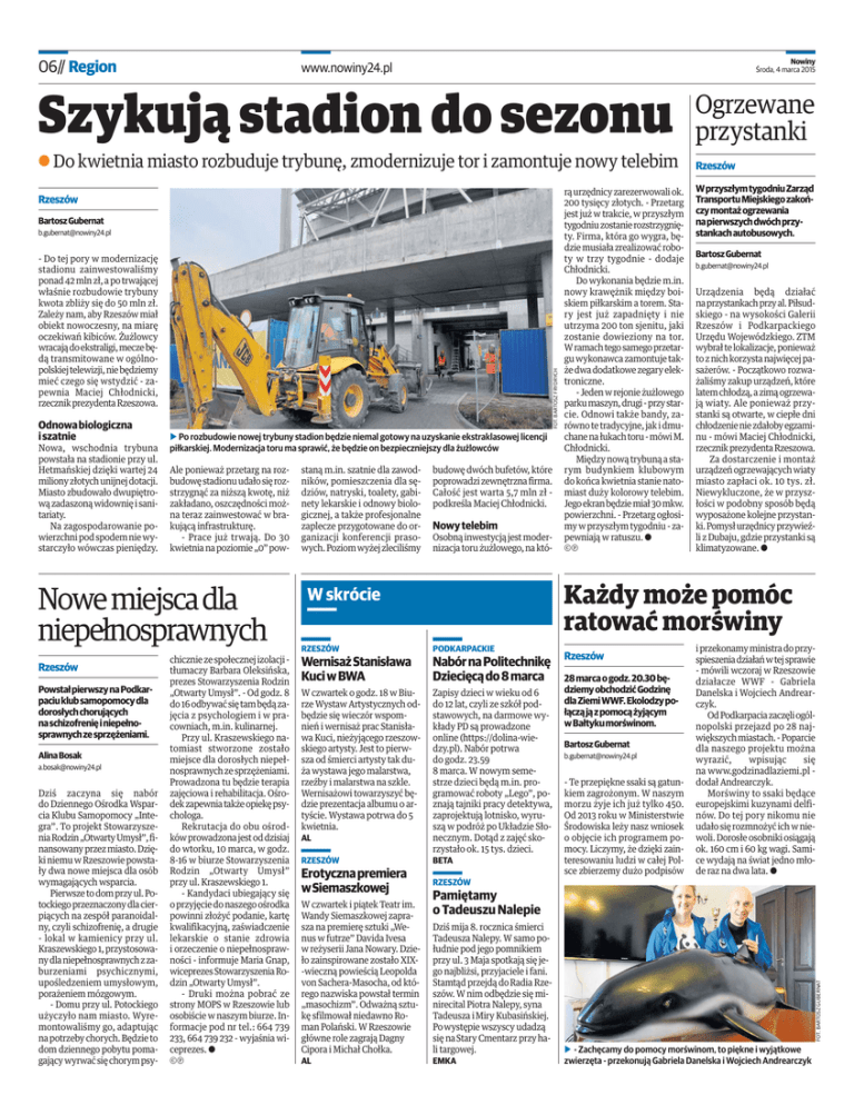 06// Region Nowiny Środa, 4 marca 2015 www.nowiny24.pl Szykują stadion do sezonu Ogrzewane przystanki A Do kwietnia miasto rozbuduje trybunę, zmodernizuje tor i zamontuje nowy telebim Rzeszów Rzeszów Bartosz Gubernat [email protected] Nowa, wschodnia trybuna powstała na stadionie przy ul. Hetmańskiej dzięki wartej 24 miliony złotych unijnej dotacji. Miasto zbudowało dwupiętrową zadaszoną widownię i sanitariaty. Na zagospodarowanie powierzchni pod spodem nie wystarczyło wówczas pieniędzy. b Po rozbudowie nowej trybuny stadion będzie niemal gotowy na uzyskanie ekstraklasowej licencji piłkarskiej. Modernizacja toru ma sprawić, że będzie on bezpieczniejszy dla żużlowców Ale ponieważ przetarg na rozbudowę stadionu udało się rozstrzygnąć za niższą kwotę, niż zakładano, oszczędności można teraz zainwestować w brakującą infrastrukturę. - Prace już trwają. Do 30 kwietnia na poziomie „0” pow- Nowe miejsca dla niepełnosprawnych Rzeszów Powstał pierwszy na Podkarpaciu klub samopomocy dla dorosłych chorujących na schizofrenię i niepełnosprawnych ze sprzężeniami. Alina Bosak [email protected] Dziś zaczyna się nabór do Dziennego Ośrodka Wsparcia Klubu Samopomocy „Integra”. To projekt Stowarzyszenia Rodzin „Otwarty Umysł”, finansowany przez miasto. Dzięki niemu w Rzeszowie powstały dwa nowe miejsca dla osób wymagających wsparcia. Pierwsze to dom przy ul. Potockiego przeznaczony dla cierpiących na zespół paranoidalny, czyli schizofrenię, a drugie - lokal w kamienicy przy ul. Kraszewskiego 1, przystosowany dla niepełnosprawnych z zaburzeniami psychicznymi, upośledzeniem umysłowym, porażeniem mózgowym. - Domu przy ul. Potockiego użyczyło nam miasto. Wyremontowaliśmy go, adaptując na potrzeby chorych. Będzie to dom dziennego pobytu pomagający wyrwać się chorym psy- chicznie ze społecznej izolacji tłumaczy Barbara Oleksińska, prezes Stowarzyszenia Rodzin „Otwarty Umysł”. - Od godz. 8 do 16 odbywać się tam będą zajęcia z psychologiem i w pracowniach, m.in. kulinarnej. Przy ul. Kraszewskiego natomiast stworzone zostało miejsce dla dorosłych niepełnosprawnych ze sprzężeniami. Prowadzona tu będzie terapia zajęciowa i rehabilitacja. Ośrodek zapewnia także opiekę psychologa. Rekrutacja do obu ośrodków prowadzona jest od dzisiaj do wtorku, 10 marca, w godz. 8-16 w biurze Stowarzyszenia Rodzin „Otwarty Umysł” przy ul. Kraszewskiego 1. - Kandydaci ubiegający się o przyjęcie do naszego ośrodka powinni złożyć podanie, kartę kwalifikacyjną, zaświadczenie lekarskie o stanie zdrowia i orzeczenie o niepełnosprawności - informuje Maria Gnap, wiceprezes Stowarzyszenia Rodzin „Otwarty Umysł”. - Druki można pobrać ze strony MOPS w Rzeszowie lub osobiście w naszym biurze. Informacje pod nr tel.: 664 739 233, 664 739 232 - wyjaśnia wiceprezes. a ą staną m.in. szatnie dla zawodników, pomieszczenia dla sędziów, natryski, toalety, gabinety lekarskie i odnowy biologicznej, a także profesjonalne zaplecze przygotowane do organizacji konferencji prasowych. Poziom wyżej zleciliśmy budowę dwóch bufetów, które poprowadzi zewnętrzna firma. Całość jest warta 5,7 mln zł podkreśla Maciej Chłodnicki. Nowy telebim Osobną inwestycją jest modernizacja toru żużlowego, na któ- RZESZÓW PODKARPACKIE Wernisaż Stanisława Kuci w BWA Nabór na Politechnikę Dziecięcą do 8 marca W czwartek o godz. 18 w Biurze Wystaw Artystycznych odbędzie się wieczór wspomnień i wernisaż prac Stanisława Kuci, nieżyjącego rzeszowskiego artysty. Jest to pierwsza od śmierci artysty tak duża wystawa jego malarstwa, rzeźby i malarstwa na szkle. Wernisażowi towarzyszyć będzie prezentacja albumu o artyście. Wystawa potrwa do 5 kwietnia. AL Zapisy dzieci w wieku od 6 do 12 lat, czyli ze szkół podstawowych, na darmowe wykłady PD są prowadzone online (https://dolina-wiedzy.pl). Nabór potrwa do godz. 23.59 8 marca. W nowym semestrze dzieci będą m.in. programować roboty „Lego”, poznają tajniki pracy detektywa, zaprojektują lotnisko, wyruszą w podróż po Układzie Słonecznym. Dotąd z zajęć skorzystało ok. 15 tys. dzieci. BETA Erotyczna premiera wSiemaszkowej W czwartek i piątek Teatr im. Wandy Siemaszkowej zaprasza na premierę sztuki „Wenus w futrze” Davida Ivesa w reżyserii Jana Nowary. Dzieło zainspirowane zostało XIX-wieczną powieścią Leopolda von Sachera-Masocha, od którego nazwiska powstał termin „masochizm”. Odważną sztukę sfilmował niedawno Roman Polański. W Rzeszowie główne role zagrają Dagny Cipora i Michał Chołka. AL Bartosz Gubernat [email protected] Urządzenia będą działać na przystankach przy al. Piłsudskiego - na wysokości Galerii Rzeszów i Podkarpackiego Urzędu Wojewódzkiego. ZTM wybrał te lokalizacje, ponieważ to z nich korzysta najwięcej pasażerów. - Początkowo rozważaliśmy zakup urządzeń, które latem chłodzą, a zimą ogrzewają wiaty. Ale ponieważ przystanki są otwarte, w ciepłe dni chłodzenie nie zdałoby egzaminu - mówi Maciej Chłodnicki, rzecznik prezydenta Rzeszowa. Za dostarczenie i montaż urządzeń ogrzewających wiaty miasto zapłaci ok. 10 tys. zł. Niewykluczone, że w przyszłości w podobny sposób będą wyposażone kolejne przystanki. Pomysł urzędnicy przywieźli z Dubaju, gdzie przystanki są klimatyzowane. a Każdy może pomóc ratować morświny W skrócie RZESZÓW W przyszłym tygodniu Zarząd Transportu Miejskiego zakończy montaż ogrzewania na pierwszych dwóch przystankach autobusowych. Rzeszów 28 marca o godz. 20.30 będziemy obchodzić Godzinę dla Ziemi WWF. Ekolodzy połączą ją z pomocą żyjącym w Bałtyku morświnom. Bartosz Gubernat [email protected] - Te przepiękne ssaki są gatunkiem zagrożonym. W naszym morzu żyje ich już tylko 450. Od 2013 roku w Ministerstwie Środowiska leży nasz wniosek o objęcie ich programem pomocy. Liczymy, że dzięki zainteresowaniu lud