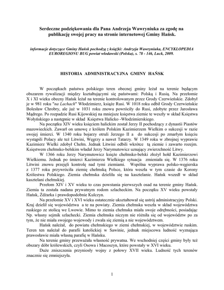 Serdeczne podziękowania dla Pana Andrzeja Wawryniuka za zgodę na publikację swojej pracy na stronie internetowej Gminy Hańsk. informacje dotyczące Gminy Hańsk pochodzą z książki: Andrzeja Wawryniuka, ENCYKLOPEDIA EUROREGIONU BUG powiat włodawski (Polska), s. 78 - 146, Luck, 2009. HISTORIA ADMINISTRACYJNA GMINY HAŃSK W początkach państwa polskiego teren obecnej gminy leżał na terenie będącym obszarem rywalizacji między kształtującymi się państwami: Polską i Rusią. Na przełomie X i XI wieku obecny Hańsk leżał na terenie kontrolowanym przez Grody Czerwieńskie. Zdobył je w 981 roku "na Lachach" Włodzimierz, książe Rusi. W 1018 roku odbił Grody Czerwieńskie Bolesław Chrobry, ale już w 1031 roku znowu powróciły do Rusi, zdobyte przez Jarosława Mądrego. Po rozpadzie Rusi Kijowskiej na mniejsze księstwa ziemie te weszły w skład Księstwa Wołyńskiego a następnie w skład Księstwa Halicko -Włodzimierskiego. Na początku XIV wieku księciem halickim został Jerzy II pochodzący z dynastii Piastów mazowieckich. Zawarł on umowę z królem Polskim Kazimierzem Wielkim o sukcesji w razie swojej śmierci. W 1340 roku bojarzy otruli Jerzego II a do sukcesji po zmarłym księciu wystąpili Polacy ale też Litwini, Węgrzy a nawet Tatarzy. W 1349 roku w zbrojnej wyprawie Kazimierz Wielki zdobył Chełm. Jednak Litwini odbili wkrótce tą ziemie i zawarto rozejm. Księstwem chełmsko-bełskim władał Jerzy Narymutowicz uznający zwierzchność Litwy. W 1366 roku Jerzy Narymutowicz księże chełmsko-bełski złożył hołd Kazimierzowi Wielkiemu. Jednak po śmierci Kazimierza Wielkiego sytuacja zmieniała się. W 1376 roku Litwini znowu przejęli kontrolę nad tymi ziemiami. Wspólna wyprawa polsko-węgierska z 1377 roku przywróciła ziemię chełmską Polsce, która weszła w tym czasie do Korony Królestwa Polskiego. Ziemia chełmska dzieliła się na kasztelanie. Hańsk wszedł w skład kasztelani chełmskiej. Przełom XIV i XV wieku to czas powstania pierwszych osad na terenie gminy Hańsk. Ziemia ta została nadana prywatnym rodom szlacheckim. Na początku XV wieku powstały Hańsk, Żdżarka i prawdopodobnie Kulczyn. Na przełomie XV i XVI wieku ostatecznie ukształtował się ustrój administracyjny Polski. Kraj dzielił się województwa a te na powiaty. Ziemia chełmska weszła w skład województwa ruskiego ze stolicą we Lwowie. Mimo to ziemia chełmska miała swoje odrębności, posiadając Np. własny sejmik szlachecki. Ziemia chełmska niczym nie różniła się od województw po za tym, że nie miała swojego wojewody i zwała się ziemią a nie województwem. Hańsk należał, do powiatu chełmskiego w ziemi chełmskiej, w województwie ruskim. Teren ten należał do parafii katolickiej w Sawinie, jednak miejscowa ludność wyznająca prawosławie miała własną parafię w Hańsku. Na terenie gminy przeważała własność prywatna. We wschodniej części gminy były też obszary dóbr królewskich, czyli Osowa i Macoszyn, które powstały w XVI wieku. Duże zniszczenia przyniosły wojny z połowy XVII wieku. Ludność tych terenów znacznie się zmniejszyła. 1 W 1772 roku nastąpił I rozbiór Polski. Lwów, stolica województwa ruskiego wszedł w skład państwa austriackiego, pogłębiło to samodzielność ziemi chełmskiej, której szlachta walczyła o to, aby nie przyłączać tej ziemi do żadnego z województw. W 1793 roku władze polskie zreorganizowały podział administracyjny I Rzeczpospolitej. Powstało województwo lubelskie oraz chełmskie. Gmina Hańsk weszła w skład województwa chełmskiego. Ten stan nie trwał długo, ponieważ w 1795 roku tereny województwa lubelskiego i chełmskiego znalazły się w III zaborze austriackim. Hańsk znalazł się w tak zwanej Galicji Zachodniej, która podzielona była na cyrkuły , w tym cyrkuł lubelski wraz z Hańskiem. W 1809 roku w wyniku wojen napoleońskich, te ziemie przyłączono do Księstwa Warszawskiego. W 1810 roku Księstwo podzielono na departamenty i powiaty. Obszar dzisiejszej gminy znalazł się w departamencie siedleckim. W 1815 roku upadło Księstwo Warszawskie a na jego gruzach powstało Królestwo Polskie pod berłem cara. Rosjanie początkowo zostawili podział na departamenty i powiaty z tym, że departamenty nazwano województwami. Dodatkowo podzielono województwa na obwody skupiające po dwa lub trzy powiaty. W ten sposób Hańsk znalazł się w obwodzie radzyńskim i województwie podlaskim. Na początku XIX wieku obszar dzisiejszej gminy był jeszcze słabo zaludniony. Przeważała ludność wyznania greckokatolickiego. W 1845 roku obwody stały się powiatami, a dawne powiaty okręgami, nie mającymi już większego znaczenia. Zamiast województw były już gubernie. Hańsk znalazł się więc w składzie powiatu radzyńskiego w guberni podlaskiej. Obszar gminy wchodził w skład powiatu radzyńskiego aż do 1867 roku. W 1863 roku wybuchło powstanie styczniowe. Liczne lasy w tej okolicy dawały schronienie powstańcom. Dochodziło tu również do starć w wojskami rosyjskimi. Rok 1864 przyniósł ogromne zmiany na polskiej wsi. Na mocy ukazu carskiego dokonano uwłaszczenia chłopów. Dotychczasowe obszary dworskie zostały uwłaszczone pomiędzy użytkujących je chłopów, jednak część folwarków pozostała w rękach szlachty. Drugim ważnym wydarzeniem z tego okresu było utworzenie samorządowych gmin wiejskich. Gminę tworzyły zarówno grunty włościańskie (chłopskie) jak i dworskie (folwarki). Częściami składowymi były gromady (wsie) na czele z sołtysem, którego wybierało zgromadzenie gromadzkie. Organem uchwałodawczym gminy było zebranie gminne, na którym prawo głosu mieli gospodarze posiadający co najmniej 3 morgi gruntu. Zebranie gminne wybierało wójta i ławników (zarząd gminy). Wójt miał uprawnienia policyjno-administracyjne i sądownicze. Wójt gminy musiał posiadać przynajmniej 25 lat. Musiał też mieć przynajm