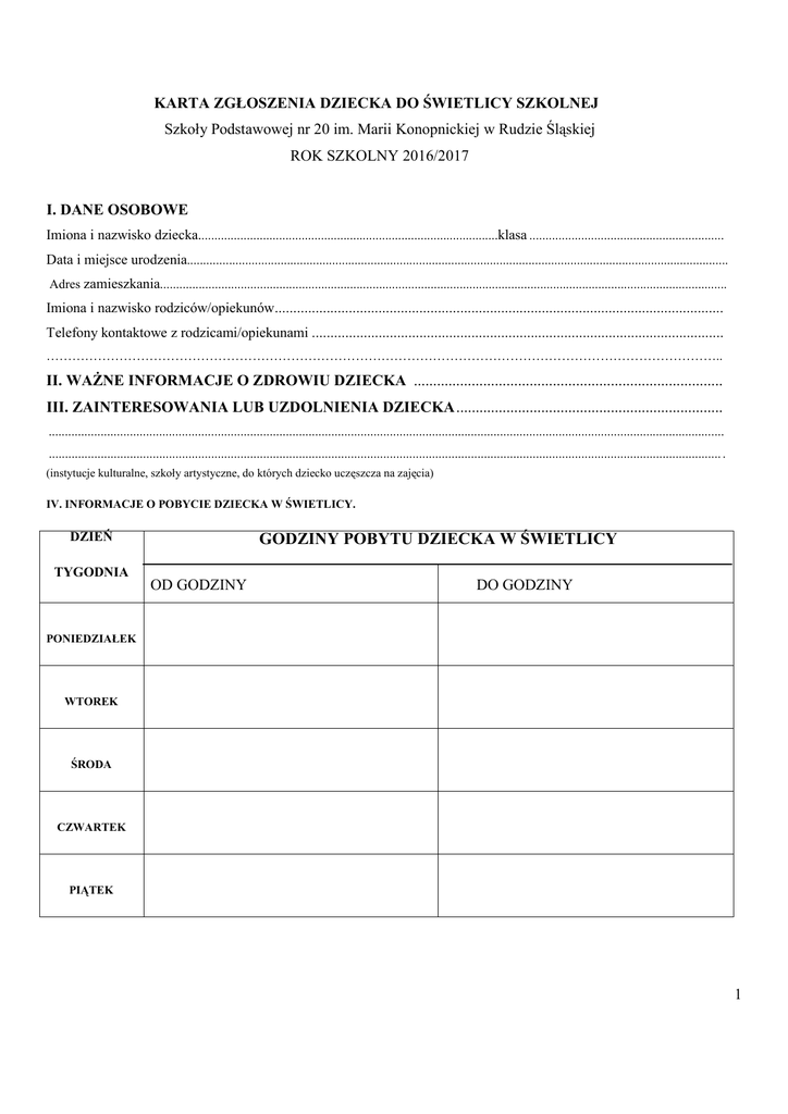 KARTA ZGŁOSZENIA DZIECKA DO ŚWIETLICY SZKOLNEJ Szkoły Podstawowej nr 20 im. Marii Konopnickiej w Rudzie Śląskiej ROK SZKOLNY 2016/2017 I. DANE OSOBOWE Imiona i nazwisko dziecka.............................................................................................klasa ............................................................ Data i miejsce urodzenia........................................................................................................................................................................ Adres zamieszkania................................................................................................................................................................................ Imiona i nazwisko rodziców/opiekunów......................................................................................................................... Telefony kontaktowe z rodzicami/opiekunami ............................................................................................................... ………………………………………………………………………………………………………………………………………….. II. WAŻNE INFORMACJE O ZDROWIU DZIECKA ................................................................................ III. ZAINTERESOWANIA LUB UZDOLNIENIA DZIECKA..................................................................... ................................................................................................................................................................................................................ ............................................................................................................................................................................................................... . (instytucje kulturalne, szkoły artystyczne, do których dziecko uczęszcza na zajęcia) IV. INFORMACJE O POBYCIE DZIECKA W ŚWIETLICY. DZIEŃ TYGODNIA GODZINY POBYTU DZIECKA W ŚWIETLICY OD GODZINY DO GODZINY PONIEDZIAŁEK WTOREK ŚRODA CZWARTEK PIĄTEK 1 V. INFORMACJE O ODBIERANIU DZIECKA ZE ŚWIETLICY Do odbioru dziecka ze świetlicy UPOWAŻNIAM: ........................................................................................................................................................................................ imię i nazwisko miejsce zamieszkania nr dowodu osobistego nr telefonu ........................................................................................................................................................................................ imię i nazwisko miejsce zamieszkania nr dowodu osobistego nr telefonu ........................................................................................................................................................................................ imię i nazwisko miejsce zamieszkania nr dowodu osobistego nr telefonu ........................................................................................................................................................................................ imię i nazwisko miejsce zamieszkania nr dowodu osobistego nr telefonu W przypadku zgody na samodzielny powrót dziecka do domu, rodzice/opiekunowie zobowiązani są napisać (poniżej) pisemne oświadczenie........................................................................................................................................................................................... ................................................................................................................................................................................................................ ................................................................................................................................................................................................................ Jednocześnie ponoszę pełną odpowiedzialność za bezpieczny powrót dziecka do domu. ............................................................................... ............................................................................. numer i seria dowodu osobistego, podpis rodziców/opiekunów VI. INFORMACJE DODATKOWE (proszę zakreślić odpowiedź - tak lub nie) Czy dziecko ma odrabiać zadania domowe w świetlicy? TAK NIE Czy dziecko korzysta z obiadów szkolnych? TAK NIE VII. INFORMACJE DOTYCZĄCE OCHRONY DANYCH OSOBOWYCH Oświadczam, że zostałam/em zapoznana/y z art. 23 Ustawy o Ochronie Danych Osobowych z dnia 29.08.1997r. i wyrażam zgodę na gromadzenie i przetwarzanie danych osobowych mojej córki/mojego syna……………………………………..w zakresie procesu dydaktyczno-edukacyjnego…………………………………….. (podpis rodzica) OŚWIADCZENIE: podane informacje w niniejszej karcie są zgodne ze stanem faktycznym, zobowiązuję się do aktualizowania powyższych danych. _________________________________________________________________________________________________________________________________ Informujemy, że powyższe dane przyczynią się do zapewnienia dobrej opieki nad dzieckiem i zwiększenia jego bezpieczeństwa w świetlicy Karta zapisu dziecka powinna być niezwłocznie wypełniona i złożona. Tylko dzieci, których rodzice złożyli kartę, mogą zostać objęte kompleksową opieką świetlicy (najwcześniej z dniem dostarczenia tego dokumentu). Powyższy zapis wiąże się z zapewnieniem bezpieczeństwa podopiecznym. Należy zwrócić szczególną uwagę na faktyczne godziny przebywania dziecka w świetlicy oraz ich pisemne aktualizowanie. Rodzice zobowiązani są zapoznać się z regulaminem świetlicy udostępnionym na stronie internetowej. 2