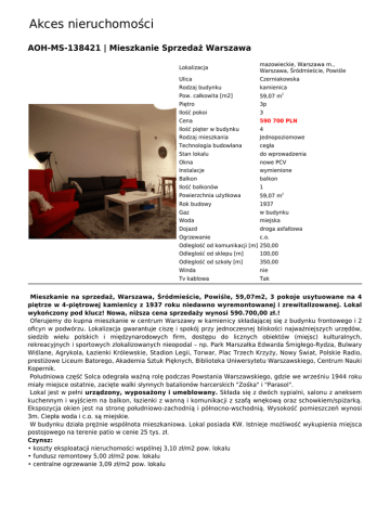Akces nieruchomości AOH-MS-138421 | Mieszkanie Sprzedaż Warszawa Lokalizacja mazowieckie, Warszawa m., Warszawa, Śródmieście, Powiśle Ulica Czerniakowska Rodzaj budynku kamienica Pow. całkowita [m2] 59,07 m2 Piętro 3p Ilość pokoi 3 Cena 590 700 PLN Ilość pięter w budynku 4 Rodzaj mieszkania Jednopoziomowe Technologia budowlana cegła Stan lokalu do wprowadzenia Okna nowe PCV Instalacje wymienione Balkon balkon Ilość balkonów 1 Powierzchnia użytkowa 59,07 m2 Rok budowy 1937 Gaz w budynku Woda miejska Dojazd droga asfaltowa Ogrzewanie c.o. Odleglość od komunikacji [m] 250,00 Odleglość od sklepu [m] 100,00 Odleglość od szkoły [m] 350,00 Winda nie Tv kablowa Tak Mieszkanie na sprzedaż, Warszawa, Śródmieście, Powiśle, 59,07m2, 3 pokoje usytuowane na 4 piętrze w 4-piętrowej kamienicy z 1937 roku niedawno wyremontowanej i zrewitalizowanej. Lokal wykończony pod klucz! Nowa, niższa cena sprzedaży wynosi 590.700,00 zł.! Oferujemy do kupna mieszkanie w centrum Warszawy w kamienicy składającej się z budynku frontowego i 2 oficyn w podwórzu. Lokalizacja gwarantuje ciszę i spokój przy jednoczesnej bliskości najważniejszych urzędów, siedzib wielu polskich i międzynarodowych firm, dostępu do licznych obiektów (miejsc) kulturalnych, rekreacyjnych i sportowych zlokalizowanych nieopodal – np. Park Marszałka Edwarda Śmigłego-Rydza, Bulwary Wiślane, Agrykola, Łazienki Królewskie, Stadion Legii, Torwar, Plac Trzech Krzyży, Nowy Świat, Polskie Radio, prestiżowe Liceum Batorego, Akademia Sztuk Pięknych, Biblioteka Uniwersytetu Warszawskiego, Centrum Nauki Kopernik. Południowa część Solca odegrała ważną rolę podczas Powstania Warszawskiego, gdzie we wrześniu 1944 roku miały miejsce ostatnie, zacięte walki słynnych batalionów harcerskich "Zośka" i "Parasol". Lokal jest w pełni urządzony, wyposażony i umeblowany. Składa się z dwóch sypialni, salonu z aneksem kuchennym i wyjściem na balkon, łazienki z wanną i komunikacji z szafą wnękową oraz schowkiem/spiżarką. Ekspozycja okien jest na stronę południowo-zachodnią i północno-wschodnią. Wysokość pomieszczeń wynosi 3m. Ciepła woda i c.o. są miejskie. W budynku działa prężnie wspólnota mieszkaniowa. Lokal posiada KW. Istnieje możliwość wykupienia miejsca postojowego na terenie patio w cenie 25 tys. zł. Czynsz: • koszty eksploatacji nieruchomości wspólnej 3,10 zł/m2 pow. lokalu • fundusz remontowy 5,00 zł/m2 pow. lokalu • centralne ogrzewanie 3,09 zł/m2 pow. lokalu Akces nieruchomości • zimna woda i ścieki 11,47 zł/m3 wody x 2,50 m3 / 1 os • podgrzanie wody 15,50 zł/m3 x 1,50 m3 / 1 os Mieszkanie ze względu na swoją atrakcyjną cenę, doskonałą lokalizację oraz funkcjonalny rozkład cechuje się wysokim potencjałem inwestycyjnym. Agent Szymański Andrzej Komórka 512 085 962 E-mail [email protected]