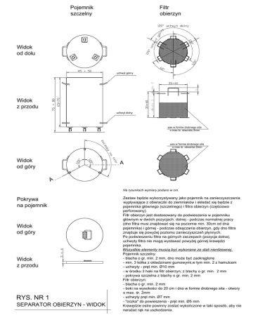 Pojemnik szczelny Filtr obierzyn Widok od dołu uchwyt górny Widok z przodu uchwyt dolny pas w formie drobnego sita o max śr. otworów 2mm pas w formie drobnego sita o max śr. otworów 2mm Widok od góry A A Na rysunkach wymiary podano w cm. Pokrywa na pojemnik Widok od góry Widok z przodu RYS. NR 1 SEPARATOR OBIERZYN - WIDOK Zestaw będzie wykorzystywany jako pojemnik na zanieczyszczenia wypływające z obieraczki do ziemniaków i składać się będzie z pojemnika głównego (szczelnego) i filtra obierzyn (częściowo perforowany). Filtr obierzyn jest dostosowany do podwieszenia w pojemniku głównym w dwóch pozycjach: dolnej - podczas normalnej pracy (dno filtra musi znajdować się na poziomie min. 30cm od dna pojemnika) i górnej - podczas odsączania obierzyn, gdy dno filtra znajduje się powyżej poziomu zanieczyszczeń płynnych. Po podwieszeniu filtra na górnych zaczepach (pozycja dolna), uchwyty filtra nie mogą wystawać powyżej górnej krawędzi pojemnika. Wszystkie elementy muszą być wykonane ze stali nierdzewnej. Pojemnik szczelny: - blacha o gr. min. 2 mm, dno może być zaokrąglone - min. 3 kółka z okładzinami gumowymi,w tym min. 2 z hamulcem - uchwyty - pręt min. Ø10 mm - w środku 3 haki na filtr obierzyn, z blachy o gr. min. 2 mm - pokrywa szczelna z blachy o gr. min. 2 mm Filtr obierzyn: - blacha o gr. min. 2 mm - boki na wysokości do 20 cm i dno w formie drobnego sita - otwory o max. śr. 2mm - uchwyty pręt min. Ø7 mm - "oczka" do powieszenia - pręt min. Ø5 mm Krawędzie ostre powinny zostać wykończone w taki sposób, aby nie narażać rąk na uszkodzenia.