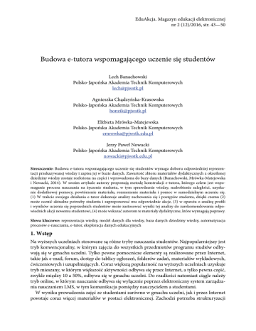 EduAkcja. Magazyn edukacji elektronicznej nr 2 (12)/2016, str. 43—50 Budowa e-tutora wspomagającego uczenie się studentów Lech Banachowski Polsko-Japońska Akademia Technik Komputerowych [email protected] Agnieszka Chądzyńska-Krasowska Polsko-Japońska Akademia Technik Komputerowych [email protected] Elżbieta Mrówka-Matejewska Polsko-Japońska Akademia Technik Komputerowych [email protected] Jerzy Paweł Nowacki Polsko-Japońska Akademia Technik Komputerowych [email protected] Streszczenie: Budowa e-tutora wspomagającego uczenie się studentów wymaga doboru odpowiedniej reprezentacji przekazywanej wiedzy i zapisu jej w bazie danych. Zawartość zbioru materiałów dydaktycznych z określonej dziedziny wiedzy zostaje rozłożona na części i wprowadzona do bazy danych (Banachowski, Mrówka-Matejewska i Nowacki, 2014). W swoim artykule autorzy proponują metodę konstrukcji e-tutora, którego celem jest wspomaganie procesu nauczania na życzenie studenta, w tym sprawdzenie wiedzy, nadrobienie zaległości, uzyskanie dodatkowej pomocy, powtórzenie materiału, rozszerzenie materiału i pomoc w samodzielnym uczeniu się. (1) W trakcie swojego działania e-tutor dokonuje analizy zachowania się i postępów studenta, dzięki czemu (2) może ocenić aktualne potrzeby studenta i zaproponować mu odpowiednie akcje, (3) w oparciu o analizę profili i wyników uczenia się poprzednich studentów może zastosować wyniki tej analizy do zarekomendowania odpowiednich akcji nowemu studentowi, (4) może wskazać autorom te materiały dydaktyczne, które wymagają poprawy. Słowa kluczowe: reprezentacja wiedzy, model danych dla wiedzy, baza danych dziedziny wiedzy, automatyzacja procesów e-nauczania, e-tutor, eksploracja danych edukacyjnych 1. Wstęp Na wyższych uczelniach stosowane są różne tryby nauczania studentów. Najpopularniejszy jest tryb konwencjonalny, w którym zajęcia do wszystkich przedmiotów programu studiów odbywają się w gmachu uczelni. Tylko pewne pomocnicze elementy są realizowane przez Internet, takie jak e-mail, forum, dostęp do tablicy ogłoszeń, folderów zadań, materiałów wykładowych, ćwiczeniowych i uzupełniających. Coraz większą popularność na wyższych uczelniach uzyskuje tryb mieszany, w którym większość aktywności odbywa się przez Internet, a tylko pewna część, zwykle między 10 a 50%, odbywa się w gmachu uczelni. Do rzadkości natomiast ciągle należy tryb online, w którym nauczanie odbywa się wyłącznie poprzez elektroniczny system zarządzania nauczaniem LMS, w tym komunikacja pomiędzy nauczycielem a studentami. W wyniku prowadzenia zajęć ze studentami zarówno w gmachu uczelni, jak i przez Internet powstaje coraz więcej materiałów w postaci elektronicznej. Zachodzi potrzeba strukturyzacji Lech Banachowski et al., Budowa e-tutora wspomagającego uczenie się studentów zbioru tych materiałów – do tego celu służą między innymi powstające repozytoria materiałów elektronicznych. Rysuje się także możliwość budowy na skalę praktyczną programów nazywanych e-tutorami, które są w stanie pomagać studentom niezależnie od stosowanego trybu nauczania (zobacz Rys. 1). Rysunek 1 Ewolucja użycia e-materiałów w nauczaniu E-tutor jest to system informatyczny realizujący zadania korepetytora na życzenie studenta takie jak: • sprawdzenie wiedzy, • nadrobienie zaległości – do opanowania materiału w kursie zorganizowanym student potrzebuje wiedzy z pewnego obszaru, którego znajomość zakłada kurs, • dodatkowa pomoc – uczestnictwo w zorganizowanym kursie nie jest wystarczające do pozytywnego jego zakończenia i osoba ucząca się potrzebuje dodatkowej pomocy. System może dostarczyć wyjaśnień, przykładów i zadań na dany temat, • powtórzenie materiału – osoba ma już opanowany zakres zorganizowanego kursu i chciałaby tylko powtórzyć swoją wiedzę, np. w zakresie konkretnego tematu. System może dostarczyć zbiorczego, syntetycznego zebrania najważniejszych informacji na dany temat, • rozszerzenie materiału – osoba ma już opanowany zakres zorganizowanego kursu i chciałaby tylko rozszerzyć swoją wiedzę, np. w zakresie konkretnego tematu, • pomoc w samodzielnym uczeniu się – osoba jest w stanie sama przy niewielkiej pomocy systemu opanować wiedzę z obszaru wiedzy i nie musi uczestniczyć w zorganizowanym kursie. Dodatkowo, w tle system dokonuje analizy zachowania się i postępów studenta. W ten sposób może ocenić aktualne potrzeby studenta i zaproponować odpowiednie akcje, a na podstawie analizy profili i wyników uczenia się poprzednich studentów może zarekomendować odpowiednie akcje nowym studentom. Autorom może wskazać partie materiałów wymagające poprawy. Punktem wyjścia do budowy e-tutora są podręczniki elektroniczne i wspomagające proces nauczania różnorodne materiały elektroniczne. Elementy wiedzy oraz wyniki aktywności studentów są składowane w bazie danych e-tutora. Na podstawie informacji zapisanych w bazie danych e-tutor może generować materiały dopasowane do indywidualnych potrzeb studenta. Może on w każdej chwili skierować do systemu zapytanie o wyjaśnienie dowolnego tematu, może poprosić o sprawdzenie wiedzy, może powtórzyć dowolny fragment e-podręcznika, może poprosić o przygotowanie zbiorczego zestawienia w celu utrwalenia przerobionego materiału. Jest też możliwość eksploracji zgromadzonych danych o aktywnościach studentów. Trzeba podkreślić, że zadaniem e-tutora jest pomóc studentowi w uczeniu się, nie zastępując EduAkcja. Magazyn edukacji elektronicznej, nr 2 (12)/2016 , str. 44 Lech Banachowski et al., Budowa e-tutora wspomagającego uczenie się studentów zewnętrznego procesu nauczania organizowanego w ramach kursu akademickiego. Prace nad budową podobnych e-tutorów trwają w kilku miejscach na świecie, między innymi w Rice University (Carr, 2013; projekt OpenStax Tutor) oraz UMass (pr
