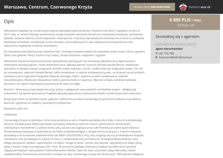Warszawa, Centrum, Czerwonego Krzyża Numer oferty 603/4290/OMW Opis Mieszkanie znajduje się na pierwszym piętrze pięciopiętrowej kamienicy. Powierzchnia 92m2. Kapitalny remont w 2015 roku, w ramach którego wymienione zostały wszystkie elementy techniczne mieszkania (instalacje, tynkowanie, wylewki, stolarka okienna, drzwi wejściowe i wewnętrzne, inne) oraz wprowadzone kosmetyczne zmiany w rozkładzie (likwidacja służbówki, modyfikacje w celu montażu szaf wnękowych) w celu zwiększenia funkcjonalności bez zaburzenia oryginalnej struktury mieszkania. Do mieszkania wchodzimy przez obszerny hall, z którego prowadzi wejście do wszystkich pokoi (salon 22m2, sypialnia 20m2 oraz gabinet 18m2), kuchni oraz toalety. Osobna łazienka z wejściem z sypialni. Mieszkanie starannie wykończone przez specjalistów zajmujących się renowacją zabytków przy wykorzystaniu materiałów wysokiej jakości: nowe drewniane okna, dębowy parkiet, kuchnia olchowa (sprzęt Bosch), żeberkowe kaloryfery w każdym pokoju, oryginalne duńskie meble teakowe z lat 60’, modernistyczne oryginalne lampy z 50 i 60 po renowacjach, włączniki świateł Berker, kafle cementowe, w salonie antykwaryczny piec, na ścianach prace polskich artystów w tym oryginalne fotografie Edwarda Hartwiga. Salon i sypialnia w pełni umeblowane. Gabinet nieumeblowany. Możliwość dokupienia mebli w porozumieniu z najemcą. Obecnie w lokalu siedziba butikowej kancelarii, do najmu mieszkanie przywrócone do stanu ze zdjęć. Remont i dekoracja przeprowadzone przez jedną z najlepszych warszawskich architektów wnętrz – Małgorzatę Łukasiewicz Tyczyńska (pracownia Progetto) specjalizującą się w przywracaniu blasku modernistycznym wnętrzom. Ekspozycja okien na południe (salon, gabinet z balkonem) na ulicę Czerwonego Krzyża (front budynku) oraz północ (kuchnia, sypialnia) na zadbany, wewnętrzny dziedziniec. Wysokość sufitu 3m. Lokalizacja Czerwonego Krzyża to spokojna i cicha ulica położona w sercu Powiśla pomiędzy ulicą Solec a ulicą Kruczkowskiego. Okolicę charakteryzuje doskonały balans pomiędzy bliskością centrum miasta i jednocześnie kameralnym, mieszkalnym charakterem. Z jednej strony ulicy zaczyna się ciągnący przez całe Powiśle pas zieleni (parki Beyera i Porazińskiej prowadzące na południe aż do Parku Łazienkowskiego), z drugiej strony ul Jaracza z Teatrem Ateneum prowadząca do bulwarów nadwiślańskich (ok 400m ODLEGŁOŚCI). Przy ulicy znajdują się trzy przedwojenne budynki mieszkalne oraz przedwojenny Szpital na Solcu o modernistycznej architekturze. W bezpośredniej bliskości ulicy sklepy spożywcze: Społem, supermarket Carrefour, drogeria Hebe, rzeźnik, warzywniak, specjalistyczny sklep rybny, sklep z winem, sklep monopolowy 24h i inne. W promieniu jednego kilometra znajduje się kilkanaście spośród najpopularniejszych warszawskich lokali (Warszawa Powiśle, Solec 44, Sam, sezonowo Stacja Mercedes, lokale nadwiślańskie). Parkowanie samochodu możliwe na ulicy Czerwonego Krzyża lub okolicznych. 300 metrów odległości 6 800 PLN / msc. 73 PLN / m² Skontaktuj się z agentem KATARZYNA KURYŁOWICZ agent nieruchomości T: 601 735 788 E: katarzyna@infinityhouse.pl do najbliższego parkingu strzeżonego pod Mostem Poniatowskiego (zadaszony, możliwość długoterminowego najmu miejsca) Numer oferty 603/4290/OMW Warszawa, Centrum, Czerwonego Krzyża Warszawa, Centrum, Czerwonego Krzyża Zdjęcia Numer oferty 603/4290/OMW Warszawa, Centrum, Czerwonego Krzyża Numer oferty 603/4290/OMW Warszawa, Centrum, Czerwonego Krzyża Numer oferty 603/4290/OMW Warszawa, Centrum, Czerwonego Krzyża Numer oferty 603/4290/OMW Warszawa, Centrum, Czerwonego Krzyża Numer oferty 603/4290/OMW Warszawa, Centrum, Czerwonego Krzyża Numer oferty 603/4290/OMW Warszawa, Centrum, Czerwonego Krzyża Numer oferty 603/4290/OMW Warszawa, Centrum, Czerwonego Krzyża Numer oferty 603/4290/OMW Warszawa, Centrum, Czerwonego Krzyża Mapa Numer oferty 603/4290/OMW