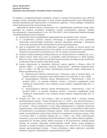 Kielce, 30.01.2017r. Szanowni Państwo Wójtowie, Burmistrzowie, Prezydenci Miast, Starostwie W związku z przygotowywaniem projektów uchwał w sprawie dostosowania sieci szkół do nowego ustroju szkolnego informuję, że wzór uchwał opublikowanych przez Ministerstwo Edukacji Narodowej jest dokumentem o charakterze ogólnym i może podlegać modyfikacji celem dostosowania do rzeczywistego stanu. Jednocześnie bardzo proszę o zapoznanie się i respektowanie poniższych uwag, które powstały po analizie propozycji projektów uchwał przekazanych podczas spotkań konsultacyjnych zorganizowanych w dn. 24-27.01.2017r. przez Wojewodę Świętokrzyskiego i Świętokrzyskiego Kuratora Oświaty: 1) dostosować tytuły przykładowych załączników do rzeczywistej treści uchwał; 2) w uzasadnieniu uchwały zawrzeć informację o zapewnieniu przez jednostkę samorządu terytorialnego możliwości realizacji obowiązku szkolnego i obowiązku nauki przez wszystkie dzieci zamieszkałe na terenie gminy/powiatu; 3) ująć w projektach sieci szkół publicznych mających siedzibę na terenie gminy lub powiatu szkół prowadzonych przez inne organy, w tym prowadzonych na podstawie zawartych porozumień na podstawie art. 5b i 5c ustawy o systemie oświaty; 4) wskazać osobę prowadzącą szkołę publiczną, np. Stowarzyszenie, Fundacja, Sp. z o.o.; 5) wpisać imiona szkół, przy czym w przypadku szkół wchodzących w skład zespołu, który ma imię, a dana szkoła nie posiada imienia przepisy nie dopuszczają możliwości przypisania imienia zespołu szkół danej szkole; 6) nazwy miejscowości w obwodach szkolnych wpisać zgodnie z Ustawą z dnia 29 sierpnia 2003 r. o urzędowych nazwach miejscowości i obiektów fizjograficznych (Dz. U. z 2003 r. Nr 166, poz. 1612 z późniejszymi zmianami). Wykaz miejscowości w Polsce opublikowany jest w: a) Obwieszczeniu Ministra Administracji i Cyfryzacji z dnia 4 sierpnia 2015 r. w sprawie wykazu urzędowych nazw miejscowości i ich części (Dz. U. poz. 1636); b) Rozporządzeniu Ministra Spraw Wewnętrznych i Administracji z dnia 17 grudnia 2015 r. w sprawie ustalenia, zmiany i zniesienia urzędowych nazw niektórych miejscowości oraz ustalenia nazwy obiektu fizjograficznego (Dz. U. poz. 2277); c) Rozporządzeniu Ministra Spraw Wewnętrznych i Administracji z dnia 23 grudnia 2016 r. w sprawie ustalenia, zmiany i zniesienia urzędowych nazw niektórych miejscowości oraz ustalenia nazwy obiektu fizjograficznego (Dz. U. poz. 2251). 7) Przepisy art. 206 i art. 213 ustawy z dnia 14 grudnia 2016 r. Przepisy ustawy wprowadzającej ustawę – Prawo oświatowe (Dz. U. z 2017 r. poz. 60) stwierdzają, iż na podstawie tych uchwał „nie dokonuje się zakładania szkół, o których mowa w art. 18 ustawy – Prawo oświatowe, w tym szkół podstawowych o niepełnej strukturze organizacyjnej i szkół podstawowych filialnych, likwidacji i przekształceń szkół innych niż dokonywane na podstawie niniejszej ustawy”. Zatem założenie szkoły, likwidację szkoły i przekształcenie szkoły można dokonać na podstawie przepisów ustawy z dnia 7 września 1991 r. o systemie oświaty (Dz. U. z 2016 r. poz. 1943 z późniejszymi zmianami), przy czym likwidację lub przekształcenie szkoły należy dokonać zgodnie z przepisami art. 59 tejże ustawy. Należy zauważyć, iż do przeniesienia siedziby szkoły stosuje się przepisy dotyczące przekształcenia szkoły. Zatem przed podjęciem uchwały w sprawie projektu uchwały wynikającej z art. 206 lub art. 213 Przepisów ustawy wprowadzającej ustawę – Prawo oświatowe, należy zakończyć wszystkie działania związane z likwidacjami i przekształceniami szkół. Z poważaniem Świętokrzyski Kurator Oświaty – Kazimierz Mądzik