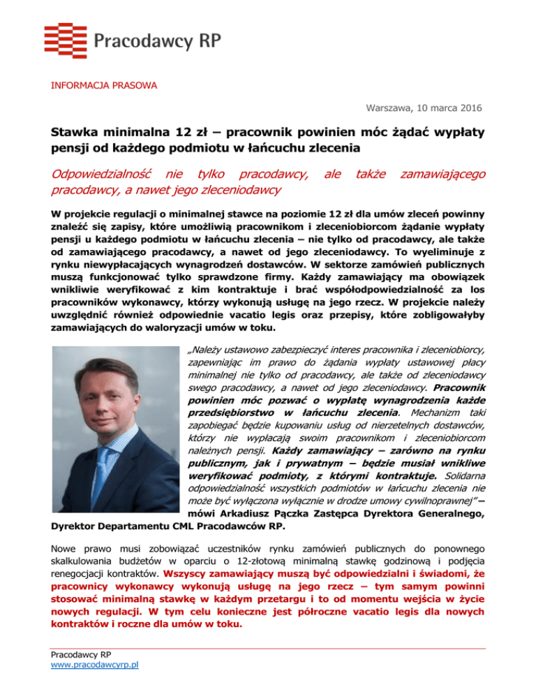 INFORMACJA PRASOWA Warszawa, 10 marca 2016 Stawka minimalna 12 zł – pracownik powinien móc żądać wypłaty pensji od każdego podmiotu w łańcuchu zlecenia Odpowiedzialność nie tylko pracodawcy, pracodawcy, a nawet jego zleceniodawcy ale także zamawiającego W projekcie regulacji o minimalnej stawce na poziomie 12 zł dla umów zleceń powinny znaleźć się zapisy, które umożliwią pracownikom i zleceniobiorcom żądanie wypłaty pensji u każdego podmiotu w łańcuchu zlecenia – nie tylko od pracodawcy, ale także od zamawiającego pracodawcy, a nawet od jego zleceniodawcy. To wyeliminuje z rynku niewypłacających wynagrodzeń dostawców. W sektorze zamówień publicznych muszą funkcjonować tylko sprawdzone firmy. Każdy zamawiający ma obowiązek wnikliwie weryfikować z kim kontraktuje i brać współodpowiedzialność za los pracowników wykonawcy, którzy wykonują usługę na jego rzecz. W projekcie należy uwzględnić również odpowiednie vacatio legis oraz przepisy, które zobligowałyby zamawiających do waloryzacji umów w toku. „Należy ustawowo zabezpieczyć interes pracownika i zleceniobiorcy, zapewniając im prawo do żądania wypłaty ustawowej płacy minimalnej nie tylko od pracodawcy, ale także od zleceniodawcy swego pracodawcy, a nawet od jego zleceniodawcy. Pracownik powinien móc pozwać o wypłatę wynagrodzenia każde przedsiębiorstwo w łańcuchu zlecenia. Mechanizm taki zapobiegać będzie kupowaniu usług od nierzetelnych dostawców, którzy nie wypłacają swoim pracownikom i zleceniobiorcom należnych pensji. Każdy zamawiający – zarówno na rynku publicznym, jak i prywatnym – będzie musiał wnikliwe weryfikować podmioty, z którymi kontraktuje. Solidarna odpowiedzialność wszystkich podmiotów w łańcuchu zlecenia nie może być wyłączona wyłącznie w drodze umowy cywilnoprawnej” – mówi Arkadiusz Pączka Zastępca Dyrektora Generalnego, Dyrektor Departamentu CML Pracodawców RP. Nowe prawo musi zobowiązać uczestników rynku zamówień publicznych do ponownego skalkulowania budżetów w oparciu o 12-złotową minimalną stawkę godzinową i podjęcia renegocjacji kontraktów. Wszyscy zamawiający muszą być odpowiedzialni i świadomi, że pracownicy wykonawcy wykonują usługę na jego rzecz – tym samym powinni stosować minimalną stawkę w każdym przetargu i to od momentu wejścia w życie nowych regulacji. W tym celu konieczne jest półroczne vacatio legis dla nowych kontraktów i roczne dla umów w toku. Pracodawcy RP www.pracodawcyrp.pl „Stosowanie płacy minimalnej w odniesieniu do umów zleceń na poziomie 12 zł za godzinę sprawi, że wzmocniony zostanie negatywny efekt obowiązywania minimalnego wynagrodzenia dotyczącego umów o pracę w obecnej wysokości, co będzie się przejawiać w rozszerzeniu szarej strefy, wzroście bezrobocia oraz częstszym nadużywaniu umów o dzieło. W związku z tym Rząd powinien po prostu promować szerokie stosowanie umów o pracę – w szczególności w zamówieniach publicznych” – dodaje Arkadiusz Pączka. Zastrzeżenia wywołuje również ingerencja projektowanej regulacji dotyczącej Państwowej Inspekcji Pracy w zasadę swobody umów, a także właściwość kompetencyjną PIP. Część nowych uprawnień może być kwestionowane jako niezgodne z Konstytucją RP. Naruszenie fundamentalnych reguł w systemie prawa cywilnego, celem jego zbliżenia do prawa pracy, zaburzy odrębność i ład tych dwóch gałęzi prawa. Brak ustawowej regulacji prawnej w kwestii ochrony płacy minimalnej wpływa na patologiczne zjawiska w sektorze zamówień publicznych. Obowiązujący system nie uwzględniał dotychczas relacji między zamawiającym a wykonawcą w tym aspekcie. Zamawiający korzysta z usług pracowników wykonawcy, ale de facto nie bierze odpowiedzialności m.in. za coroczną podwyżkę płacy minimalnej. W ten sposób Państwo reguluje ustawowo płacę minimalną, ale bez konsekwentnego jej egzekwowania. 1. Jeśli wykonawca nie może waloryzować długoletnich umów to zmuszony jest do poszukiwania rozwiązań, które pozwolą mu dokończyć realizację zlecenia – tak właśnie wygląda główna przyczyna szerokiego stosowania cywilnoprawnych form zatrudnienia. 2. Beneficjentem takiej optymalizacji jest zawsze zamawiający, który płaci coraz mniej. 3. Wykonawca tymczasem balansuje na granicy opłacalności z kontraktem o 3-4% rentowności. 4. Pracownik traci jednak najwięcej, gdyż przez lata zostaje z zamrożoną pensją, która wobec rosnącej płacy minimalnej z roku na rok realnie maleje. 5. Konsekwencją takiej praktyki jest powszechność przetargów, gdzie stawka za roboczogodzinę wynosi ok. 8 zł, co nie stanowi nawet 80% płacy minimalnej. 6. Gdyby ustawodawca uregulował prawnie stosunek między zamawiającym a wykonawcą w zakresie ochrony płacy minimalnej, to z rynku zostałyby wyeliminowane patologiczne praktyki. Nie byłoby wówczas potrzeby wprowadzania rozwiązań pośrednich m.in. w postaci ingerencji w umowy zlecenia, gdzie kodeks cywilny próbuje upodobnić się do kodeksu pracy. Uregulowanie systemu umów zleceń jest dobrym kierunkiem, ale geneza problemu znajduje się gdzie indziej. Jeśli zamawiający nie uwzględni w budżecie zwiększającej się płacy minimalnej i nie zwaloryzuje odpowiednio wynagrodzenia wykonawcy, to nie dojdzie do podniesienia płac, a patologiczne stawki godzinowe będą w dalszym ciągu powszechnie stosowane. Pracodawcy RP www.pracodawcyrp.pl