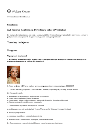 www.szkolenia.wolterskluwer.pl Szkolenie: XVI Krajowa Konferencja Dyrektorów Szkół i Przedszkoli Do trafnych decyzji potrzebna jest wizja i wiedza. Już 20 lat Dyrektor Szkoły wspiera kadrę kierowniczą oświaty w podejmowaniu strategicznych decyzji i rozwiązywaniu bieżących problemów Terminy i miejsce: Program W programie konferencji: 1. Wykład Dr. Russella Quaglia największego międzynarodowego autorytetu w dziedzinie rozwoju oraz wspomagania uczniów w realizacji ich aspiracji. 2. Nowe projekty MEN oraz zmiany prawno-organizacyjne w roku szkolnym 2014/2015 2.1 Ustawa rekrutacyjna po roku – doświadczenia, wnioski, najważniejsze problemy, kolejne zmiany; 2.2 Nowy podręcznik: a. Konsekwencje organizacyjne w planowaniu pracy szkoły, b. Nowy zakres odpowiedzialności dyrektora c. Nowe zasady ustawy podręcznikowej a naruszenie dyscypliny finansów publicznych d. Finansowanie podręczników przez samorządy. 2.3 Zatrudnianie asystentów nauczycieli w szkołach: a. podstawa prawna zatrudnienia (art. 7e, art. 7f oraz art. 5d Ustawy o Systemie Oświaty); b. zasady wynagradzania; c. wymagane kwalifikacje oraz zadania asystenta; d. zaświadczenie o niekaralności wymagane przed zatrudnieniem. 2.4 Rozporządzenie w sprawie indywidulanego przygotowania przedszkolnego; 2.5 Naruszenie dyscypliny finansów publicznych; 2.6 Nowe zasady przeprowadzania egzamniów maturalnych i sprawdzianu szóstoklasistów. 3. Finansowanie oświaty – środki budżetowe i pozabudżetowe. Dotowanie przedszkoli i szkół, nowe rozdanie środków unijnych. Wystąpienie poprowadzi Jarosław Jankowski - Zastępca Dyrektora Departamentu Funduszy Strukturalnych w MEN. 4. Finansowanie publiczne oświaty publicznej i niepublicznej. 5. Gala 20 lecia czasopisma „Dyrektor Szkoły” oraz Konkursu "Super Dyrektor" 6. Przestrzeń zarządzania i wpływu dyrektora szkoły. 7. Budowanie pozycji dyrektora szkoły/ przedszkola jako lidera zmiany w środowisku szkolnym i lokalnym w kontekście opracowywania wizji rozwoju szkoły/ przedszkola, współpracy z organem prowadzącym, sprawowania nadzoru pedagogicznego, budowania przestrzeni szkoły, jako wspólnoty uczniów, nauczycieli, pracowników szkoły, rodziców, kontaktów ze środowiskiem lokalnym. 8. Nadzór pedagogiczny w praktyce - jak przygotować się do ewaluacji zewnętrznej, jak działać w trakcie, jak realizować wnioski pokontrolne. Ewaluacja, jako stały element pracy szkoły: ● Przygotowanie, przebieg oraz wnioski pokontrolne ewaluacji zewnętrznej. Z praktyki dyrektora szkoły. ● Ewaluacja zewnątrzna w szkole i przedszkolu: Czego się spodziewać i jak się przygotować? 9. Rola szkoły w kształtowaniu kompetencji uczenia się przez całe życie w kontekście Polskiej Ramy Kwalifikacji 10. Mistrzowie Kodowania. 11. Skuteczność edukacyjna, czyli używanie narzędzi, które działają. 12. OdWażnie o Pokoleniach - Na drodze do porozumienia; 13. Wellness w pracy dyrektora szkoły. Oprócz programu XVI KKDS uczestnicy mogą bezpłatnie wziąć udział w VII edycji konferencji Rozwiązania HR, która odbędzie się 22 października 2014 w Warszawie, również w hotelu Gromada. Wystąpienia prezentowane podczas tego wydarzenia będą niesamowitą okazją do pogłębienia wiedzy dotyczącej tematyki zarządzania zasobami ludzkimi w placówce oświatowej. W programie m.in : Social/Innovation - networking, employer branding, rekrutacja ❍ ❍ ❍ Budowanie wizerunku pracodawcy Wymiana informacji, komunikacja, budowanie społeczności w organizacji Techniki rekrutacyjne w organizacjach Prelegenci Dr Russell J. Quaglia Dr Russell J. Quaglia, prezes i założyciel Quaglia Institute for Student Aspirations, jest światowej sławy pionierem w dziedzinie edukacji znanym ze swojego niesłabnącego oddania dla uczniów i studentów. Przez media uznawany jest za autorytet w dziedzinie rozwoju i wspomagania uczniów i studentów w osiąganiu ich pragnień i zamiarów. Jego innowacyjna praca oraz wyniki przeprowadzonych badań zaowocowały wieloma publikacjami i licznymi prezentacjami wygłaszanymi na forum międzynarodowym, jak również wciąż pojawiającymi się nowymi przedsięwzięciami. Russell J. Quaglia jest m.in. autorem badań My Voice, mających na celu ocenę przeprowadzanych kursów iKnow My Class, i kompleksowego internetowego programu My Aspirations Action Plan (MAAP), pomagającego osiągać zamierzone cele oraz śledzić postępy przy wsparciu dorosłego doradcy (Aspirations Advocate). Jego najnowsza książka zatytułowana Student Voice: The Instrument of Change już zyskała międzynarodowe uznanie. Zostanie również wydana w języku polskim przez wydawnictwo Wolters Kluwer. Oprócz ufundowania i prowadzenia Quaglia Institute for Student Aspirations dr Russell J. Quaglia jest także założycielem oraz przewodniczącym Aspirations Academies Trust – funduszu, którego zadaniem jest finansowe wspieranie szkół podstawowych i średnich w Wielkiej Brytanii. Łącząc ducha przedsiębiorczości z zaangażowaniem we wspieranie studentów w osiąganiu własnych celów, w 2012 r. dr Quaglia założył Q-Bean Coffee, instytucję przeznaczającą wypracowane zyski ze sprzedaży ekologicznej kawy na rzecz organizacji o charakterze edukacyjnym oraz przyznawanie stypendiów studenckich. Doktor Russell J. Quaglia uzyskał dyplom licencjata w Assumption College, dyplom magistra ekonomii w Boston College oraz dyplom magistra i doktora edukacji na Uniwersytecie Columbia, gdzie specjalizował się w teorii organizacji zachowań. Za swoje poświęcenie na rzecz studentów został nagrodzony licznymi honorowymi doktoratami za działalność humanitarną. Praca dr. Quaglii zaowocowała udziałem w wielu krajowych i międzynarodowych komisjach, co odzwierciedla jego dążenia, by głos studentów był słyszany i uwzględniany w podejmowanych działaniach. dr hab. Włodzimierz Włodarski Jest doktorem habilitowanym, wykładowcą Uniwersytetu Warszawskiego ora