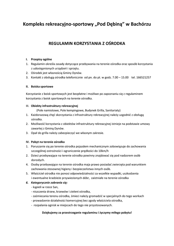 Kompleks rekreacyjno-sportowy „Pod Dębiną” w Bachórzu REGULAMIN KORZYSTANIA Z OŚRODKA I. Przepisy ogólne 1. Regulamin określa zasady dotyczące przebywania na terenie ośrodka oraz sposób korzystania z udostępnionych urządzeń i sprzętu. 2. Ośrodek jest własnością Gminy Dynów. 3. Kontakt z obsługą ośrodka telefonicznie od pn. do pt. w godz. 7.00 – 15.00 tel. 166521257 II. Boiska sportowe Korzystanie z boisk sportowych jest bezpłatne i możliwe po zapoznaniu się z regulaminem korzystania z boisk sportowych na terenie ośrodka. III. Obiekty infrastruktury rekreacyjnej (Pole namiotowe, Pole kempingowe, Budynek Grilla, Sanitariaty) 1. Każdorazową chęć skorzystania z infrastruktury rekreacyjnej należy uzgodnić z obsługą ośrodka. 2. Możliwość korzystania z obiektów infrastruktury rekreacyjnej istnieje na podstawie umowy zawartej z Gminą Dynów. 3. Opał do grilla należy zabezpieczyć we własnym zakresie. IV. Pobyt na terenie ośrodka 1. Poruszanie się po terenie ośrodka pojazdem mechanicznym zobowiązuje do zachowania szczególnej ostrożności i ograniczenie prędkości do 10km/h 2. Dzieci przebywające na terenie ośrodka powinny znajdować się pod nadzorem osób dorosłych. 4. Osoby przebywające na terenie ośrodka maja prawo posiadać zwierzęta pod warunkiem zachowania stosownej higieny i bezpieczeństwa innych osób. 5. Właściciel ośrodka nie ponosi odpowiedzialności za wszelkie wypadki, uszkodzenia i ewentualne kradzieże przywiezionych dóbr, zaistniałe na terenie ośrodka 6. Kategorycznie zabrania się: - kąpieli w rzece San, - niszczenia drzew, krzewów i zieleni ośrodka, - zaśmiecania terenu ośrodka, śmieci należy gromadzić w specjalnych do tego workach - prowadzenie działalności komercyjnej bez zgody właściciela ośrodka, - rozpalania ognisk w miejscach do tego nie przystosowanych. Dziękujemy za przestrzeganie regulaminu i życzymy miłego pobytu!