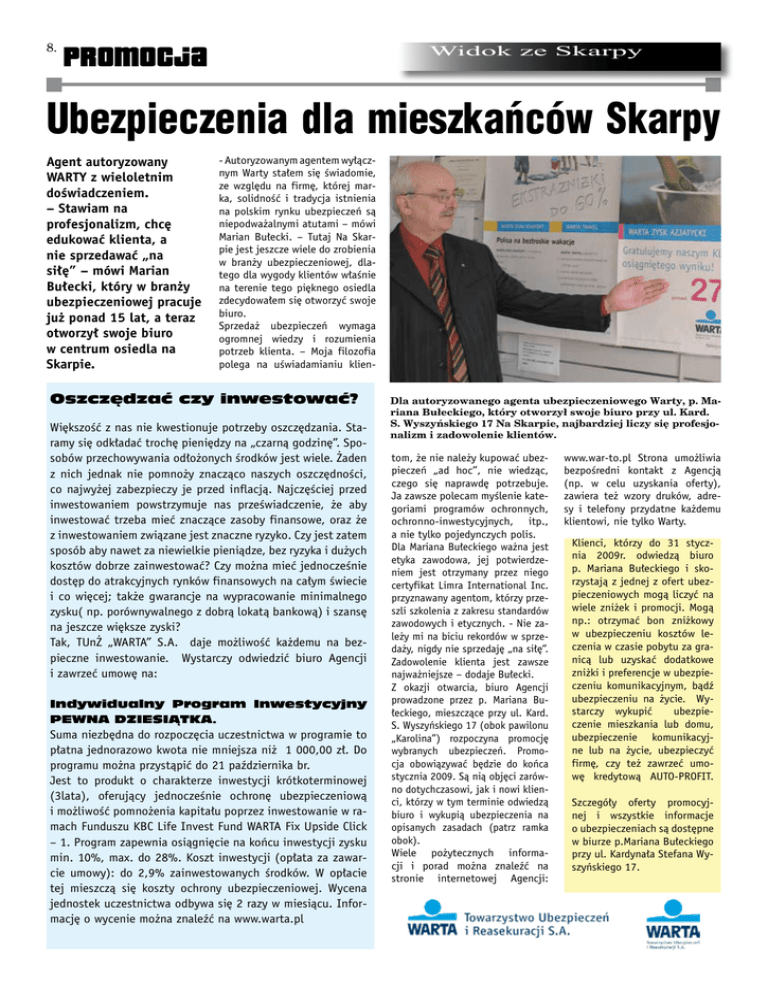 8. promocja Widok ze Skarpy Ubezpieczenia dla mieszkańców Skarpy Agent autoryzowany WARTY z wieloletnim doświadczeniem. – Stawiam na profesjonalizm, chcę edukować klienta, a nie sprzedawać „na siłę” – mówi Marian Bułecki, który w branży ubezpieczeniowej pracuje już ponad 15 lat, a teraz otworzył swoje biuro w centrum osiedla na Skarpie. - Autoryzowanym agentem wyłącznym Warty stałem się świadomie, ze względu na firmę, której marka, solidność i tradycja istnienia na polskim rynku ubezpieczeń są niepodważalnymi atutami – mówi Marian Bułecki. – Tutaj Na Skarpie jest jeszcze wiele do zrobienia w branży ubezpieczeniowej, dlatego dla wygody klientów właśnie na terenie tego pięknego osiedla zdecydowałem się otworzyć swoje biuro. Sprzedaż ubezpieczeń wymaga ogromnej wiedzy i rozumienia potrzeb klienta. – Moja filozofia polega na uświadamianiu klien- Oszczędzać czy inwestować? Większość z nas nie kwestionuje potrzeby oszczędzania. Staramy się odkładać trochę pieniędzy na „czarną godzinę”. Sposobów przechowywania odłożonych środków jest wiele. Żaden z nich jednak nie pomnoży znacząco naszych oszczędności, co najwyżej zabezpieczy je przed inflacją. Najczęściej przed inwestowaniem powstrzymuje nas przeświadczenie, że aby inwestować trzeba mieć znaczące zasoby finansowe, oraz że z inwestowaniem związane jest znaczne ryzyko. Czy jest zatem sposób aby nawet za niewielkie pieniądze, bez ryzyka i dużych kosztów dobrze zainwestować? Czy można mieć jednocześnie dostęp do atrakcyjnych rynków finansowych na całym świecie i co więcej; także gwarancje na wypracowanie minimalnego zysku( np. porównywalnego z dobrą lokatą bankową) i szansę na jeszcze większe zyski? Tak, TUnŻ „WARTA” S.A. daje możliwość każdemu na bezpieczne inwestowanie. Wystarczy odwiedzić biuro Agencji i zawrzeć umowę na: Indywidualny Program Inwestycyjny PEWNA DZIESIĄTKA. Suma niezbędna do rozpoczęcia uczestnictwa w programie to płatna jednorazowo kwota nie mniejsza niż 1 000,00 zł. Do programu można przystąpić do 21 października br. Jest to produkt o charakterze inwestycji krótkoterminowej (3lata), oferujący jednocześnie ochronę ubezpieczeniową i możliwość pomnożenia kapitału poprzez inwestowanie w ramach Funduszu KBC Life Invest Fund WARTA Fix Upside Click – 1. Program zapewnia osiągnięcie na końcu inwestycji zysku min. 10%, max. do 28%. Koszt inwestycji (opłata za zawarcie umowy): do 2,9% zainwestowanych środków. W opłacie tej mieszczą się koszty ochrony ubezpieczeniowej. Wycena jednostek uczestnictwa odbywa się 2 razy w miesiącu. Informację o wycenie można znaleźć na www.warta.pl Dla autoryzowanego agenta ubezpieczeniowego Warty, p. Mariana Bułeckiego, który otworzył swoje biuro przy ul. Kard. S. Wyszyńskiego 17 Na Skarpie, najbardziej liczy się profesjonalizm i zadowolenie klientów. tom, że nie należy kupować ubezpieczeń „ad hoc”, nie wiedząc, czego się naprawdę potrzebuje. Ja zawsze polecam myślenie kategoriami programów ochronnych, ochronno-inwestycyjnych, itp., a nie tylko pojedynczych polis. Dla Mariana Bułeckiego ważna jest etyka zawodowa, jej potwierdzeniem jest otrzymany przez niego certyfikat Limra International Inc. przyznawany agentom, którzy przeszli szkolenia z zakresu standardów zawodowych i etycznych. - Nie zależy mi na biciu rekordów w sprzedaży, nigdy nie sprzedaję „na siłę”. Zadowolenie klienta jest zawsze najważniejsze – dodaje Bułecki. Z okazji otwarcia, biuro Agencji prowadzone przez p. Mariana Bułeckiego, mieszczące przy ul. Kard. S. Wyszyńskiego 17 (obok pawilonu „Karolina”) rozpoczyna promocję wybranych ubezpieczeń. Promocja obowiązywać będzie do końca stycznia 2009. Są nią objęci zarówno dotychczasowi, jak i nowi klienci, którzy w tym terminie odwiedzą biuro i wykupią ubezpieczenia na opisanych zasadach (patrz ramka obok). Wiele pożytecznych informacji i porad można znaleźć na stronie internetowej Agencji: www.war-to.pl Strona umożliwia bezpośredni kontakt z Agencją (np. w celu uzyskania oferty), zawiera też wzory druków, adresy i telefony przydatne każdemu klientowi, nie tylko Warty. Klienci, którzy do 31 stycznia 2009r. odwiedzą biuro p. Mariana Bułeckiego i skorzystają z jednej z ofert ubezpieczeniowych mogą liczyć na wiele zniżek i promocji. Mogą np.: otrzymać bon zniżkowy w ubezpieczeniu kosztów leczenia w czasie pobytu za granicą lub uzyskać dodatkowe zniżki i preferencje w ubezpieczeniu komunikacyjnym, bądź ubezpieczeniu na życie. Wystarczy wykupić ubezpieczenie mieszkania lub domu, ubezpieczenie komunikacyjne lub na życie, ubezpieczyć firmę, czy też zawrzeć umowę kredytową AUTO-PROFIT. Szczegóły oferty promocyjnej i wszystkie informacje o ubezpieczeniach są dostępne w biurze p.Mariana Bułeckiego przy ul. Kardynała Stefana Wyszyńskiego 17.