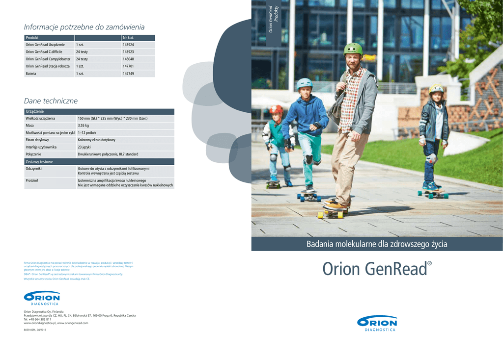 Produkt Orion GenRead Produkty Informacje potrzebne do zamówienia Nr kat. Orion GenRead Urządzenie 1 szt. 143924 Orion GenRead C.difficile 24 testy 143923 Orion GenRead Campylobacter 24 testy 148048 Orion GenRead Stacja robocza 1 szt. 147701 Bateria 1 szt. 147749 Dane techniczne Urządzenie Wielkość urządzenia 150 mm (Gł.) * 225 mm (Wys.) * 230 mm (Szer.) Masa 3.55 kg Możliwości pomiaru na jeden cykl 1–12 próbek Ekran dotykowy Kolorowy ekran dotykowy Interfejs użytkownika 23 języki Połączenie Dwukierunkowe połączenie, HL7 standard Zestawy testowe Odczynniki Gotowe do użycia z odczynnikami liofilizowanymi Kontrola wewnętrzna jest częścią zestawu Protokół Izotermiczna amplifikacja kwasu nukleinowego Nie jest wymagane oddzielne oczyszczanie kwasów nukleinowych Badania molekularne dla zdrowszego życia Firma Orion Diagnostica ma ponad 40letnie doświadczenie w rozwoju, produkcji i sprzedaży testów i urządzeń diagnostycznych przeznaczonych dla profesjonalnego personelu opieki zdrowotnej. Naszym głównym celem jest dbać o Twoje zdrowie. SIBA® i Orion GenRead® są zastrzeżonymi znakami towarowymi firmy Orion Diagnostica Oy. Wszystkie zestawy testów Orion GenRead posiadają znak CE. Orion Diagnostica Oy, Finlandia Przedstawicielstwo dla CZ, HU, PL, SK, Bělohorská 57, 169 00 Praga 6, Republika Czeska Tel. +48 664 382 811 www.oriondiagnostica.pl, www.oriongenread.com 8039-02PL, 08/2016 Orion GenRead ® Badania molekularne dla zdrowszego życia Szybki i łatwy w użyciu Oszczędza czas i zasoby laboratorium »» Krótki czas badania – wyniki w czasie poniżej 1 godziny »» Można stosować bez specjalnego przeszkolenia laboratoryjnego »» Zestawy gotowe do użycia, zawierają wszystkie potrzebne odczynniki Orion GenRead Urządzenie Elastyczny Umożliwia optymalizację przebiegu pracy »» Badanie 1–12 próbek jednocześnie »» Odpowiedni do różnego rodzaju laboratorium »» Umożliwia wykonywanie badania o dowolnej porze dnia Orion GenRead C. difficile Dokładny i niezawodny Samodzielne urządzenie »» Dwukierunkowe połączenie do systemu LIS/HIS »» Nie jest konieczny komputer zewnętrzny »» Szybkie i bezpieczne przesyłanie danych Orion GenRead Campylobacter Zestawy odczynników zawierają wszystkie niezbędne składniki »» Sprawdzona funkcjonalność »» Kontrola wewnętrzna każdego testu Wybór testów Do badania patogenów znajdujących się w przewodzie pokarmowym »» Orion GenRead Urządzenie »» Test Orion GenRead C. difficile »» Orion GenRead Campylobacter Już wkrótce »» Influenza A & B »» RSV Orion GenRead, mały system do wykrywania patogenów, zapewniający otrzymanie szybkich i dokładnych wyników dla różnego rodzaju laboratoriów. Urządzenie to można używać bez podłączenia do sieci dzięki wyposażeniu w akumulator. To łatwe w użyciu rozwiązanie oferuje niezawodny i przyjazny dla użytkownika interfejs podczas codziennej pracy w laboratorium. System Orion GenRead opiera się na opatentowanej przez firmę Orion Diagnostica technologii SIBA®, która jest izotermiczną amplifikacją kwasu nukleinowego. Technologia SIBA umożliwia dokładne wykrywanie patogenów i umożliwia przeprowadzenie badania molekularnego także poza tradycyjnymi laboratoriami PCR.