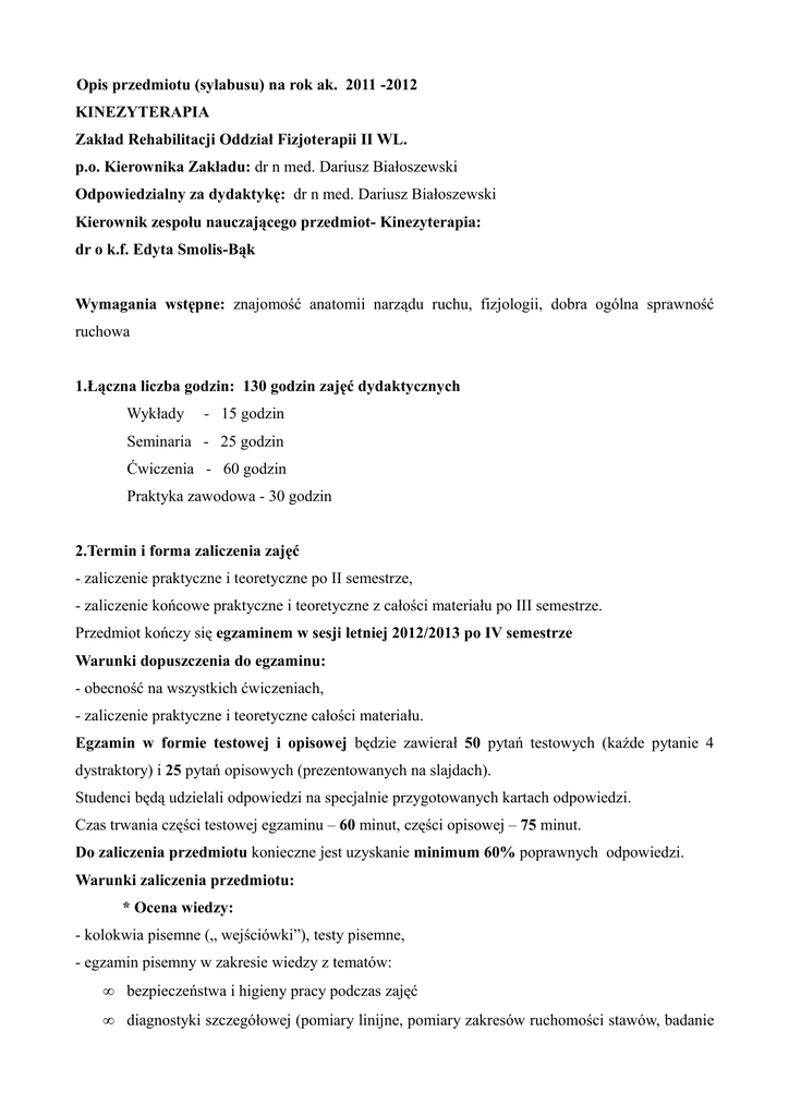 Opis przedmiotu (sylabusu) na rok ak. 2011 -2012 KINEZYTERAPIA Zakład Rehabilitacji Oddział Fizjoterapii II WL. p.o. Kierownika Zakładu: dr n med. Dariusz Białoszewski Odpowiedzialny za dydaktykę: dr n med. Dariusz Białoszewski Kierownik zespołu nauczającego przedmiot- Kinezyterapia: dr o k.f. Edyta Smolis-Bąk Wymagania wstępne: znajomość anatomii narządu ruchu, fizjologii, dobra ogólna sprawność ruchowa 1.Łączna liczba godzin: 130 godzin zajęć dydaktycznych Wykłady - 15 godzin Seminaria - 25 godzin Ćwiczenia - 60 godzin Praktyka zawodowa - 30 godzin 2.Termin i forma zaliczenia zajęć - zaliczenie praktyczne i teoretyczne po II semestrze, - zaliczenie końcowe praktyczne i teoretyczne z całości materiału po III semestrze. Przedmiot kończy się egzaminem w sesji letniej 2012/2013 po IV semestrze Warunki dopuszczenia do egzaminu: - obecność na wszystkich ćwiczeniach, - zaliczenie praktyczne i teoretyczne całości materiału. Egzamin w formie testowej i opisowej będzie zawierał 50 pytań testowych (każde pytanie 4 dystraktory) i 25 pytań opisowych (prezentowanych na slajdach). Studenci będą udzielali odpowiedzi na specjalnie przygotowanych kartach odpowiedzi. Czas trwania części testowej egzaminu – 60 minut, części opisowej – 75 minut. Do zaliczenia przedmiotu konieczne jest uzyskanie minimum 60% poprawnych odpowiedzi. Warunki zaliczenia przedmiotu: * Ocena wiedzy: - kolokwia pisemne („ wejściówki”), testy pisemne, - egzamin pisemny w zakresie wiedzy z tematów: • bezpieczeństwa i higieny pracy podczas zajęć • diagnostyki szczegółowej (pomiary linijne, pomiary zakresów ruchomości stawów, badanie przykurczów, ogólne zasady zapisywania wyników pomiaru, pomiary i ocena sprawności mięśni, testy funkcjonalne, analiza chodu, nauka prawidłowego chodu o kulach); • systematyki ćwiczeń indywidualnego usprawnienia pacjentów (ćwiczenia bierne, prowadzone, czynno-bierne, samowspomagane, w odciążeniu, czynne, w odciążeniu z oporem, z oporem, redresyjne, oddechowe, relaksacyjne, PIR); • koncepcji SET; • ćwiczeń ruchowych jako środka leczniczego dla osób niepełnosprawnych; • kształtowania sprawności i wydolności fizycznej pacjentów; • pomocy w ćwiczeniach i asekuracji ćwiczącego, • odpowiedniego doboru ćwiczeń dla poszczególnych grup pacjentów * Ocena umiejętności: • samodzielnego praktycznego wprowadzania w życie zdobytej wiedzy: przeprowadzanie wywiadu z pacjentem, badanie pacjenta (pomiary linijne, pomiary zakresów ruchomości stawów, badanie przykurczów, pomiary i ocena sprawności mięśni, testy funkcjonalne, analiza chodu, nauka chodu o kulach), prowadzenie ćwiczeń z zakresu kinezyterapii (ćwiczenia bierne, prowadzone, czynno-bierne, samowspomagane, w odciążeniu, czynne, w odciążeniu z oporem, z oporem, redresyjne, PIR, SET) • myślenia kategoriami „diagnozowania” ćwiczeń fizycznych w zależności od potrzeb ćwiczących; • profesjonalnego rozwiązywania zaistniałych problemów dotyczących prowadzenia zajęć indywidualnych i grupowych. * Ocena aktywności: • czynny udział w zajęciach Cel nauczania: Cele nauczania kinezyterapii w programach ośrodków kształcących w UE fizjoterapeutów są całkowicie zbieżne z tymi, które stawia przed sobą zespół nauczający tego przedmiotu w ramach Zakładu Rehabilitacji Oddziału Fizjoterapii II Wydziału Lekarskiego Warszawskiego Uniwersytetu Medycznego. Zasadnicze cele to: 1. Wyjaśnienie podstaw kinezyterapii jako działu lecznictwa, w którym wykorzystuje się właściwości ruchu w celach profilaktycznych, leczniczych i rehabilitacyjnych. 2. Stosowanie wiedzy z zakresu nauk medycznych, a w szczególności: anatomii, fizjologii, patologii do sprawnego wykonywania zadań zawodowych, w tym do organizacji i prowadzenia terapii ruchem. 3. Dobieranie właściwych technik badania i oceny narządu ruchu, układu krążenia i układu oddechowego w zależności od sytuacji, interpretowanie uzyskanych wyników badań. 4. Przedstawienie wskazań i przeciwwskazań do wykonywania poszczególnych ćwiczeń fizycznych. 5. Dobieranie pomocy i sprzętu ortopedycznego w zależności od rodzaju choroby i potrzeb pacjentów. 6. Interpretowanie przepisów bhp w odniesieniu do zdrowia własnego i pacjenta, instrukcji obsługi, użytkowania i konserwacji sprzętu rehabilitacyjnego stosowanego w kinezyterapii. 7. Wykorzystanie w sposób prawidłowy wiedzy teoretycznej i umiejętności praktycznych dla właściwego i sprawnego przeprowadzania poszczególnych ćwiczeń leczniczych. 8. Prawidłowe wykonywanie podstawowych badań poszczególnych układów i narządów na potrzeby kinezyterapii, ich interpretacja i dokumentowanie. 9. Zastosowanie odpowiednich technik wykonywania ćwiczeń leczniczych i stosowanie ich adekwatnie do możliwości pacjenta. 10. Organizacja swojego stanowiska pracy zgodna z przepisami i zasadami bhp. 11. Przygotowanie studentów do zajęć klinicznych w następnych semestrach nauki. Formuła przedmiotu ( rodzaje zajęć) • Wykłady • Ćwiczenia • Seminaria • Praktyki zawodowe • Kształcenie bez nauczyciela (praca własna) Metody dydaktyczne stosowane w zajęciach ze studentami: • Metody podające – proces przyswajania: wykład informacyjny, wyjaśnienie • Metody poszukujące, kreatywne - problemowe – proces odkrywania, związane z twórczym myśleniem i działaniem • Metody aktywizujące: - proaktywne (usamodzielniające) - uczą samokontroli i samooceny własnego działania, sprzyjają samodzielności myślenia, - dyskusja dydaktyczna, - samoocena studentów. • Metody reproduktywne (odtwórcze): niezbędne w rehabilitacji, uczą dokładności i prawidłowości wykonywania ćwiczeń. • Metody praktyczne: zajęcia praktyczne obejmujące badanie i ocenę narządu ruchu, przeprowadzanie poszczególnych ćwiczeń leczniczych, dobieranie pomocy i sprzętu ortopedycznego w zależności od rodzaju cho