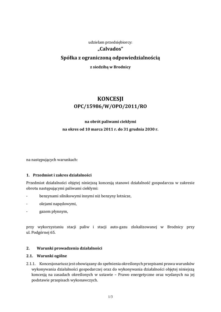 udzielam przedsiębiorcy: „Calvados” Spółka z ograniczoną odpowiedzialnością z siedzibą w Brodnicy KONCESJI OPC/15986/W/OPO/2011/RO na obrót paliwami ciekłymi na okres od 10 marca 2011 r. do 31 grudnia 2030 r. na następujących warunkach: 1. Przedmiot i zakres działalności Przedmiot działalności objętej niniejszą koncesją stanowi działalność gospodarcza w zakresie obrotu następującymi paliwami ciekłymi: - benzynami silnikowymi innymi niż benzyny lotnicze, - olejami napędowymi, - gazem płynnym, przy wykorzystaniu stacji paliw i stacji auto-gazu zlokalizowanej w Brodnicy przy ul. Podgórnej 65. 2. Warunki prowadzenia działalności 2.1. Warunki ogólne 2.1.1. Koncesjonariusz jest obowiązany do spełnienia określonych przepisami prawa warunków wykonywania działalności gospodarczej oraz do wykonywania działalności objętej niniejszą koncesją na zasadach określonych w ustawie – Prawo energetyczne oraz wydanych na jej podstawie przepisach wykonawczych. 1/3 2.1.2. Koncesjonariusz jest obowiązany do przestrzegania obowiązujących ustaw dotyczących jakości paliw ciekłych, ochrony środowiska, zasad postępowania z odpadami i bezpieczeństwa ekologicznego, a także wydanych na ich podstawie przepisów wykonawczych, a w szczególności do terminowej realizacji określonych tymi przepisami przedsięwzięć zabezpieczających środowisko przed szkodliwym oddziaływaniem działalności wykonywanej na podstawie niniejszej koncesji oraz do posiadania wymaganych zezwoleń i uzgodnień. 2.1.3. Koncesjonariusz jest obowiązany do przestrzegania przepisów ustawy z 18 lipca 2001 r. – Prawo wodne (Dz. U. z 2005 r. Nr 239, poz. 2019 ze zmianami), a w szczególności do posiadania pozwoleń wodnoprawnych, gdy są one wymagane. 2.1.4. Koncesjonariusz jest obowiązany do wykonywania działalności w sposób nie stanowiący zagrożenia dla życia lub zdrowia ludzkiego oraz nie narażający na powstanie szkód materialnych. 2.1.5. Koncesjonariusz nie będzie zawierać umów kupna – sprzedaży paliw ciekłych z przedsiębiorstwami energetycznymi, które nie posiadają stosownej koncesji w przypadkach, gdy koncesja taka jest wymagana przepisami ustawy – Prawo energetyczne. 2.2. Szczególne warunki wykonywania działalności objętej koncesją ze względu na właściwą obsługę odbiorców 2.2.1. Koncesjonariusz jest obowiązany do utrzymywania stanu technicznego oraz wyposażenia obiektów, instalacji i urządzeń zapewniających wysoką efektywność i najlepszą jakość wykonywanej działalności objętej niniejszą koncesją, z uwzględnieniem racjonalnego poziomu kosztów, przy zachowaniu obowiązujących przepisów określających wymogi techniczne, w tym metrologiczne, jakościowe i ochrony środowiska oraz do przestrzegania przepisów o bezpieczeństwie i higienie pracy, w tym w szczególności w zakresie bezpieczeństwa pożarowego oraz bezpieczeństwa ludzi i mienia. 2.2.2. Koncesjonariusz jest obowiązany do zapewnienia, aby czynności w zakresie samodzielnej eksploatacji instalacji i urządzeń wykonywały wyłącznie osoby legitymujące się posiadaniem wymaganych w tym zakresie kwalifikacji. 2.2.3. Koncesjonariuszowi nie wolno czynić przedmiotem obrotu paliw ciekłych, których parametry jakościowe są niezgodne z parametrami określonymi obowiązującymi przepisami i wynikającymi z zawartych umów. 2.2.4. Koncesjonariusz jest obowiązany do posiadania ważnego dokumentu określającego parametry fizyko – chemiczne danej partii paliwa będącego przedmiotem obrotu, wydanego każdorazowo przez bezpośredniego sprzedawcę tegoż paliwa, a także do wydania na jego podstawie każdemu przedsiębiorcy prowadzącemu obrót paliwami ciekłymi, a innemu odbiorcy na jego żądanie, oświadczenia we własnym imieniu o zgodności parametrów jakości dostarczonego paliwa z parametrami jakości wynikającymi z obowiązujących w tym zakresie przepisów i z zawartej z tym odbiorcą umowy. W przypadku importu lub przesunięcia wewnątrzwspólnotowego paliw ciekłych określonych niniejszą koncesją, Koncesjonariusz jest obowiązany do przeprowadzania kontroli jakości wprowadzanych do obrotu paliw celem sprawdzenia dotrzymywania przez te paliwa parametrów jakościowych wynikających z krajowych norm jakościowych określonych w obowiązujących przepisach oraz przekazania wyników badań odbiorcy. 2/3 2.2.5. Koncesjonariusz jest obowiązany do utrzymywania lub zagwarantowania możliwości pozyskania środków finansowych lub majątku pozwalającego na zaspokojenie roszczeń osób trzecich mogących powstać wskutek niewłaściwego prowadzenia działalności objętej koncesją lub szkód w środowisku. 2.3. Warunki zaprzestania działalności po wygaśnięciu koncesji lub jej cofnięciu W przypadku, gdy działalność objęta niniejszą koncesją wywiera wpływ na środowisko, Koncesjonariusz jest obowiązany, w trakcie prowadzenia działalności koncesjonowanej oraz po jej zaprzestaniu, do likwidacji skutków tej działalności. 2.4. Sprawozdawczość i udzielanie informacji 2.4.1. Koncesjonariusz jest obowiązany zawiadomić Prezesa URE o istotnych zmianach dotyczących wykonywanej działalności objętej niniejszą koncesją (w tym w szczególności nazwy, siedziby, numeru w rejestrze przedsiębiorców, numeru identyfikacji podatkowej, rozszerzenia bądź ograniczenia zakresu tej działalności) nie później niż 14 dni od dnia ich powstania. 2.4.2. Koncesjonariusz jest obowiązany do pisemnego poinformowania Prezesa URE o zamiarze zaprzestania działalności koncesjonowanej nie później niż na 3 miesiące przed przewidywaną datą zaprzestania działalności. Koncesjonariusz jest zobowiązany do pisemnego informowania Prezesa Urzędu Regulacji Energetyki o zamiarze połączenia z innymi podmiotami, nie później niż na 30 dni przed planowaną datą połączenia. 3/3