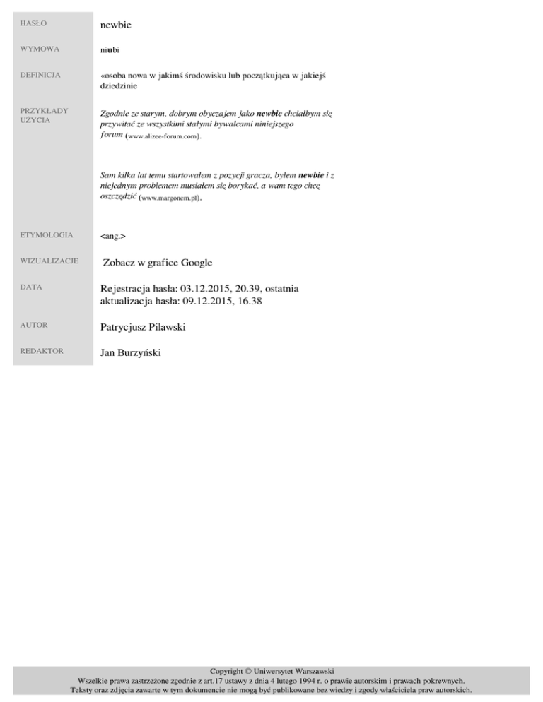 HASŁO newbie WYMOWA niubi DEFINICJA «osoba nowa w jakimś środowisku lub początkująca w jakiejś dziedzinie» PRZYKŁADY UŻYCIA Zgodnie ze starym, dobrym obyczajem jako newbie chciałbym się przywitać ze wszystkimi stałymi bywalcami niniejszego forum (www.alizee-forum.com). Sam kilka lat temu startowałem z pozycji gracza, byłem newbie i z niejednym problemem musiałem się borykać, a wam tego chcę oszczędzić (www.margonem.pl). ETYMOLOGIA WIZUALIZACJE <ang.> Zobacz w grafice Google DATA Rejestracja hasła: 03.12.2015, 20.39, ostatnia aktualizacja hasła: 09.12.2015, 16.38 AUTOR Patrycjusz Pilawski REDAKTOR Jan Burzyński Copyright © Uniwersytet Warszawski Wszelkie prawa zastrzeżone zgodnie z art.17 ustawy z dnia 4 lutego 1994 r. o prawie autorskim i prawach pokrewnych. Teksty oraz zdjęcia zawarte w tym dokumencie nie mogą być publikowane bez wiedzy i zgody właściciela praw autorskich. Powered by TCPDF (www.tcpdf.org)