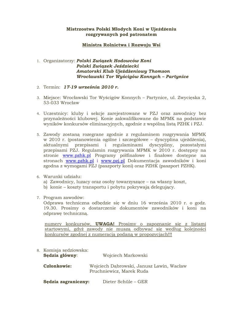 Mistrzostwa Polski Młodych Koni w Ujeżdżeniu rozgrywanych pod patronatem Ministra Rolnictwa i Rozwoju Wsi 1. Organizatorzy: Polski Związek Hodowców Koni Polski Związek Jeździecki Amatorski Klub Ujeżdżeniowy Thomson Wrocławski Tor Wyścigów Konnych – Partynice 2. Termin: 17-19 września 2010 r. 3. Miejsce: Wrocławski Tor Wyścigów Konnych – Partynice, ul. Zwycięska 2, 53-033 Wrocław 4. Uczestnicy: kluby i sekcje zarejestrowane w PZJ oraz zawodnicy bez przynależności klubowej. Konie zakwalifikowane do MPMK na podstawie wyników konkursów eliminacyjnych, zgodnie z wspólną listą PZHK i PZJ. 5. Zawody zostaną rozegrane zgodnie z regulaminem rozgrywania MPMK w 2010 r. (postanowienia ogólne i szczegółowe – dyscyplina ujeżdżenia), aktualnymi przepisami i regulaminami dyscypliny, pozostałymi przepisami PZJ. Regulamin rozgrywania MPMK w 2010 r. dostępny na stronie www.pzhk.pl Programy półfinałowe i finałowe dostępne na stronach www.pzhk.pl i www.pzj.pl Dokumentacja zawodników i koni zgodna z wymogami PZJ (paszporty koni) oraz PZHK (paszport PZHK). 6. Warunki udziału: a) Zawodnicy, luzacy oraz osoby towarzyszące – na własny koszt, b) konie – koszty transportu i pobytu pokrywają delegujący. 7. Program zawodów: Odprawa techniczna odbędzie się w dniu 16 września 2010 r. o godz. 19.30. Prosimy o dostarczenie dokumentów zawodników i koni na odprawę techniczną. numery konkursów, UWAGA! Prosimy o zapoznanie się z listami startowymi, gdyż zawody nie muszą odbywać się według kolejności konkursów zgodnej z numeracją podaną w propozycjach!!! 8. Komisja sędziowska: Sędzia główny: Członkowie: Sędzia zagraniczny: Wojciech Markowski Wojciech Dąbrowski, Janusz Lawin, Wacław Pruchniewicz, Marek Ruda Dieter Schüle – GER 9. Gospodarz toru: Tadeusz Dębowski Komisja odwoławcza: Tadeusz Łanowy, Zbigniew Dąbrowski Sekretariat i sprawy organizacyjne: J. Wierzbicka, M. Szewczyk, M. Skubisz 10. Program zawodów Czwartek, 16 września 2010 r. • Godz. 16.00 – przegląd weterynaryjny dla koni 5 i 6 letnich • Godz. 19.30 – odprawa techniczna Piątek, 17 września 2010 r. • Godz. 7.00 – I próba dla koni 4-letnich, I część – pokaz koni w ręku na trókącie • Godz. 11.30 – konkurs rozgrzewkowy (nieobowiązkowy) dla koni 4letnich, bezpośrednio po jego zakończeniu konkursy półfinałowe dla koni 5 i 6-letnich Sobota, 18 września 2010 r. • Godz. 11.00 – konkursy półfinałowe dla koni 4-, 5- i 6-letnich Niedziela, 19 września 2010 r. • Godz. 9.00 – konkursy finałowe dla koni 4-, 5- i 6-letnich Bezpośrednio po konkursach uroczysta dekoracja i zakończenie Mistrzostw Polski Młodych Koni 11. Opłaty i zgłoszenia: 11.1 Boksy oraz opłata organizacyjna: stajnia letnia – boks z pierwszą ściółką 250,00 zł za całe zawody, tj. od 16 (godz. 12.00) do 19 września 2010 r. Zgłoszenia przyjmuje wyłącznie pan Jakub Kasprzak tel. 0.71.333.45.16 11.2 W przypadku wcześniejszego przyjazdu na zawody, ewentualnie późniejszego wyjazdu pobierana będzie dodatkowa opłata w wysokości 50,00 zł dziennie za boks. Uwaga! Prosimy o zabranie na zawody wiader-żłobów 11.3 Podłączenie do prądu – tylko po uprzednim zaznaczeniu tego w zgłoszeniu i uzyskaniu potwierdzenia możliwości podłączenia – opłata za całe zawody – 70,00 zł 11.4 Na miejscu możliwość zakupu siana – 10,00 zł kostka i słomy – 6,00 zł kostka 11.5 15,00 zł od każdego konia biorącego udział w Zawodach Ogólnopolskich na Fundusz Badań Antydopingowych. Opłat należy dokonać wraz ze zgłoszeniem ostatecznym na konto bankowe: Amatorski Klub Ujeżdżeniowy THOMSON, ul. Zwycięska 2, 53-033 Wrocław, e-mail: [email protected], Bank Gospodarki Żywnościowej Oddział Wrocław nr 50 2030 0045 1110 0000 0035 8590 wraz ze zgłoszeniem. Kara finansowa za zgłoszenie konia lub uiszczenie opłat po terminie wynosi 250,00 zł od konia. Uwaga!!! Pary, za które nie zostaną uiszczone opłaty nie zostaną dopuszczone do startu. Kluby, których zawodnicy zostali zgłoszeni do startu i nie zgłosili rezygnacji w terminie zgłoszenia ostatecznego zostaną obciążone wszystkimi opłatami dotyczącymi ich zawodników. Organizator nie pośredniczy w zamawianiu noclegów. Najbliższe hotele: a) Hotel AGRO, ul. Zwycięska 12, Wrocław, tel. 0.71.339.80.21 b) Hotel Bacero, ul. Ołtaszyńska 107, Wrocław, tel. 0.71.339.75.50, email: [email protected] c) Hotel Wieniawa, ul. Gajowicka 130, Wrocław, tel. 0.71.365.33.03, email: [email protected] d) Hotel Novotel, ul. Wyścigowa 35, Wrocław, tel. 0.71.339.85.15, email: [email protected] e) Hotel Podkowa, ul. Wojszycka 8, Wrocław, tel. 0.71.339.83.60, email: [email protected] f) Hotel Wrocław Orbis, ul. Powstańców Śląskich 7, Wrocław, tel. 0.71.361.46.51, e-mail: [email protected] g) Hotel Bielany, ul. Klecińska 3, Bielany Wrocławskie, tel. 0.71.311.27.94, e-mail: [email protected] Hotele AGRO, Bacero, Novotel w odległości ok. 0,5 km od WTWK – Partynice, hotel Podkowa w odległości ok. 1 km, hotel Bielany ok. 2,5 km, hotel Wrocław ok. 4,0 km od WTWK – Partynice, hotel Wieniawa ok. 7 min. jazdy samochodem. Noclegi zamawiać należy samodzielnie. W trakcie imprezy czynny będzie bufet na terenie WTWK – Partynice. 12. Warunki techniczne 12.1 Czworobok konkursowy - podłoże piaszczyste. 12.2 Czworoboki rozprężeniowe - podłoże piaszczyste. przysyłania zgłoszeń wstępnych upływa 6 września 2010 r. W terminie do 13 września 2010 r. należy dokonać zgłoszeń ostatecznych lub wycofać konia ze startu. Zgłoszenia wstępne i zgłoszenia ostateczne wraz z potwierdzeniem dokonania opłat należy nadsyłać na adres: Amatorski Klub Ujeżdżeniowy Thomson, ul. Zwycięska 2, 53-033 Wrocław, e-mail: [email protected] Zgłoszeń należy dokonywać na DRUKACH OFICJALNYCH PZHK, z obowiązkowym podaniem nazwy konkursu, imienia, nazwiska 13. Termin zawodnika, nazwy konia z pochodzeniem (Ojcie