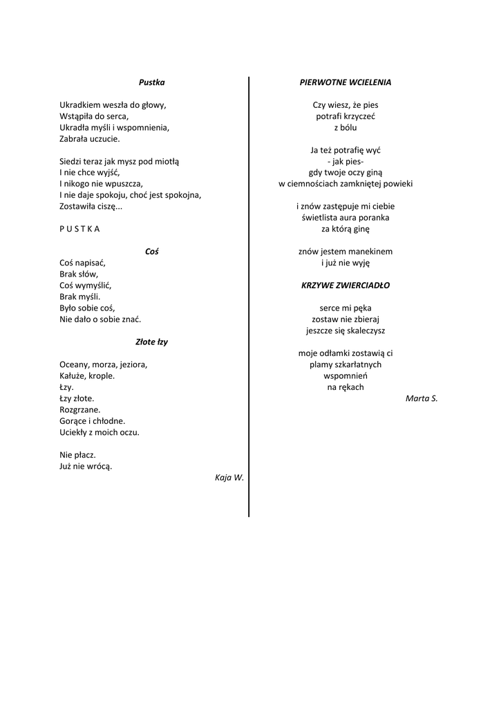 Pustka PIERWOTNE WCIELENIA Ukradkiem weszła do głowy, Wstąpiła do serca, Ukradła myśli i wspomnienia, Zabrała uczucie. Czy wiesz, że pies potrafi krzyczeć z bólu Ja też potrafię wyć - jak piesgdy twoje oczy giną w ciemnościach zamkniętej powieki Siedzi teraz jak mysz pod miotłą I nie chce wyjść, I nikogo nie wpuszcza, I nie daje spokoju, choć jest spokojna, Zostawiła ciszę... i znów zastępuje mi ciebie świetlista aura poranka za którą ginę PUSTKA Coś znów jestem manekinem i już nie wyję Coś napisać, Brak słów, Coś wymyślić, Brak myśli. Było sobie coś, Nie dało o sobie znać. KRZYWE ZWIERCIADŁO serce mi pęka zostaw nie zbieraj jeszcze się skaleczysz Złote łzy moje odłamki zostawią ci plamy szkarłatnych wspomnień na rękach Oceany, morza, jeziora, Kałuże, krople. Łzy. Łzy złote. Rozgrzane. Gorące i chłodne. Uciekły z moich oczu. Marta S. Nie płacz. Już nie wrócą. Kaja W.