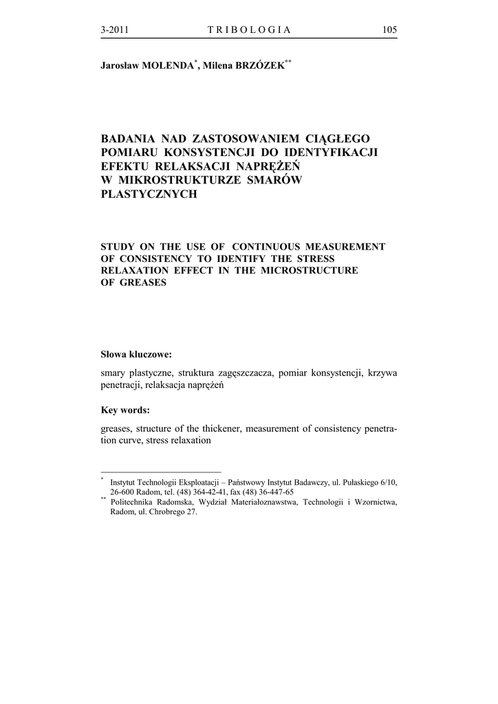 3-2011 TRIBOLOGIA 105 Jarosław MOLENDA*, Milena BRZÓZEK** BADANIA NAD ZASTOSOWANIEM CIĄGŁEGO POMIARU KONSYSTENCJI DO IDENTYFIKACJI EFEKTU RELAKSACJI NAPRĘŻEŃ W MIKROSTRUKTURZE SMARÓW PLASTYCZNYCH STUDY ON THE USE OF CONTINUOUS MEASUREMENT OF CONSISTENCY TO IDENTIFY THE STRESS RELAXATION EFFECT IN THE MICROSTRUCTURE OF GREASES Słowa kluczowe: smary plastyczne, struktura zagęszczacza, pomiar konsystencji, krzywa penetracji, relaksacja naprężeń Key words: greases, structure of the thickener, measurement of consistency penetration curve, stress relaxation * ** Instytut Technologii Eksploatacji – Państwowy Instytut Badawczy, ul. Pułaskiego 6/10, 26-600 Radom, tel. (48) 364-42-41, fax (48) 36-447-65 Politechnika Radomska, Wydział Materiałoznawstwa, Technologii i Wzornictwa, Radom, ul. Chrobrego 27. 106 TRIBOLOGIA 3-2011 Streszczenie W artykule krótko omówiono budowę smarów plastycznych i wskazano na szczególny wpływ oddziaływań międzymolekularnych na stabilność mikrostruktury kompozycji smarowej. Zaproponowano modyfikację dotychczasowej normatywnej procedury pomiaru konsystencji smarów plastycznych, polegającą na wprowadzeniu ciągłej rejestracji wartości penetracji badanego produktu z zastosowaniem techniki triangulacji laserowej. Rezultatem takiego pomiaru jest krzywa penetracji przedstawiająca zmiany wartości liczby penetracji w czasie badania. Przeprowadzone wstępne testy wskazują, że modyfikacja taka umożliwia obserwację stabilności mikrostruktury smaru podczas działania na nią naprężeń, związanych z zagłębianiem się stożka pomiarowego. Artykuł zawiera analizę obserwowanych fluktuacji krzywych penetracji, które mogą być efektem relaksacji naprężeń w strukturze smarów plastycznych. Podjęto także próbę określenia średnich czasów oraz wartości efektów relaksacyjnych dla smarów plastycznych. Stwierdzono, iż zastosowanie ciągłej rejestracji położenia stożka pomiarowego pozwala na rozszerzenie informatywności uzyskiwanych wyników pomiaru penetracji. WPROWADZENIE Smary plastyczne pod względem fizykochemicznym są dyspersjami stałych zagęszczaczy w fazie ciekłej, którą stanowi olej bazowy. Zagęszczacz, poprzez wiązania fizykochemiczne, tworzy elastyczną, przestrzenną strukturę sieciową pozwalającą na zokludowanie oleju, nadając smarowi wymaganą konsystencję oraz specyficzne właściwości fizykochemiczne, w tym reologiczne, do których zalicza się m.in. zdolność do tiksotropii, pełzania, a także relaksacji naprężeń w strukturze smarów. Jednym z głównych parametrów opisujących jakość smaru jest konsystencja, określana jako stopień zagęszczenia produktu, wynikający z oddziaływań międzycząsteczkowych i międzyfazowych użytej bazy olejowej oraz zagęszczacza. Parametr ten opisuje właściwości reologiczne smarów oraz obejmuje kompleksowo zależność pomiędzy oddziaływaniami fizykochemicznymi składników smaru a stabilnością jego mikrostruktury [L. 1, 2]. Na podstawie pomiaru konsystencji opracowano także obowiązującą, międzynarodową klasyfikację smarów plastycznych wg NLGI. Klasyfikacja ta wyróżnia 9 klas konsystencji smarów, począw- 3-2011 TRIBOLOGIA 107 szy od płynnych przez półpłynne i twarde, kończąc na twardych smarach brykietowych. Dotychczasowa procedura pomiarowa określania konsystencji smarów plastycznych, opisana normą PN-C-04133:1988 „Pomiar penetracji smarów plastycznych i petrolatum penetrometrem ze stożkiem”, polega na zmierzeniu głębokości, na jaką w badanym smarze zanurzy się w ciągu 5 sekund znormalizowany stożek o określonej masie, pod działaniem siły ciężkości. Wartość tego zanurzenia wyrażana jest za pomocą liczby penetracji stanowiącej 0,1 milimetra. Jednak tak ustalone warunki wykonania testu nie pozwalają na obserwację dynamicznych zmian właściwości fizykochemicznych smaru podczas penetracji, co dałoby informację m.in. o upłynnieniu produktu lub występowaniu efektu relaksacji naprężeń. Wydaje się, iż modyfikacja metody badawczej poprzez zastosowanie ciągłej rejestracji zagłębiania się stożka w smarze pozwoliłaby na znaczne rozszerzenie informatywności badań konsystencji [L. 3]. W związku z powyższym celem przeprowadzonego eksperymentu była ocena przydatności ciągłego pomiaru konsystencji smarów plastycznych do identyfikacji dynamicznych zmian mikrostrukturalnych w kompozycji smarowej poprzez analizę fluktuacji obserwowanych na rejestrowanych krzywych penetracji smarów plastycznych. METODYKA I OBIEKTY BADAŃ Badania konsystencji smarów przeprowadzono z wykorzystaniem penetrometru laserowego PL – 10 DC produkcji ITeE – PIB w Radomiu. Innowacyjnym rozwiązaniem jest możliwość ciągłej rejestracji i bieżącej obserwacji dynamicznych zmian wartości zanurzenia stożka pomiarowego. Pozwala ona na precyzyjny pomiar liczby penetracji wg wybranej metodyki, zakładającej pomiar przemieszczenia liniowego stożka penetracyjnego w badanej próbce. Ciągła obserwacja zmian zagłębienia stożka (z rozdzielczością 50 µm) jest możliwa dzięki zastosowaniu w omawianym urządzeniu techniki triangulacji laserowej oraz możliwości transferu danych do komputera, wyposażonego w opracowane w ITeE – PIB specjalne oprogramowanie [L. 4, 5]. Podczas pomiarów rejestrowano krzywe penetracji, czyli zależności liczby penetracji od czasu pomiaru, w zakresie od 0 do 5 sekund. Prezentowane wyniki penetracji odnoszą się do próbek niepoddawanych uprzednio procesowi ugniatania. Pomiary wykonano 108 TRIBOLOGIA 3-2011 z użyciem stożków i naczyń do badań w skali ½, których wymiary określa norma PN-C-04133:1988 „Pomiar penetracji smarów plastycznych i petrolatum penetrometrem ze stożkiem”. Obiektami badań były kompozycje smarowe, sporządzone z wykorzystaniem mineralnej oraz roślinnej bazy olejowej. W charakterze bazy mineralnej zastosowano nietoksyczny biały olej parafin