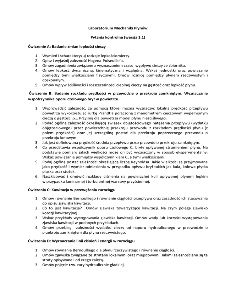 Pytania kontrolne z Laboratorium Mechaniki Płynów