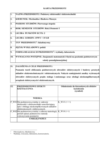 KARTA PRZEDMIOTU 1. NAZWA PRZEDMIOTU: Podstawy elektroniki i elektrotechniki 2. KIERUNEK: Mechanika i Budowa Maszyn 3. POZIOM STUDIÓW: Pierwszego stopnia 4. ROK/ SEMESTR STUDIÓW: Rok I/Semestr I 5. LICZBA PUNKTÓW ECTS: 2 6. LICZBA GODZIN: 15WY + 15 LB 7. TYP PRZEDMIOTU1: fakultatywny 8. JĘZYK WYKŁADOWY: polski 9. FORMA REALIZACJI PRZEDMIOTU2: wykłady, laboratoria 10. WYMAGANIA WSTĘPNE: Znajomość matematyki i fizyki na poziomie podstawowym szkoły ponadgimnazjalnej 11. ZAŁOŻENIA I CELE PRZEDMIOTU: Poznanie teorii obliczania podstawowych obwodów elektrycznych i budowy prostych układów elektrotechnicznych i elektronicznych. Nabycie umiejętności analizy wybranych obwodów elektrycznych prądu stałego i zmiennego oraz obsługi nieskomplikowanych urządzeń elektrycznych i elektronicznych. 12. PRZEDMIOTOWE EFEKTY KSZTAŁCENIA Odniesienie do kierunkowych efektów kształcenia (symbol) WIEDZA P_W01Ma podstawową wiedzę w zakresie K_W13 (+++) elektroniki i elektrotechniki umożliwiającą opis i obsługę nieskomplikowanych układów elektronicznych i elektrycznych. P_W02Ma podstawową wiedzę z zakresu metrologii, K_W14 (++) potrafi opisać podstawowe metody wykonywania pomiarów UMIEJĘTNOŚCI 1 2 Obowiązkowy, fakultatywny. Wykłady, ćwiczenia, laboratoria, konwersatoria. K_U09 (+++) P_U01 Umie samodzielnie lub w zespole wykonać proste zadania badawcze z elektroniki i elektrotechniki korzystając z instrukcji laboratoryjnej. P_U02 Potrafi zastosować zasady bezpieczeństwa i higieny pracy w laboratorium elektroniki i elektrotechniki. KOMPETENCJE SPOŁECZNE K_U11 (++) K_K03 (++) P_K01 Potrafi pracować samodzielnie i w grupie przyjmować w niej rolę członka lub lidera zespołu. 13. METODY OCENY EFEKTÓW KSZTAŁCENIA Symbol przedmiotowego efektu kształcenia 1 P_W01 2 P_W02, P_U01 3 P_U02 4 P_K01 Metody (sposoby) oceny3 Typ oceny4 Forma dokumentacji Końcowe zaliczenie ustne Podsumowująca Dziennik prowadzącego Ocena wyników pomiarów i oddanych sprawozdań Formująca Ocena pracy studenta podczas ćwiczeń laboratoryjnych Ocena wyników pomiarów i sprawozdań wykonanych pod kierunkiem lidera zespołu Formująca Formująca Dziennik prowadzącego, sprawozdania Dziennik prowadzącego Dziennik prowadzącego, sprawozdania 14. KRYTERIA OCENY OSIĄGNIĘTYCH EFEKTÓW KSZTAŁCENIA (opisowe, procentowe, punktowe, inne ……………………………. formy oceny do wyboru przez wykładowcę) EFEKTY NA OCENĘ KSZTAŁCENIA 3,0 P_W01 Ponad 52% do 63% punktów P_W02, P_U01, Poprawnie P_K01 wykonane pomiary, obliczenia i sprawozdanie bez rażących błędów 3 4 NA OCENĘ 3,5 Ponad 63% do 74% punktów Poprawnie wykonane pomiary, obliczenia i sprawozdanie NA OCENĘ 4.0 Ponad 74% do 84% punktów Dobrze wykonane pomiary, obliczenia i sprawozdanie z dobrą dyskusja błędu NA OCENĘ 4,5 Ponad 84% do 93% punktów Bardzo dobrze wykonane pomiary, obliczenia i sprawozdanie z dyskusją błędu i poprawnymi wnioskami NA OCENĘ 5,0 Ponad 93 % punktów Bardzo dobrze wykonane pomiary, obliczenia i wzorcowo wykonane sprawozdanie z dyskusją błędu i Ocenianie ciągłe (bieżące przygotowanie do zajęć), śródsemestralne zaliczenie pisemne, śródsemestralne zaliczenie ustne, końcowe zaliczenia pisemne, końcowe zaliczenia ustne, egzamin pisemny, egzamin ustny, praca semestralna, ocena umiejętności ruchowych, praca dyplomowa, projekt, kontrola obecności Formująca, podsumowująca. P_U02 Zna zasady BHP Zna i stosuje zasady BHP Zna i starannie stosuje zasady BHP Zna dobrze i starannie stosuje zasady BHP wnioskami Zna dobrze i starannie stosuje zasady BHP oraz poucza innych 15. WARUNKI UZYSKANIA ZALICZENIA PRZEDMIOTU: ■ 16. Osiągnięcie założonych efektów kształcenia i pozytywny wynik zaliczenia egzaminu pisemnego egzaminu ustnego egzaminu praktycznego egzaminu końcowego ……………………… TREŚCI PROGRAMOWE Forma zajęć5 (liczba godz.) Treść zajęć Symbol przedmiotowych efektów kształcenia Wykłady 1. 2. 3. 4. 5. 6. 7. 8. 9. 5 Podstawowe pojęcia, wielkości i jednostki elektryczne stosowane w elektronice i elektrotechnice. Pole elektryczne, potencjał i napięcie, przenikalność dielektryczna, prawo Gaussa, pojemność elektryczna, kondensatory, łączenie kondensatorów, energia kondensatora. Prąd elektryczny, prawo Ohma, elementy aktywne i pasywne, rezystancja przewodników, obwód elektryczny, I i II prawo Kirchhoffa, łączenie rezystancji, praca i moc prądu stałego, źródła napięcia i prądu oraz ich łączenie. Rozwiązywanie obwodów prądu stałego metodą klasyczną, oczkową i transfiguracji. Twierdzenie Thevenina i Nortona. Obwody nieliniowe. Pole magnetyczne, oddziaływanie na przewodnik z prądem, właściwości magnetyczne ciał, strumień indukcji, obwody magnetyczne – przykłady obliczania, zjawisko samoindukcji i indukcji wzajemnej, energia pola, prądy wirowe, transformatory. Prąd zmienny, wartość chwilowa, średnia i skuteczna napięcia i natężenia, praca i moc, moc czynna, bierna i pozorna, współczynnik mocy, analiza obwodów RLC, rezonans napięć i prądów, włączanie i wyłączanie obwodów RL i RC. Prąd trójfazowy, połączenia gwiazda trójkąt. Maszyny szeregowe i bocznikowe prądu stałego. Maszyny synchroniczne i asynchroniczne prądu przemiennego. Półprzewodniki – wiadomości podstawowe, złącze p-n, diody półprzewodnikowe, tranzystory i tyrystory, rodzaje, charakterystyki i zastosowania. Układy prostownicze, filtry pasywne i aktywne, zasilacze stabilizowane, wzmacniacze mocy, generatory, układy dwustanowe, mikroelektronika. Wykład 1 godz. Wykład 1 godz. P_W01, P_W02 Wykład 1 godz. P_W01 Wykład 2 godz. P_W01 Wykład 2 godz P_W01 Wykład 2 godz P_W01 Wykład 1 godz Wykład 2 godz P_W01 Wykład 3 godz P_W01 Wykłady, ćwiczenia, laboratoria, samodzielne prowadzenie zajęć przez studenta. P_W01 P_W01 Ćwiczenia 1. Bezpieczeństwo i higiena pracy w laboratorium elektroniki i elektrotechniki. Obsługa urządzeń