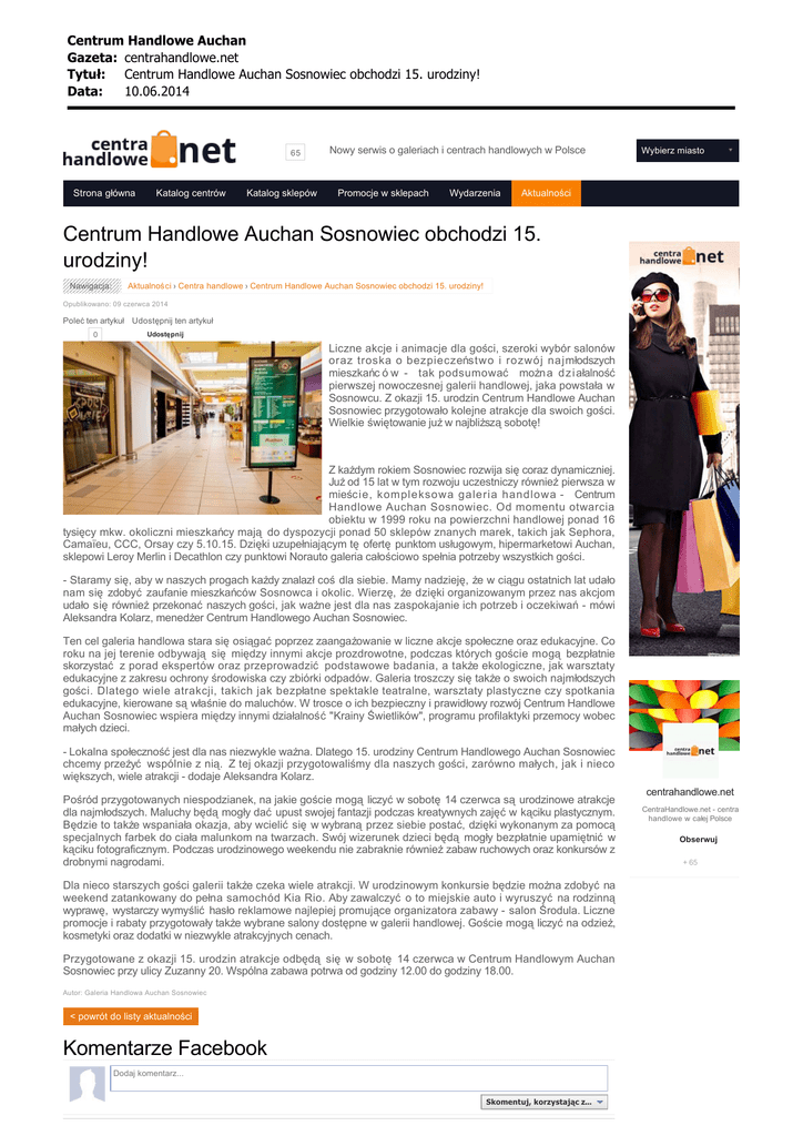 Centrum Handlowe Auchan Gazeta: centrahandlowe.net Tytu³: Centrum Handlowe Auchan Sosnowiec obchodzi 15. urodziny! Data: 10.06.2014 65 Strona główna Katalog centrów Katalog sklepów Nowy serwis o galeriach i centrach handlowych w Polsce Promocje w sklepach Wydarzenia Wybierz miasto Aktualności Centrum Handlowe Auchan Sosnowiec obchodzi 15. urodziny! Nawigacja: Aktualności › Centra handlowe › Centrum Handlowe Auchan Sosnowiec obchodzi 15. urodziny! Opublikowano: 09 czerwca 2014 Poleć ten artykuł Udostępnij ten artykuł 0 Udostępnij Liczne akcje i animacje dla gości, szeroki wybór salonów oraz troska o bezpieczeństwo i rozwój najmłodszych mieszkańc ó w - tak podsumować możn a d z i ałalność pierwszej nowoczesnej galerii handlowej, jaka powstała w Sosnowcu. Z okazji 15. urodzin Centrum Handlowe Auchan Sosnowiec przygotowało kolejne atrakcje dla swoich gości. Wielkie świętowanie już w najbliższą sobotę! Z każdym rokiem Sosnowiec rozwija się coraz dynamiczniej. Już od 15 lat w tym rozwoju uczestniczy również pierwsza w mieście, kompleksowa galeria handlowa - Centrum Handlowe Auchan Sosnowiec. Od momentu otwarcia obiektu w 1999 roku na powierzchni handlowej ponad 16 tysięcy mkw. okoliczni mieszkańcy mają do dyspozycji ponad 50 sklepów znanych marek, takich jak Sephora, Camaïeu, CCC, Orsay czy 5.10.15. Dzięki uzupełniającym tę ofertę punktom usługowym, hipermarketowi Auchan, sklepowi Leroy Merlin i Decathlon czy punktowi Norauto galeria całościowo spełnia potrzeby wszystkich gości. - Staramy się, aby w naszych progach każdy znalazł coś dla siebie. Mamy nadzieję, że w ciągu ostatnich lat udało nam się zdobyć zaufanie mieszkańców Sosnowca i okolic. Wierzę, że dzięki organizowanym przez nas akcjom udało się również przekonać naszych gości, jak ważne jest dla nas zaspokajanie ich potrzeb i oczekiwań - mówi Aleksandra Kolarz, menedżer Centrum Handlowego Auchan Sosnowiec. Ten cel galeria handlowa stara się osiągać poprzez zaangażowanie w liczne akcje społeczne oraz edukacyjne. Co roku na jej terenie odbywają się między innymi akcje prozdrowotne, podczas których goście mogą bezpłatnie skorzystać z porad ekspertów oraz przeprowadzić podstawowe badania, a także ekologiczne, jak warsztaty edukacyjne z zakresu ochrony środowiska czy zbiórki odpadów. Galeria troszczy się także o swoich najmłodszych gości. Dlatego wiele atrakcji, takich jak bezpłatne spektakle teatralne, warsztaty plastyczne czy spotkania edukacyjne, kierowane są właśnie do maluchów. W trosce o ich bezpieczny i prawidłowy rozwój Centrum Handlowe Auchan Sosnowiec wspiera między innymi działalność "Krainy Świetlików", programu profilaktyki przemocy wobec małych dzieci. - Lokalna społeczność jest dla nas niezwykle ważna. Dlatego 15. urodziny Centrum Handlowego Auchan Sosnowiec chcemy przeżyć wspólnie z nią. Z tej okazji przygotowaliśmy dla naszych gości, zarówno małych, jak i nieco większych, wiele atrakcji - dodaje Aleksandra Kolarz. Pośród przygotowanych niespodzianek, na jakie goście mogą liczyć w sobotę 14 czerwca są urodzinowe atrakcje dla najmłodszych. Maluchy będą mogły dać upust swojej fantazji podczas kreatywnych zajęć w kąciku plastycznym. Będzie to także wspaniała okazja, aby wcielić się w wybraną przez siebie postać, dzięki wykonanym za pomocą specjalnych farbek do ciała malunkom na twarzach. Swój wizerunek dzieci będą mogły bezpłatnie upamiętnić w kąciku fotograficznym. Podczas urodzinowego weekendu nie zabraknie również zabaw ruchowych oraz konkursów z drobnymi nagrodami. Dla nieco starszych gości galerii także czeka wiele atrakcji. W urodzinowym konkursie będzie można zdobyć na weekend zatankowany do pełna samochód Kia Rio. Aby zawalczyć o to miejskie auto i wyruszyć na rodzinną wyprawę, wystarczy wymyślić hasło reklamowe najlepiej promujące organizatora zabawy - salon Środula. Liczne promocje i rabaty przygotowały także wybrane salony dostępne w galerii handlowej. Goście mogą liczyć na odzież, kosmetyki oraz dodatki w niezwykle atrakcyjnych cenach. Przygotowane z okazji 15. urodzin atrakcje odbędą się w sobotę 14 czerwca w Centrum Handlowym Auchan Sosnowiec przy ulicy Zuzanny 20. Wspólna zabawa potrwa od godziny 12.00 do godziny 18.00. Autor: Galeria Handlowa Auchan Sosnowiec < powrót do listy aktualności Komentarze Facebook Dodaj komentarz... Skomentuj, korzystając z... centrahandlowe.net CentraHandlowe.net - centra handlowe w całej Polsce Obserwuj + 65 Centrum Handlowe Auchan Gazeta: centrahandlowe.net Tytu³: Centrum Handlowe Auchan Sosnowiec obchodzi 15. urodziny! Data: 10.06.2014 Wtyczka społecznościowa Facebooka Komentarze Google+ Nie ma jeszcze komentarzy Dodaj komentarz Korzystanie z tej witryny oznacza zgodę na wykorzystywanie plików cookie, z których niektóre mogą być j uż zapisane w folderze przeglądarki. Więcej informacji można znaleźć w Polityce plików cookies. c Akceptuję Politykę plików cookies (Nie pokazuj mi więcej tego d e f g powiadomienia). Wszystkie prawa zastrzeżone centrahandlowe.net 2013 - kliknij aby rozwinąć stopkę | Regulamin serwisu * Polityka cookies * Newsletter * Kontakt