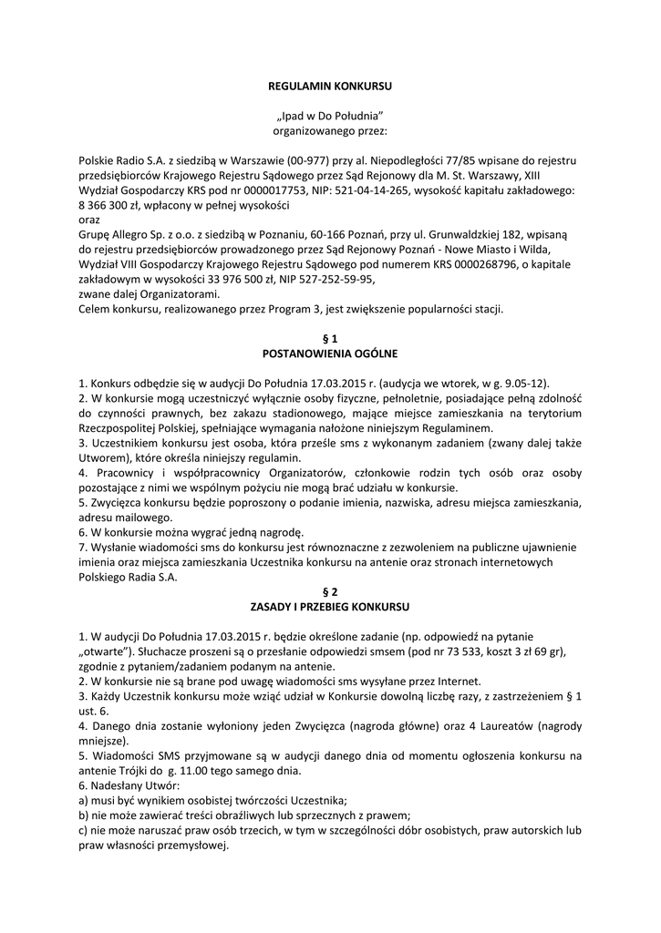 REGULAMIN KONKURSU „Ipad w Do Południa” organizowanego przez: Polskie Radio S.A. z siedzibą w Warszawie (00-977) przy al. Niepodległości 77/85 wpisane do rejestru przedsiębiorców Krajowego Rejestru Sądowego przez Sąd Rejonowy dla M. St. Warszawy, XIII Wydział Gospodarczy KRS pod nr 0000017753, NIP: 521-04-14-265, wysokość kapitału zakładowego: 8 366 300 zł, wpłacony w pełnej wysokości oraz Grupę Allegro Sp. z o.o. z siedzibą w Poznaniu, 60-166 Poznań, przy ul. Grunwaldzkiej 182, wpisaną do rejestru przedsiębiorców prowadzonego przez Sąd Rejonowy Poznań - Nowe Miasto i Wilda, Wydział VIII Gospodarczy Krajowego Rejestru Sądowego pod numerem KRS 0000268796, o kapitale zakładowym w wysokości 33 976 500 zł, NIP 527-252-59-95, zwane dalej Organizatorami. Celem konkursu, realizowanego przez Program 3, jest zwiększenie popularności stacji. §1 POSTANOWIENIA OGÓLNE 1. Konkurs odbędzie się w audycji Do Południa 17.03.2015 r. (audycja we wtorek, w g. 9.05-12). 2. W konkursie mogą uczestniczyć wyłącznie osoby fizyczne, pełnoletnie, posiadające pełną zdolność do czynności prawnych, bez zakazu stadionowego, mające miejsce zamieszkania na terytorium Rzeczpospolitej Polskiej, spełniające wymagania nałożone niniejszym Regulaminem. 3. Uczestnikiem konkursu jest osoba, która prześle sms z wykonanym zadaniem (zwany dalej także Utworem), które określa niniejszy regulamin. 4. Pracownicy i współpracownicy Organizatorów, członkowie rodzin tych osób oraz osoby pozostające z nimi we wspólnym pożyciu nie mogą brać udziału w konkursie. 5. Zwycięzca konkursu będzie poproszony o podanie imienia, nazwiska, adresu miejsca zamieszkania, adresu mailowego. 6. W konkursie można wygrać jedną nagrodę. 7. Wysłanie wiadomości sms do konkursu jest równoznaczne z zezwoleniem na publiczne ujawnienie imienia oraz miejsca zamieszkania Uczestnika konkursu na antenie oraz stronach internetowych Polskiego Radia S.A. §2 ZASADY I PRZEBIEG KONKURSU 1. W audycji Do Południa 17.03.2015 r. będzie określone zadanie (np. odpowiedź na pytanie „otwarte”). Słuchacze proszeni są o przesłanie odpowiedzi smsem (pod nr 73 533, koszt 3 zł 69 gr), zgodnie z pytaniem/zadaniem podanym na antenie. 2. W konkursie nie są brane pod uwagę wiadomości sms wysyłane przez Internet. 3. Każdy Uczestnik konkursu może wziąć udział w Konkursie dowolną liczbę razy, z zastrzeżeniem § 1 ust. 6. 4. Danego dnia zostanie wyłoniony jeden Zwycięzca (nagroda główne) oraz 4 Laureatów (nagrody mniejsze). 5. Wiadomości SMS przyjmowane są w audycji danego dnia od momentu ogłoszenia konkursu na antenie Trójki do g. 11.00 tego samego dnia. 6. Nadesłany Utwór: a) musi być wynikiem osobistej twórczości Uczestnika; b) nie może zawierać treści obraźliwych lub sprzecznych z prawem; c) nie może naruszać praw osób trzecich, w tym w szczególności dóbr osobistych, praw autorskich lub praw własności przemysłowej. 7. Zwycięzcą konkursu jest osoba, której tekst (wykonanie zadania) został najwyżej oceniony przez Jury konkursu, powołane przez Organizatorów. Dokonując oceny Jury weźmie pod uwagę oryginalność, pomysłowość, wartość artystyczną tekstu. Laureatami nagród mniejszych są 4 osoby, których tekst (wykonanie zadanie) został oceniony przez Jury konkursu jako wyróżniający się spośród nadesłanych odpowiedzi. Więcej o nagrodach w paragrafie 3 Regulaminu. 8. Imiona Zwycięzców wraz z miejscowością zostaną ogłoszone w audycji Do Południa dn. 17.03.2015. Imiona Laureatów zostaną ogłoszone w audycji Do Południa dn. 17.03.2015 albo na stronie internetowej Trójki. §3 NAGRODY 1. Nagrodą główną w konkursie jest Ipad Mini (z ekranem Retina) z e-bookiem o wartości 979 zł (słownie: dziewięćset siedemdziesiąt dziewięć złotych złotych) brutto. 2. Nagrodą mniejszą w konkursie jest zestaw złożony z: - e-booka Jacka Dukaja „Starość aksolotla” o wartości 20 zł (słownie: dwadzieścia) brutto - tuby z plakatem o wartości 330 zł (słownie: trzysta trzydzieści) brutto. W konkursie zostaną przyznane cztery nagrody mniejsze. 3. Nagrody nie podlegają wymianie na ekwiwalent pieniężny lub rzeczowy. 4. Zwycięzcy udostępnią Organizatorom swoje dokładne dane, które posłużą do przekazania nagrody w terminie 30 dni od momentu wygrania. 5. Nagroda główna jest objęta podatkiem od nagród. Płatnikiem podatku od nagród jest jeden z Organizatorów konkursu, Grupa Allegro. 6. Nagrody mniejsze nie są objęte podatkiem od wygranej. §4 DANE OSOBOWE 1. Administratorem danych osobowych przetwarzanych w związku z realizacją konkursu są Organizatorzy. 2. Dane osobowe przekazane Organizatorom przez Uczestników konkursu będą przetwarzane przez Organizatora wyłącznie w celu realizacji konkursu i doręczenia nagród. Podanie danych osobowych jest dobrowolne, jednak ich niepodanie uniemożliwia otrzymanie nagrody w konkursie. Każdy Uczestnik konkursu posiada prawo wglądu do swoich danych osobowych, do ich poprawiania oraz żądania ich usunięcia. Dane osobowe będą przetwarzane zgodnie z przepisami ustawy z dnia 29 sierpnia 1997 r. o ochronie danych osobowych (t.j.: Dz.U. z 2002r. Nr 101, poz. 926 z późn. zm.) na co każdy Uczestnik konkursu wyraża zgodę. §5 PRAWA AUTORSKIE 1. Uczestnik Konkursu oświadcza, że Utwór zgłoszony do konkursu został stworzony samodzielnie przez Uczestnika i jest wolny od praw i roszczeń osób trzecich, w tym dotyczących praw autorskich i pokrewnych oraz że ponosi wobec Organizatora odpowiedzialność z tego tytułu, zwalniając go z wszelkich roszczeń osób trzecich. 2. Z chwilą wysłania Utworu do konkursu Uczestnik udziela bez wynagrodzenia nieograniczonej czasowo i terytorialnie niewyłącznej licencji do korzystania z Utworu (licencja w zakresie autorskich praw majątkowych i praw pokrewnych) na następujących polach eksploatacji: a) utrwalanie i zwielokrotnianie