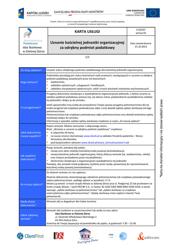 Projekt „Klient w centrum uwagi administracji” współfinansowany przez Unię Europejską w ramach Europejskiego Funduszu Społecznego Izba Skarbowa w Zielonej Górze KARTA USŁUGI K-SZJ/07 wersja 02 Uznanie kościelnej jednostki organizacyjnej za odrębny podmiot podatkowy Data zatwierdzenia: 21.10.2013 1/2 Co chcę załatwić? Uzyskać status odrębnego podmiotu podatkowego dla kościelnej jednostki organizacyjnej. Kogo dotyczy? Podmiotów posiadających status kościelnych osób prawnych, występujących o uznanie za odrębny podmiot podatkowy powołanych przez nie kościelnych: wydawnictw, zakładów wytwórczych, usługowych i handlowych, zakładów charytatywno-opiekuńczych, szkół i innych placówek oświatowo-wychowawczych. Przygotuj dokumenty świadczące o wyodrębnieniu organizacyjnym jednostki, o której uznanie za odrębny podmiot podatkowy wnosisz (np. jej własny statut, potwierdzenie wyodrębnienia siedziby tej jednostki) i dołącz je do wniosku. Co przygotować? Jakie dokumenty muszę wypełnić? Jeżeli upoważniłeś inną osobę do prowadzenia Twojej sprawy przygotuj pełnomocnictwo dla tej osoby (oryginał lub urzędowo poświadczony odpis ) oraz dowód zapłaty opłaty skarbowej od tego pełnomocnictwa. Pełnomocnictwo lub urzędowo poświadczony odpis pełnomocnictwa oraz dowód wniesienia opłaty skarbowej dołącz do wniosku. Informację o sposobie zapłaty opłaty skarbowej znajdziesz w części „Ile muszę zapłacić” Napisz wniosek. Możesz skorzystać z załączonego wzoru. Wzór „Wniosku o uznanie za odrębny podmiot podatkowy” znajdziesz: w załączniku do karty, na naszej stronie internetowej www.iskarb.pl w zakładce Poradnik podatnika – Wzory formularzy dla klientów, pod bezpośrednim adresem www.iskarb.pl/wzory_formularzy/wzor7.odt Pisząc wniosek, pamiętaj aby podać: Jak wypełnić dokumenty? nazwę oraz adres siedziby kościelnej osoby prawnej (wnioskodawcy), nazwę kościelnej jednostki organizacyjnej, której dotyczy wniosek (np. wydawnictwa, szkoły) oraz miejsce prowadzenia przez nią działalności, okoliczności świadczące o organizacyjnym wyodrębnieniu tej jednostki. Pamiętaj, aby wniosek został podpisany czytelnie przez osobę uprawnioną do reprezentowania kościelnej osoby prawnej (wnioskodawcy). Za złożenie wniosku nic nie zapłacisz. Ile muszę zapłacić? Kiedy złożyć dokumenty? Gdzie załatwię sprawę? Złożenie dokumentu stwierdzającego udzielenie pełnomocnictwa lub urzędowo poświadczonego odpisu pełnomocnictwa podlega opłacie w wysokości 17 zł. Możesz ją wnieść w kasie Urzędu Miasta w Zielonej Górze przy ul. Podgórnej 22 lub przelewem na konto Urzędu Miasta – bank PKO BP S.A., nr konta: 83 1020 5402 0000 0002 0248 5258, w tytule wpisując „opłata skarbowa za pełnomocnictwo” lub „opłata skarbowa za urzędowo uwierzytelniony odpis pełnomocnictwa”. Opłatę skarbową może zapłacić również Twój pełnomocnik. Wniosek złóż w dogodnym dla Ciebie terminie. Wniosek złóż osobiście w naszej kancelarii lub wyślij na nasz adres: Izba Skarbowa w Zielonej Górze ul. Generała Władysława Sikorskiego 2 65-454 Zielona Góra. Jesteśmy do Twojej dyspozycji od poniedziałku do piątku, w godzinach 7:30 – 15:30. Projekt „Klient w centrum uwagi administracji” współfinansowany przez Unię Europejską w ramach Europejskiego Funduszu Społecznego Izba Skarbowa w Zielonej Górze KARTA USŁUGI K-SZJ/07 wersja 02 Uznanie kościelnej jednostki organizacyjnej za odrębny podmiot podatkowy Data zatwierdzenia: 21.10.2013 2/2 Rozpatrzymy Twój wniosek i wydamy decyzję o: Co zrobi urząd? uznaniu wskazanej przez Ciebie jednostki organizacyjnej za odrębny podmiot podatkowy, odmowie uznania wskazanej przez Ciebie jednostki organizacyjnej za odrębny podmiot podatkowy. Decyzję doręczymy Tobie (lub jeżeli działasz przez pełnomocnika – Twojemu pełnomocnikowi). Wniosek załatwimy nie później niż w ciągu 1 miesiąca od dnia jego otrzymania. Jaki jest czas realizacji? Jak się odwołać? Informacje dodatkowe Podstawa prawna Termin może zostać przedłużony ze wskazaniem nowego terminu rozpatrzenia wniosku. O przedłużeniu powiadomimy Ciebie pisemnie, a jeżeli działasz przez pełnomocnika – Twojego pełnomocnika i wyznaczymy nowy termin na załatwienie Twojego wniosku. W terminie 14 dni kalendarzowych od dnia otrzymania decyzji możesz złożyć odwołanie do Dyrektora Izby Skarbowej w Zielonej Górze. Odwołanie możesz złożyć osobiście w naszej kancelarii lub przesłać na nasz adres. Masz prawo wglądu w akta sprawy, sporządzania z nich notatki, kopii lub odpisów. W celu uzyskania dodatkowych informacji możesz zadzwonić do nas pod nr telefonu 68 456 07 00. Ustawa z dnia 29 sierpnia 1997 r. Ordynacja podatkowa (Dz. U. z 2012 r. poz. 749 z późn. zm.); Ustawa z dnia 17 maja 1989 r. o stosunku Państwa do Kościoła Katolickiego w Rzeczypospolitej Polskiej (Dz. U. Nr 29, poz. 154 z późn. zm.); Ustawa z dnia 16 listopada 2006 r. o opłacie skarbowej (Dz. U. z 2012 r. poz. 1282 z późn. zm.); Rozporządzenie Ministra Finansów z dnia 28 września 2007 r. w sprawie zapłaty opłaty skarbowej (Dz. U. Nr 187, poz. 1330)