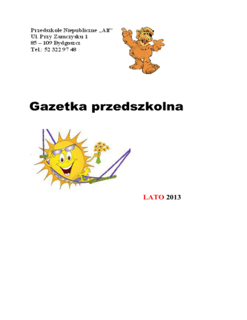 Gazetka przedszkolna LATO 2013 „Lato, lato, lato czeka…” Spotykamy się po raz ostatni w tym roku szkolnym 2012/2013 w naszej gazetce przedszkolnej. Przeżyliśmy wspólnie ten rok pełen wrażeń, pełen pracy i radosnej zabawy. Stajemy się o rok starsi i bogatsi o nowe doświadczenia. W niniejszym numerze gazetki- letnie zadania i tematy: o przyjaźni, o zasadach bezpieczeństwa na wakacjach, o tym, na co pozwolić, a czego zakazać na wakacjach naszym pociechom. Miłej lektury i zabawy. DZIECI NA WAKACJACH Wakacje to także czas zmian i nowych doświadczeń, które wywracają do góry nogami ustalony porządek. Na co można pozwolić malcowi podczas wakacji, a na co nie zgadzać się w żadnych okolicznościach? Pani dr Małgorzata Czyżewska – pediatra – odpowiada: Czy podczas wakacji przedszkolak może... …siedzieć w wodzie tak długo, aż będzie siny? Nie można dopuszczać do takiego wychłodzenia. Niebieskawe usta i sina skóra świadczą o tym, że mocno obkurczyły się naczynia obwodowe (w ten sposób organizm broni się przed utratą ciepła) i skóra jest niedotleniona. W takiej sytuacji łatwiej o skurcz, co jest niebezpieczne, poza tym malec może się przeziębić. Lepiej żeby się kąpał częściej, ale krócej. Gdy z niej wyjdzie, powinien się wytrzeć i rozgrzać. …pić colę? Słyszałam, że chroni ona przed biegunką. Cola jest słodka i zawiera kofeinę, więc przedszkolaki w ogóle nie powinny jej pić. Rzeczywiście pomaga przy biegunce, bo hamuje nadmierne ruchy robaczkowe jelit, ale przecież jest wiele leków, które robią to lepiej. Jeśli już musimy w ten sposób leczyć dziecko, możemy ją podać, ale tylko wtedy, gdy już coś się dzieje. Cola powinna być odgazowana, by bąbelki nie drażniły przewodu pokarmowego. Najlepiej jednak skontaktować się z lekarzem: maluchy chorują gwałtownie, a w gorącym klimacie choroba może przebiegać szczególnie ciężko. …jeść owoce prosto z krzaka? Nie powinien, ale i tak pewnie będzie to robił. Pół biedy, jeśli zje kilka porze-czek z niepryskanego krzaka w ogródku babci, jednak nie można pozwalać na jedzenie znalezionych w lesie nieumytych jagód. Można zarazić się niebezpieczną chorobą – bąblowicą. Powoduje ją tasiemiec, którego jaja mogą być w kale zarażonych lisów czy psów. Jagody trzeba oczywiście myć także wtedy, gdy się je kupuje na straganie. Pozostałe owoce także, bo poza zwykłym brudem mogą być na nich resztki środków ochrony roślin itd. …chodzić spać o północy? Raczej nie powinien, choć oczywiście nie będzie tragedii, jeśli to się zdarzy raz czy dwa, czy nawet siedem razy. Chodzi o to, żeby nie weszło mu to w nawyk, bo po powrocie trudno będzie przywrócić właściwy rytm. Poza tym wakacje są przecież po to, by odpocząć (a więc i wyspać się, a nie zmęczyć). …urządzać sobie dzień (albo nawet kilka dni), brudasa? Jeśli to zniesiesz, dziecko może mieć brudne uszy, szyję, na której da się zasiać rzeżuchę, a nawet wąsy z czekolady i stopy brudniejsze niż Pippi Langstrumpf, ale w żadnych okolicznościach nie można mu odpuścić mycia rąk! Brudne ręce to gotowe kłopoty. Za ich pośrednictwem można złapać paskudne choróbska, od żółtaczki pokarmowej po choroby wywołane przez pasożyty, które mogą być np. w piasku. Malec powinien myć je kilka razy dziennie, bezwzględnie po wyjściu z toalety i przed jedzeniem. I powinien robić to porządnie, mydłem, a nie tylko zmoczyć i wytrzeć. Przynajmniej raz dziennie trzeba także umyć miejsca intymne. …żywić się głównie goframi i lodami? Nie. Maluch nie może żywić się wyłącznie w ten sposób. Jedzenie tego typu jest bezwartościowe, kaloryczne i w nadmiarze może być szkodliwe. Poza tym łatwo się do niego przyzwyczaić. Najlepiej ustalić z dzieckiem zasady dotyczące jedzenia tego typu smakołyków. Zasada nr 1: „Albo gofry, albo lody (a nie i to, i to)”. Zasada nr 2: „Frytki nie zastępują obiadu, a słodka bułka kolacji”. Itd. …jeść ryby ze smażalni? Tak, byle nie w takiej, w której śmierdzi starym olejem (jest szkodliwy, a poza tym skoro właściciele oszczędzają na oleju, można założyć, że nie kupują także środków czystości). Przedszkolak może jeść ryby pod każdą postacią, a więc także smażone. Lepsze są jednak pieczone albo z grilla. …darować sobie obiad? Oczywiście. Zamiast obiadu możecie zjeść obiadokolację (dziecko powinno do niej zasiąść najpóźniej dwie godziny przed snem). Malec nie może jednak biegać przez cały dzień z pustym brzuchem (poza tym po kąpieli w chłodnym morzu będzie mieć ochotę na coś kalorycznego), warto więc zabrać ze sobą coś, co się nie psuje, jest sycące, np. kanapki, owoce, herbatniki, wafle ryżowe i inne zdrowe przekąski. Warto wziąć ze sobą także niegazowaną wodę mineralną. …jeść wyłącznie kanapki, zupy w proszku i kiełbaski z ogniska? Dzieci w ogóle nie powinny jeść zupek w proszku (zawierają glutaminian sodu, sól i niewiele więcej). Kanapki są OK, jednak przedszkolak powinien jeść także coś na ciepło. Pieczone kiełbaski mu nie zaszkodzą, ale nie można żywić go wyłącznie nimi – są ciężkostrawne. Jeśli na polu namiotowym jest kuchnia, możesz przygotowywać posiłki niemal takie jak w domu. Jeśli nie ma, weź ze sobą kuchenkę z butlą i przygotuj coś prostego i smacznego sama. Już się zbliża lato, czas radości, słońca, wielu przygód i zabaw bez końca! Jednak w czasie zabaw musicie przestrzegać zasad bezpieczeństwa! Właściwie przygotowane dzieci do opalania, gdy słoneczko świeci, noszą czapki, chustki, chronią swoje głowy. Kremy z filtrem stosują, swoje ciało nim smarują. W czasie letniego wypoczywania pamiętajcie o zasadach bezpiecznego zachowania!!! W miejscach strzeżonych się kąpiemy, ale tylko wtedy, gdy dorosły ci pozwoli. Nigdy nie skacz na główkę do wody, b