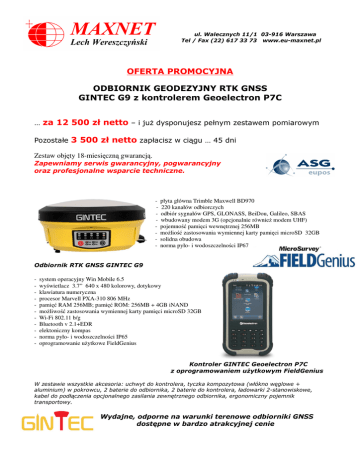 ul. Walecznych 11/1 03-916 Warszawa Tel / Fax (22) 617 33 73 www.eu-maxnet.pl OFERTA PROMOCYJNA ODBIORNIK GEODEZYJNY RTK GNSS GINTEC G9 z kontrolerem Geoelectron P7C … za 12 500 zł netto – i już dysponujesz pełnym zestawem pomiarowym Pozostałe 3 500 zł netto zapłacisz w ciągu … 45 dni Zestaw objęty 18-miesięczną gwarancją. Zapewniamy serwis gwarancyjny, pogwarancyjny oraz profesjonalne wsparcie techniczne. - 220 kanałów odbiorczych - płyta główna Trimble Maxwell BD970 220 kanałów odbiorczych odbiór sygnałów GPS, GLONASS, BeiDou, Galileo, SBAS wbudowany modem 3G (opcjonalnie również modem UHF) pojemność pamięci wewnętrznej 256MB możliość zastosowania wymiennej karty pamięci microSD 32GB solidna obudowa norma pyło- i wodoszczelności IP67 Odbiornik RTK GNSS GINTEC G9 - system operacyjny Win Mobile 6.5 wyświetlacz 3.7” 640 x 480 kolorowy, dotykowy klawiatura numeryczna procesor Marvell PXA-310 806 MHz pamięć RAM 256MB; pamięć ROM: 256MB + 4GB iNAND możliwość zastosowania wymiennej karty pamięci microSD 32GB Wi-Fi 802.11 b/g Bluetooth v 2.1+EDR elektoniczny kompas norma pyło- i wodoszczelności IP65 oprogramowanie użytkowe FieldGenius Kontroler GINTEC Geoelectron P7C z oprogramowaniem użytkowym FieldGenius W zestawie wszystkie akcesoria: uchwyt do kontrolera, tyczka kompozytowa (włókno węglowe + aluminium) w pokrowcu, 2 baterie do odbiornika, 2 baterie do kontrolera, ładowarki 2-stanowiskowe, kabel do podłączenia opcjonalnego zasilania zewnętrznego odbiornika, ergonomiczny pojemnik transportowy. Wydajne, odporne na warunki terenowe odbiorniki GNSS dostępne w bardzo atrakcyjnej cenie