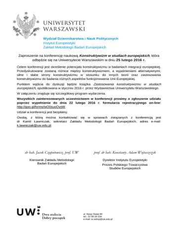 Wydział Dziennikarstwa i Nauk Politycznych Instytut Europeistyki Zakład Metodologii Badań Europejskich Zaproszenie na konferencję naukową Konstruktywizm w studiach europejskich, która odbędzie się na Uniwersytecie Warszawskim w dniu 25 lutego 2016 r. Celem konferencji jest określenie potencjału konstruktywizmu w badaniach integracji europejskiej. Przedyskutowane zostaną różnice między konstruktywizmem, a wyjaśnieniami alternatywnymi, silne i słabe strony konstruktywizmu w stosunku do innych teorii oraz zastosowania konstruktywizmu do badania różnych aspektów funkcjonowania Unii Europejskiej. Punktem wyjścia do dyskusji będzie książka Zastosowania konstruktywizmu w studiach europejskich, opublikowana w styczniu 2016 r. przez Wydawnictwa Uniwersytetu Warszawskiego. W załączeniu znajduje się szczegółowy program wydarzenia. Wszystkich zainteresowanych uczestnictwem w konferencji prosimy o zgłoszenie udziału poprzez wypełnienie do dnia 22 lutego 2016 r. formularza rejestracyjnego on-line: http://goo.gl/forms/wO0suoOysW. Udział w konferencji jest bezpłatny. Osobą, z którą można kontaktować się w sprawach związanych z konferencją jest dr Kamil Ławniczak, sekretarz Zakładu Metodologii Badań Europejskich, adres e-mail: [email protected]. dr hab. Jacek Czaputowicz, prof. UW prof. dr hab. Konstanty Adam Wojtaszczyk Kierownik Zakładu Metodologii Badań Europejskich Dyrektor Instytutu Europeistyki Prezes Polskiego Towarzystwa Studiów Europejskich ul. Nowy Świat 69 tel.: 22 55 20 234 e-mail: [email protected] Współorganizatorzy: DEGREE - the American College of Greece Doctoral School of Political Science, Public Policy and International Relations, Central European University Technische Universität Chemnitz, Philosophische Fakultät, Europäische Studien Kultur- und Länderstudien Ostmitteleuropas, Gastdozentur – EU Governance Studies Polskie Towarzystwo Studiów Europejskich Instytut Politologii Uniwersytetu Kardynała Stefana Wyszyńskiego Instytut Politologii Uniwersytetu Opolskiego Instytut Nauk Politycznych i Bezpieczeństwa Akademii im. Jana Długosza w Częstochowie Miejsce obrad: Sala Balowa w Pałacu Tyszkiewiczów-Potockich w Kampusie Centralnym UW (ul. Krakowskie Przedmieście 32). Budynek jest oznaczony numerem 13 na dostępnej w Internecie mapie kampusu. Program ramowy konferencji: 9:009:30 Rejestracja uczestników 9:45-10.00 Otwarcie konferencji prof. dr hab. Konstanty Adam Wojtaszczyk, dyrektor Instytutu Europeistyki UW, prezes Polskiego Towarzystwa Studiów Europejskich dr hab. Jacek Czaputowicz, prof. UW, kierownik Zakładu Metodologii Badań Europejskich Wykład wprowadzający 10.00-10.30 Podejścia konstruktywistyczne i interpretatywistyczne w badaniach integracji europejskiej na przykładzie unijnej polityki zagranicznej i bezpieczeństwa Prof. Xymena Kurowska, Central European University 10.30–12.00 Sesja 1. Konstruktywizm na tle innych teorii stosunków międzynarodowych i integracji europejskiej Moderator: prof. dr hab. Józef Fiszer, ISP PAN dr hab. Jacek Czaputowicz, prof. UW dr hab. Rafał Riedel, prof. UO dr hab. Paweł Borkowski, UW dr Anna Skolimowska, UKSW dr Marcin Kleinowski, UMK Dyskusja ul. Nowy Świat 69 tel.: 22 55 20 234 e-mail: [email protected] Przerwa kawowa 12.00–12.30 12.30–14.00 Sesja 2. Badanie tożsamości europejskiej Moderator: dr hab. Jacek Czaputowicz, prof. UW dr Anna Visvizi, DEGREE - the American College of Greece dr hab. Jerzy Sielski, prof. AJKC dr Elena Kucheryavaya, niezależna badaczka dr Michał Gierycz, UKSW mgr Marta Makowska, doktorantka UW Dyskusja Przerwa na posiłek 14.00–15.00 15.00–17.00 Sesja 3. Zastosowania konstruktywizmu w analizie funkcjonowania UE Moderator: dr hab. Marta Witkowska, UW dr hab. Tomasz G. Grosse, prof. UW dr Adam Jaskulski, UAM dr Adam Kirpsza, UJ dr Jarosław Sadłocha UWr dr Filip Tereszkiewicz, UO dr Kamil Ławniczak, UW Dyskusja ul. Nowy Świat 69 tel.: 22 55 20 234 e-mail: [email protected]